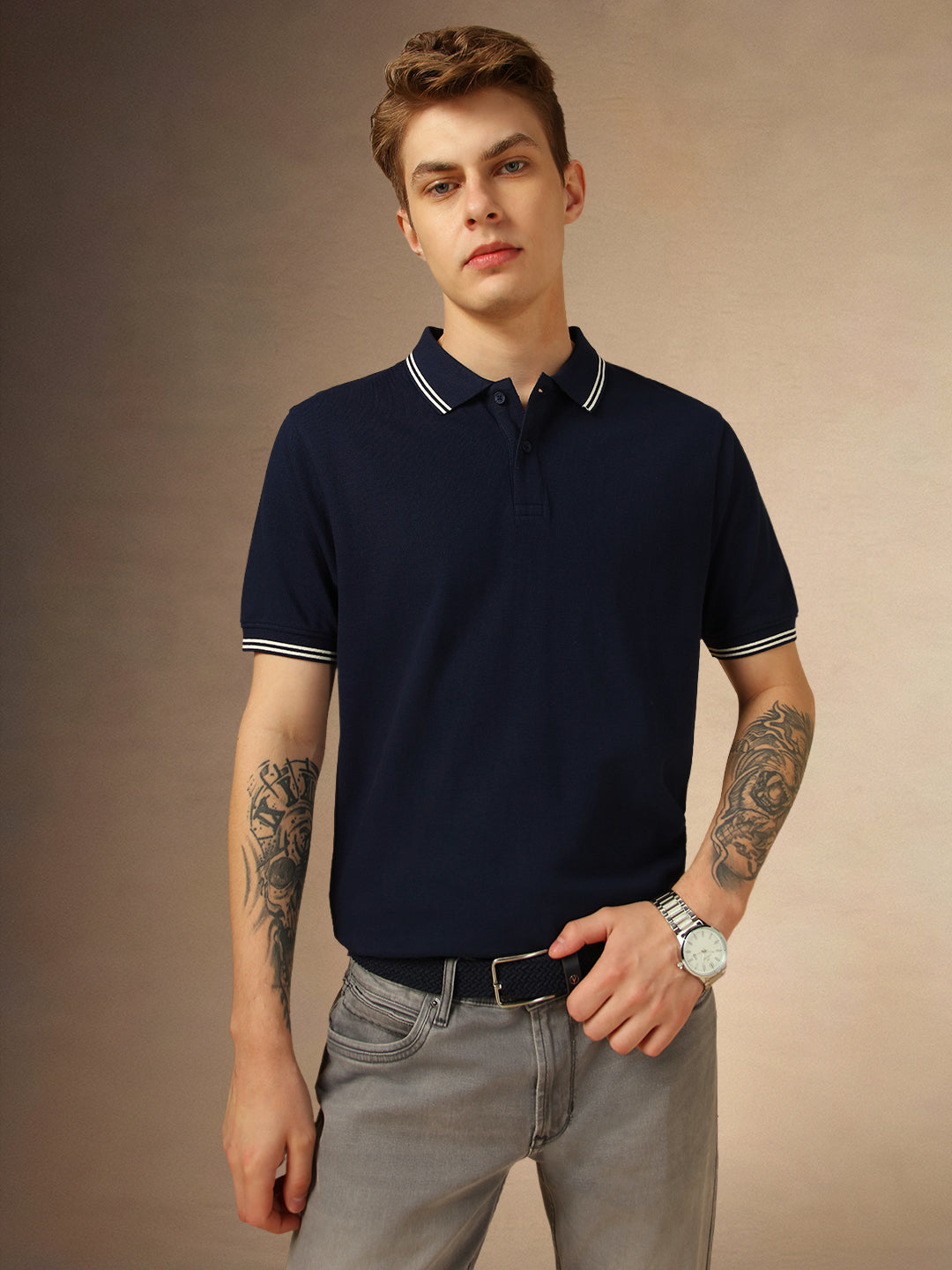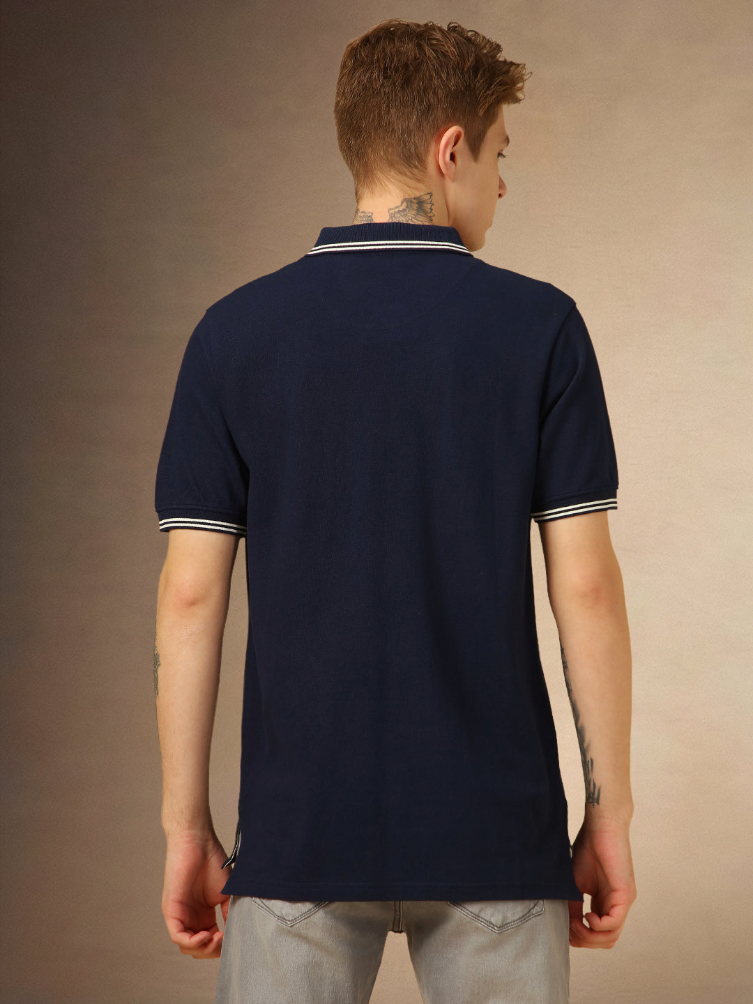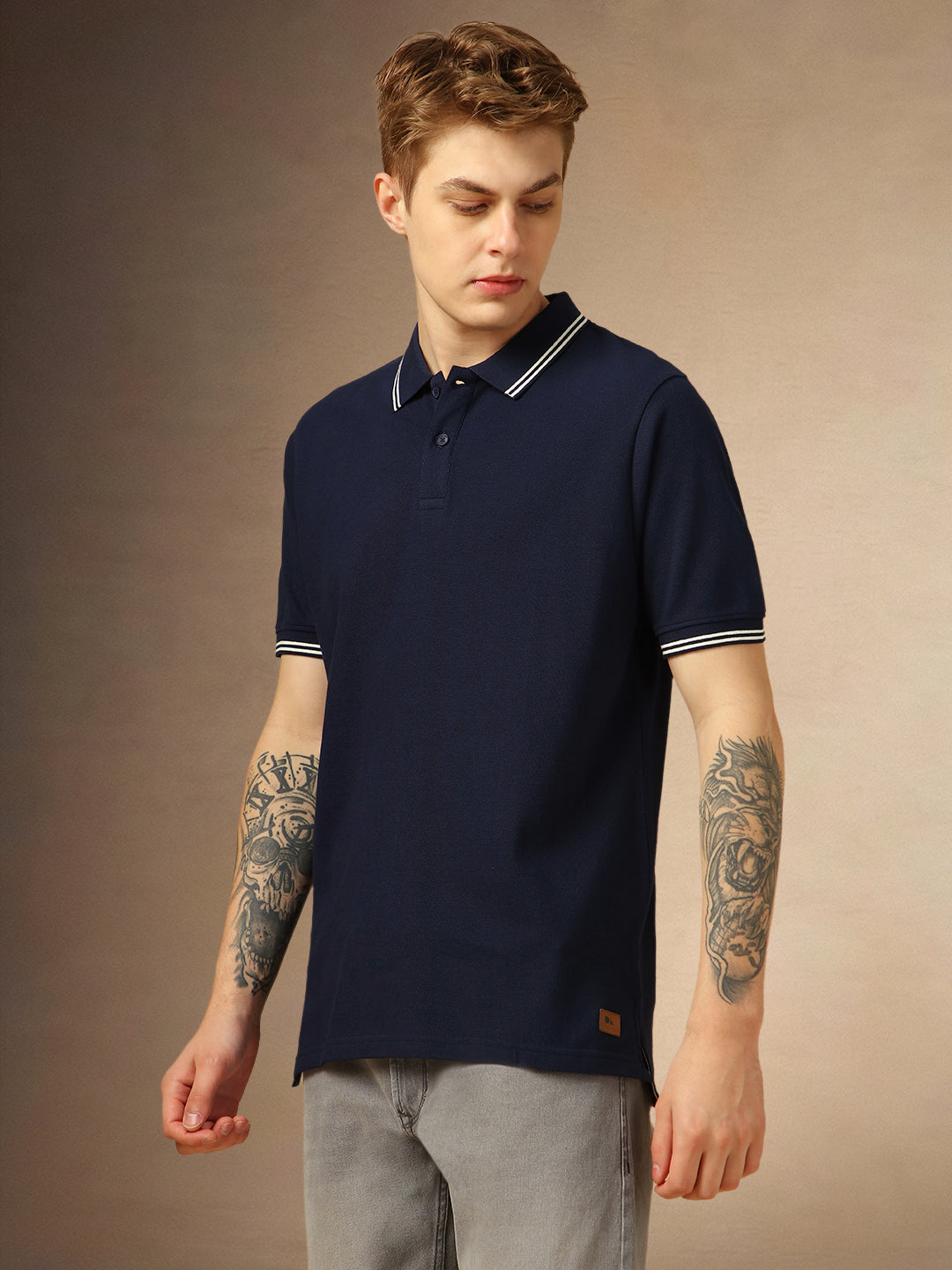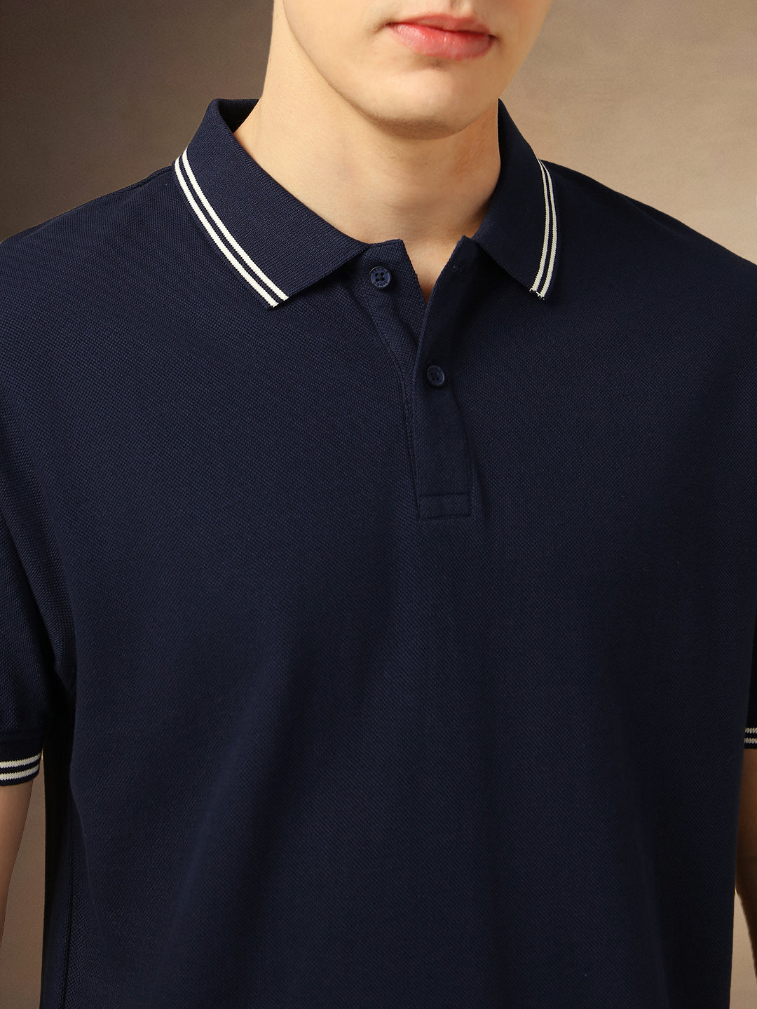 Men's Navy Solid Polo Collar Half Sleeves T-shirt