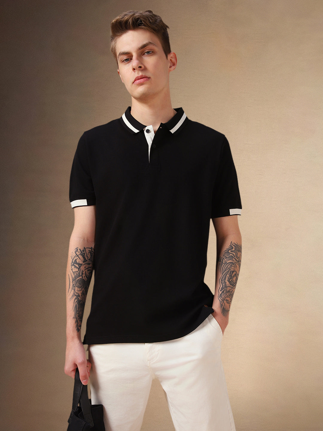 Men's Black Solid Polo Collar Half Sleeves T-shirt