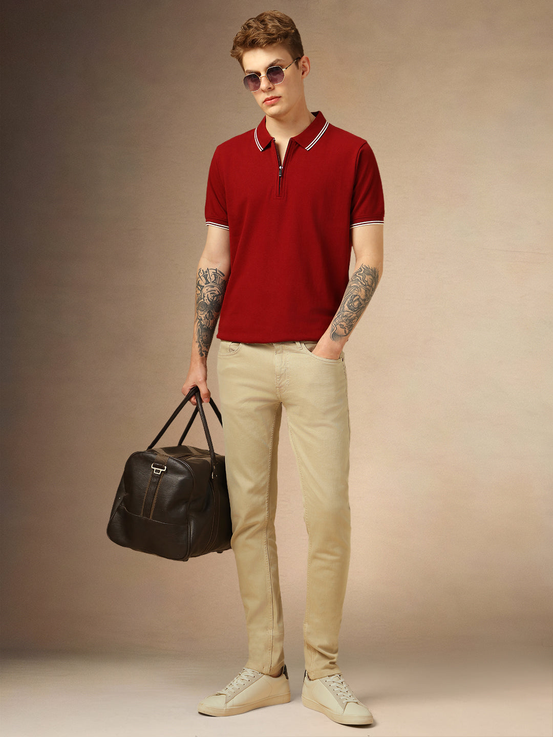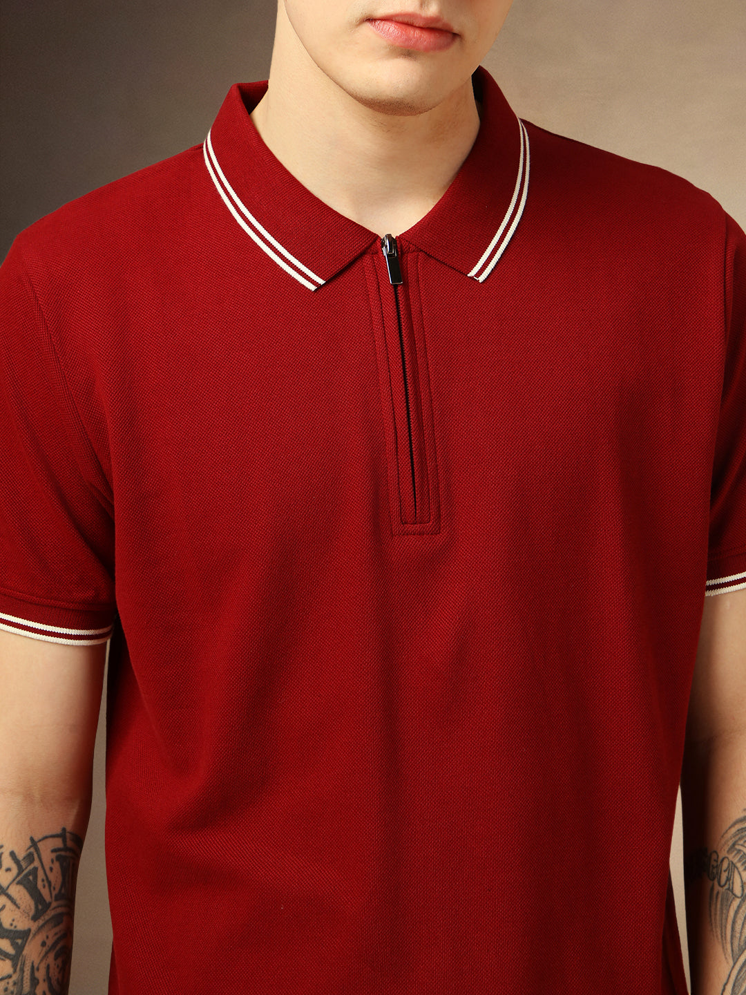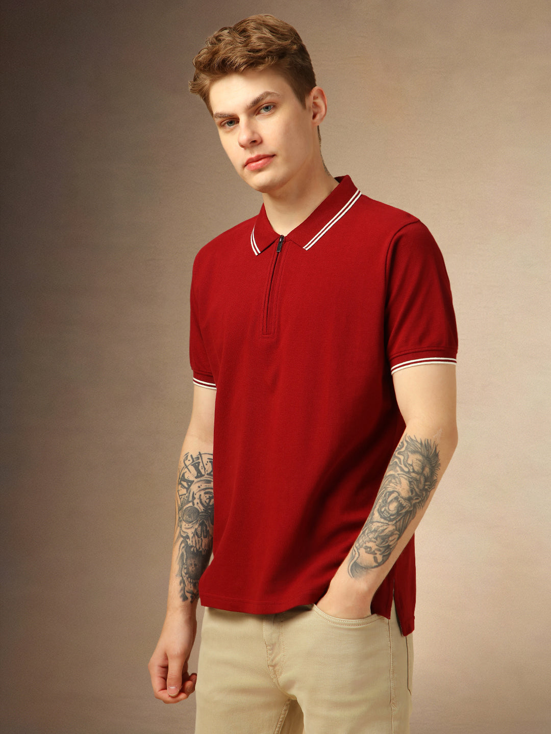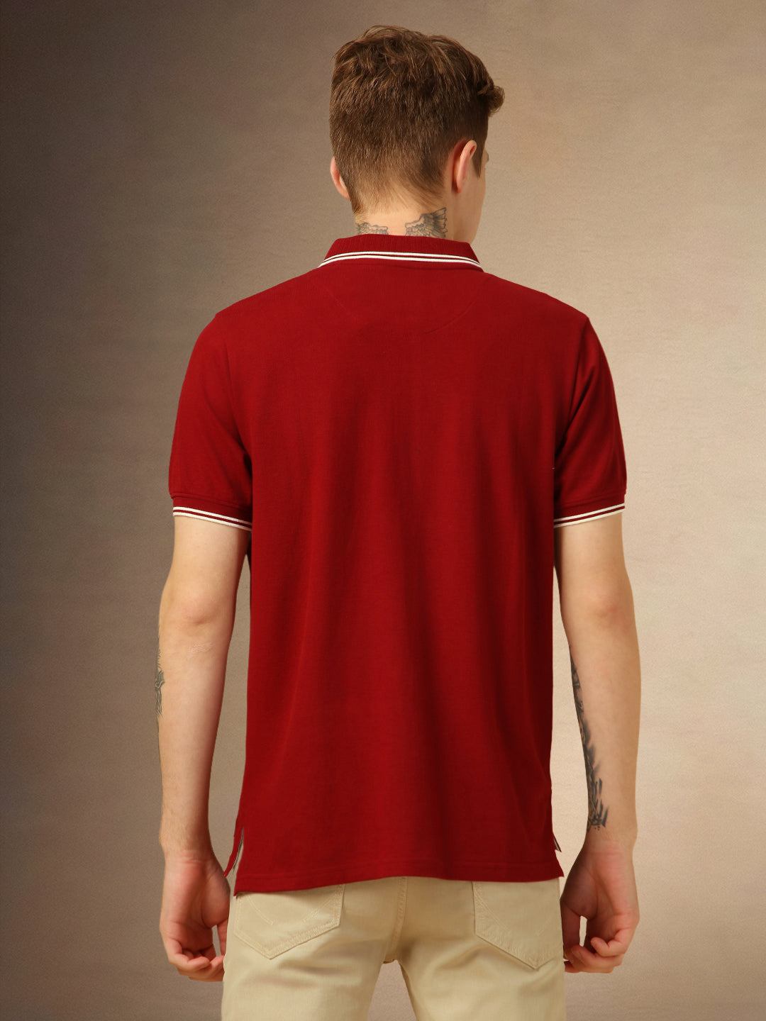 Men's Maroon Solid Polo Collar Half Sleeves T-shirt