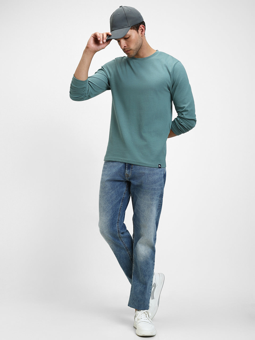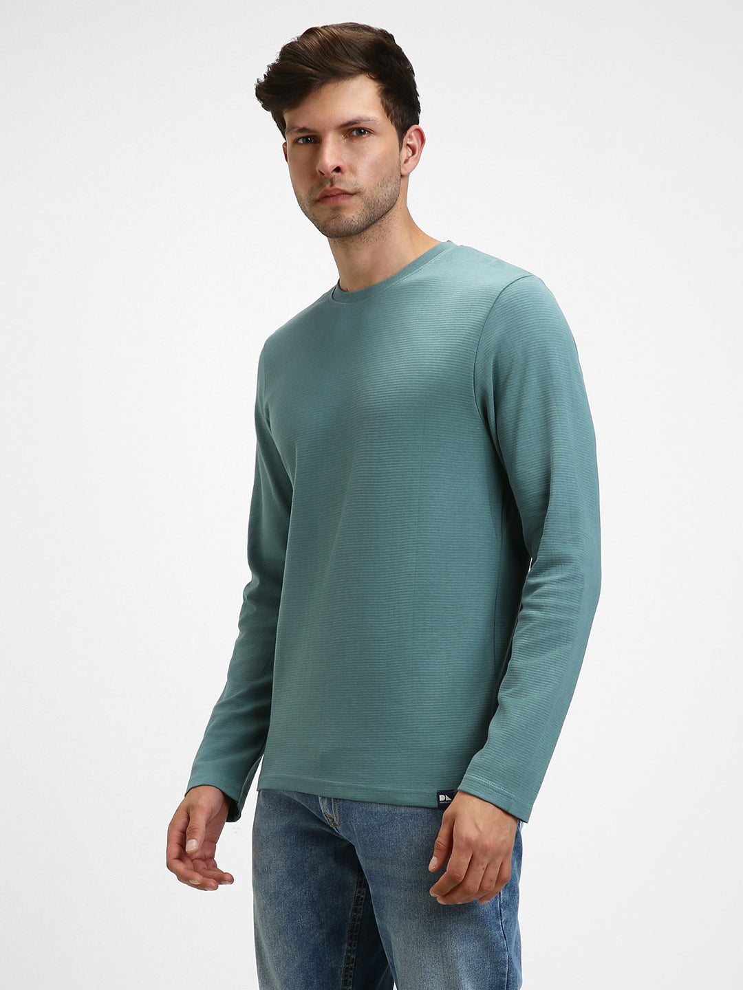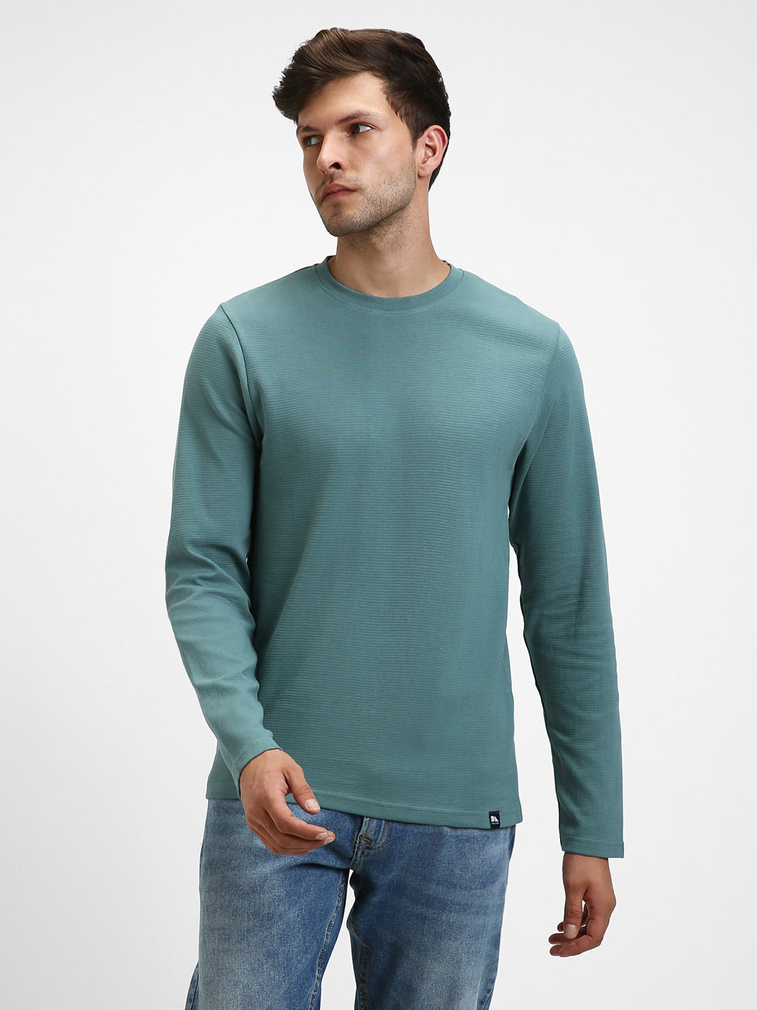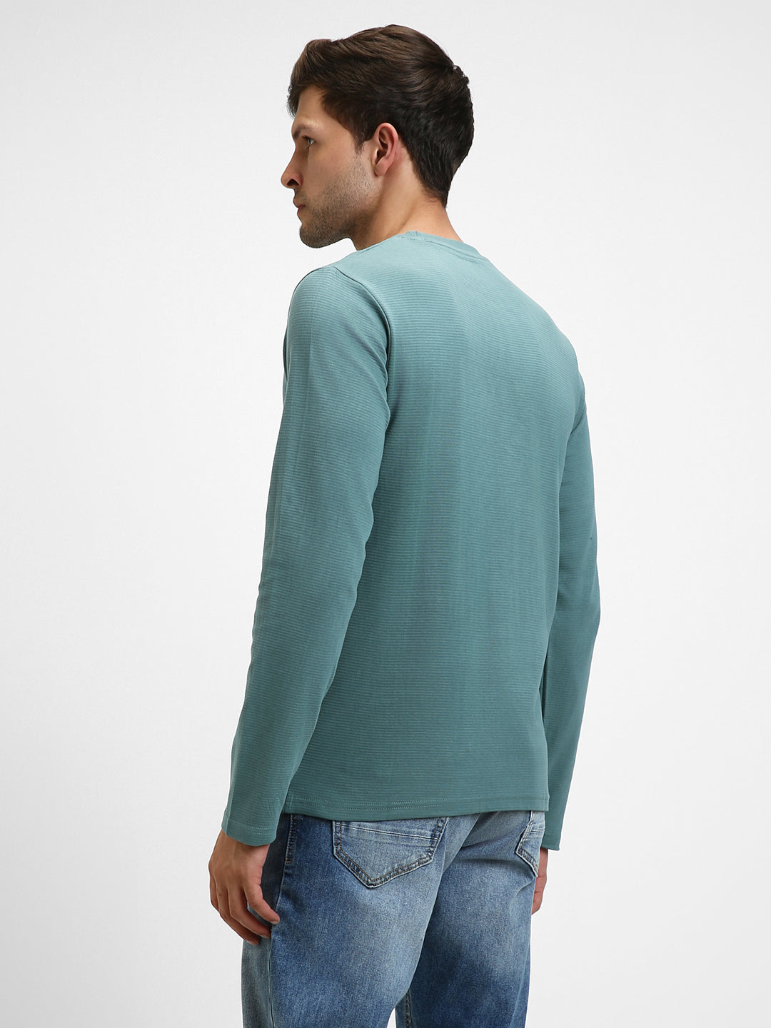 Men's Sea Blue Round Neck Long - Sleeves Casual T-Shirt