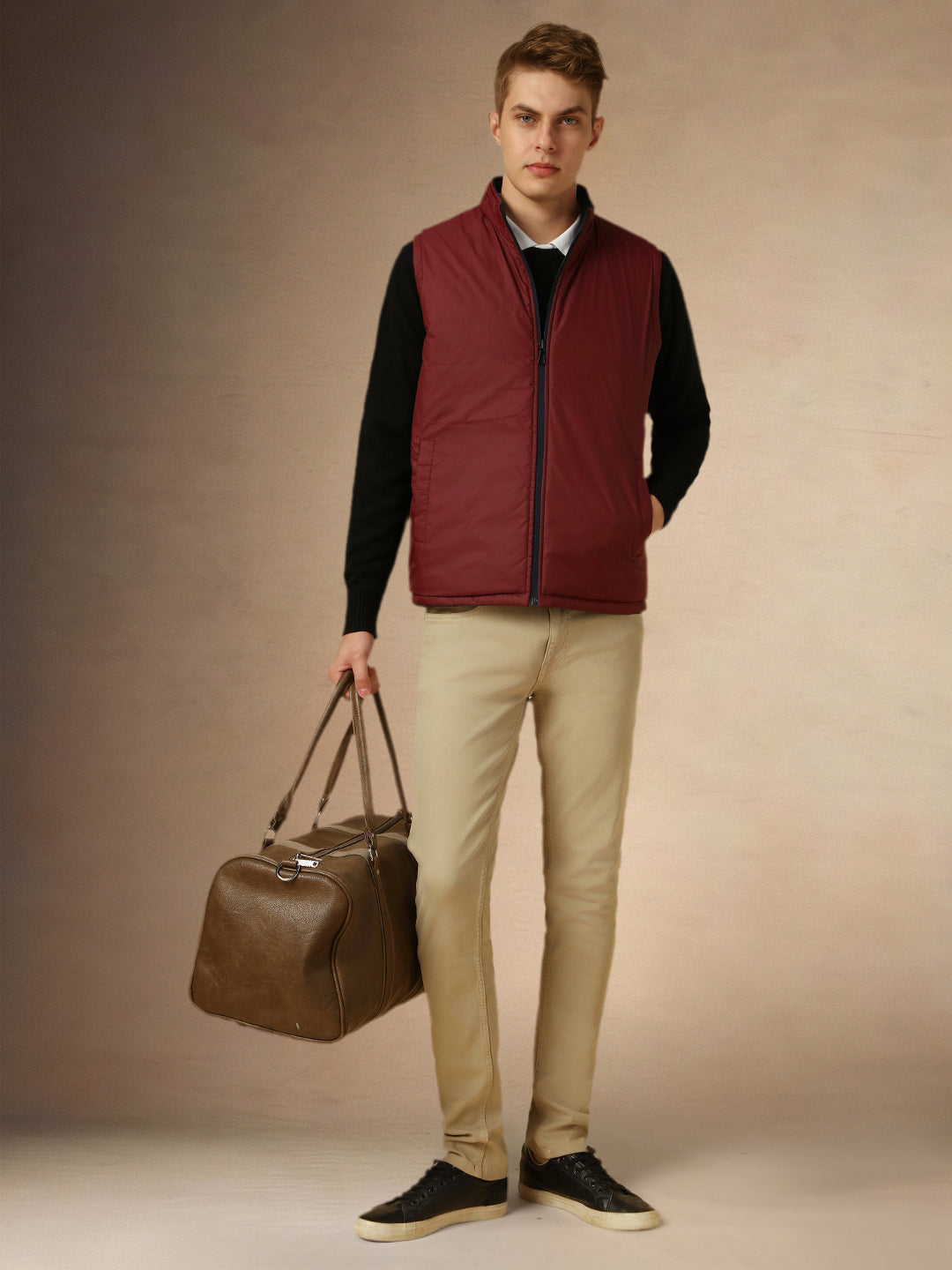 Men's Wine Solid Mock Neck Full Sleeves Reversible Puffer Jacket