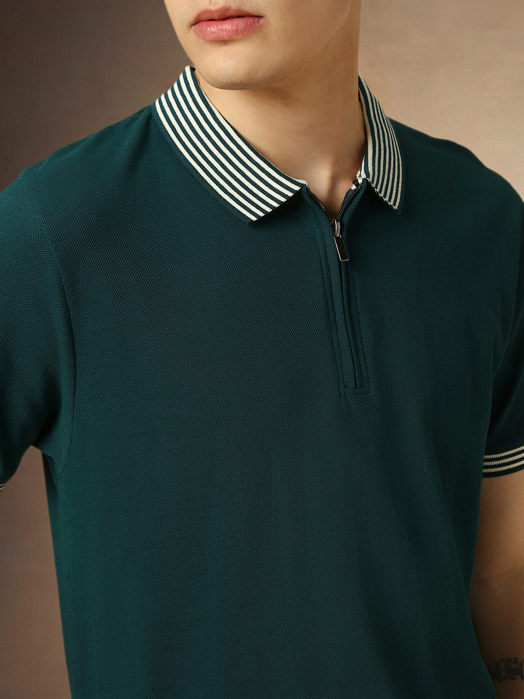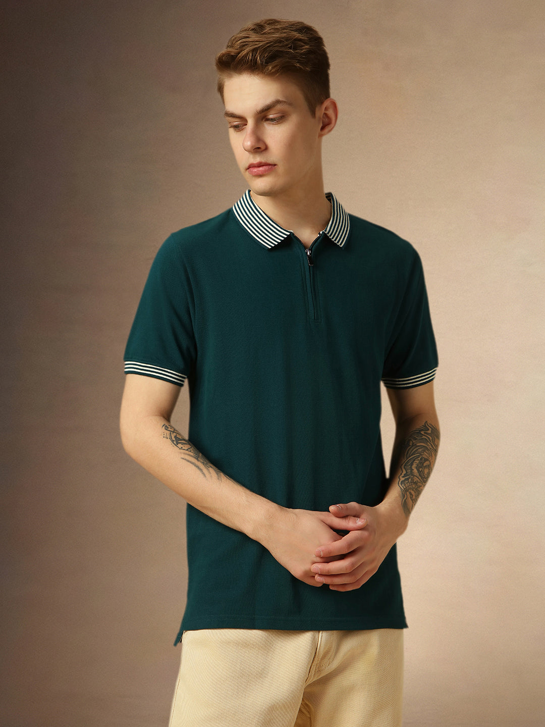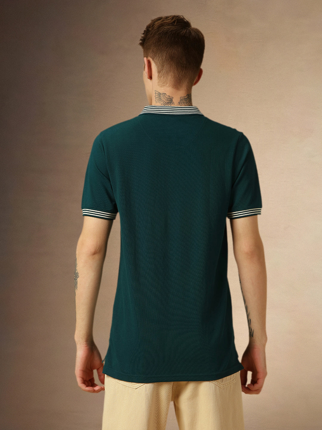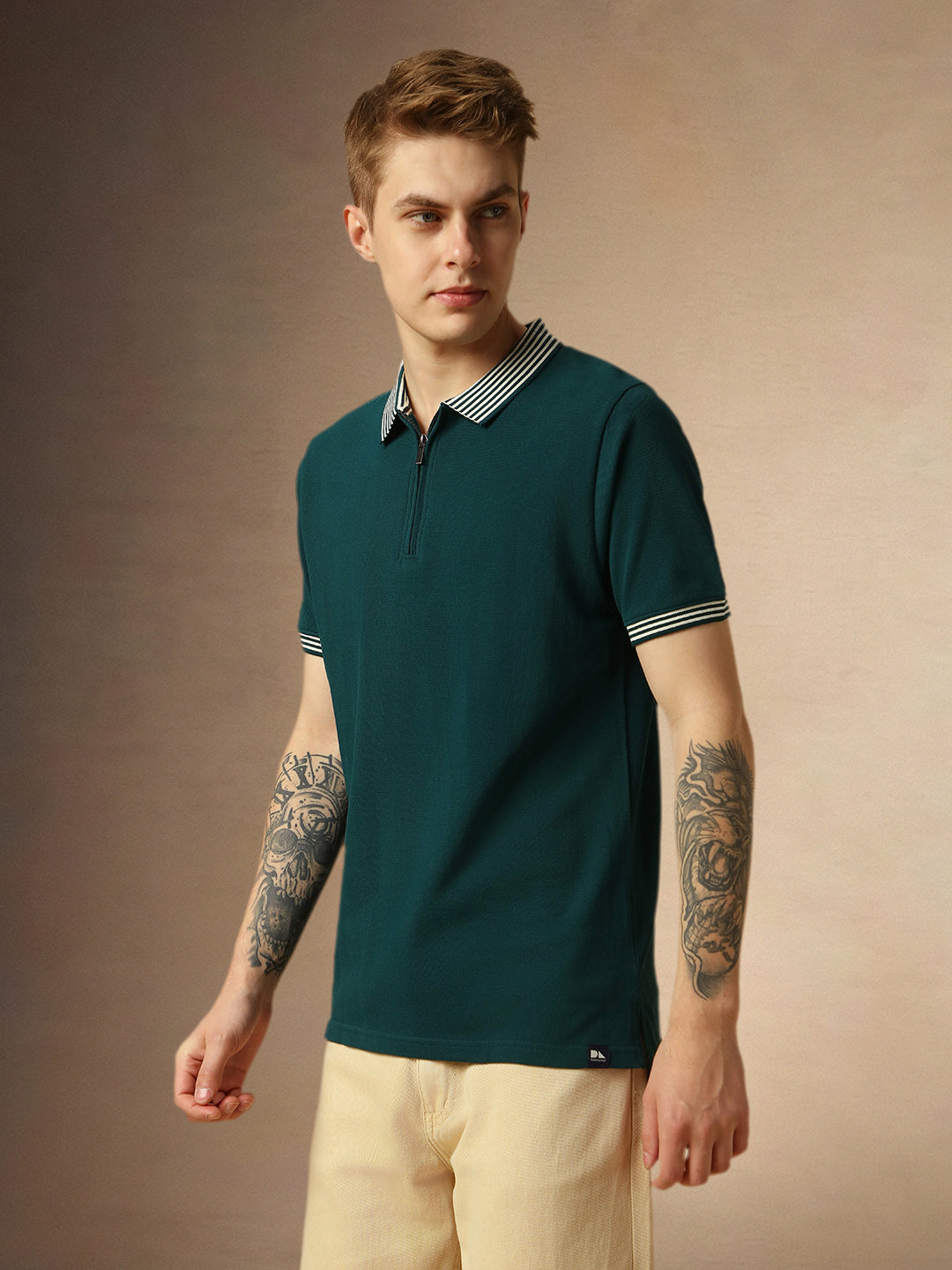 Men's Deep Teal Solid Polo Collar Half Sleeves Regular Fit T-Shirt