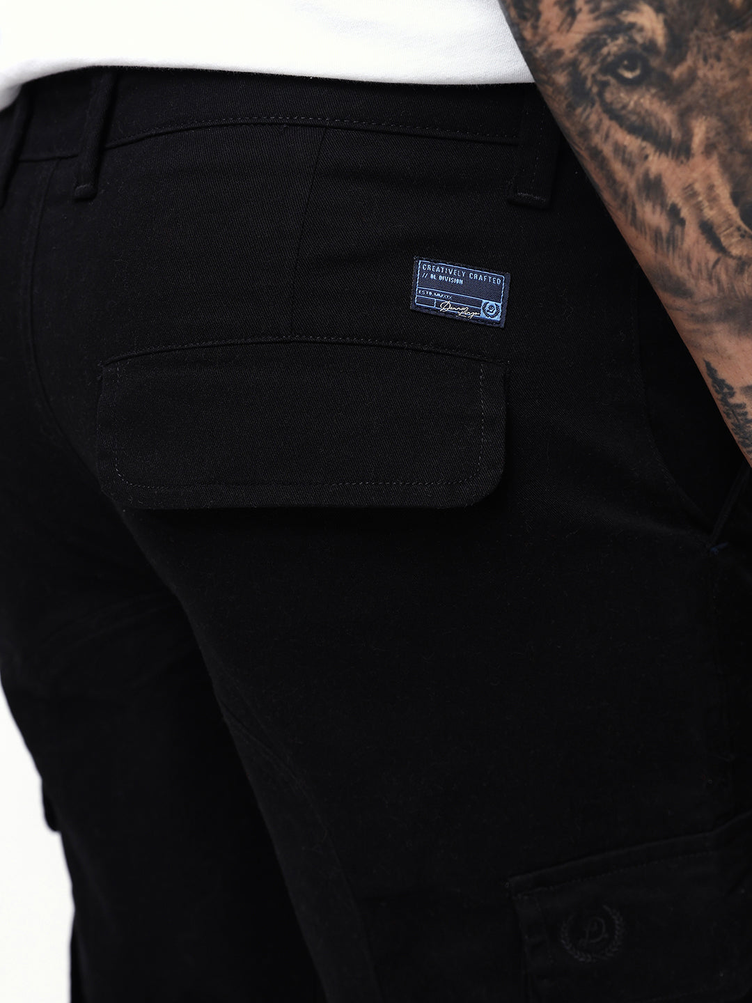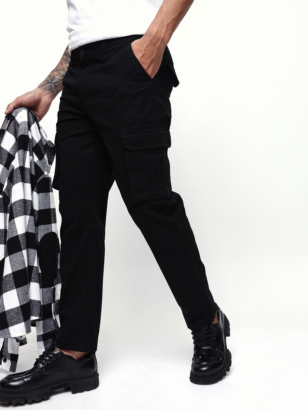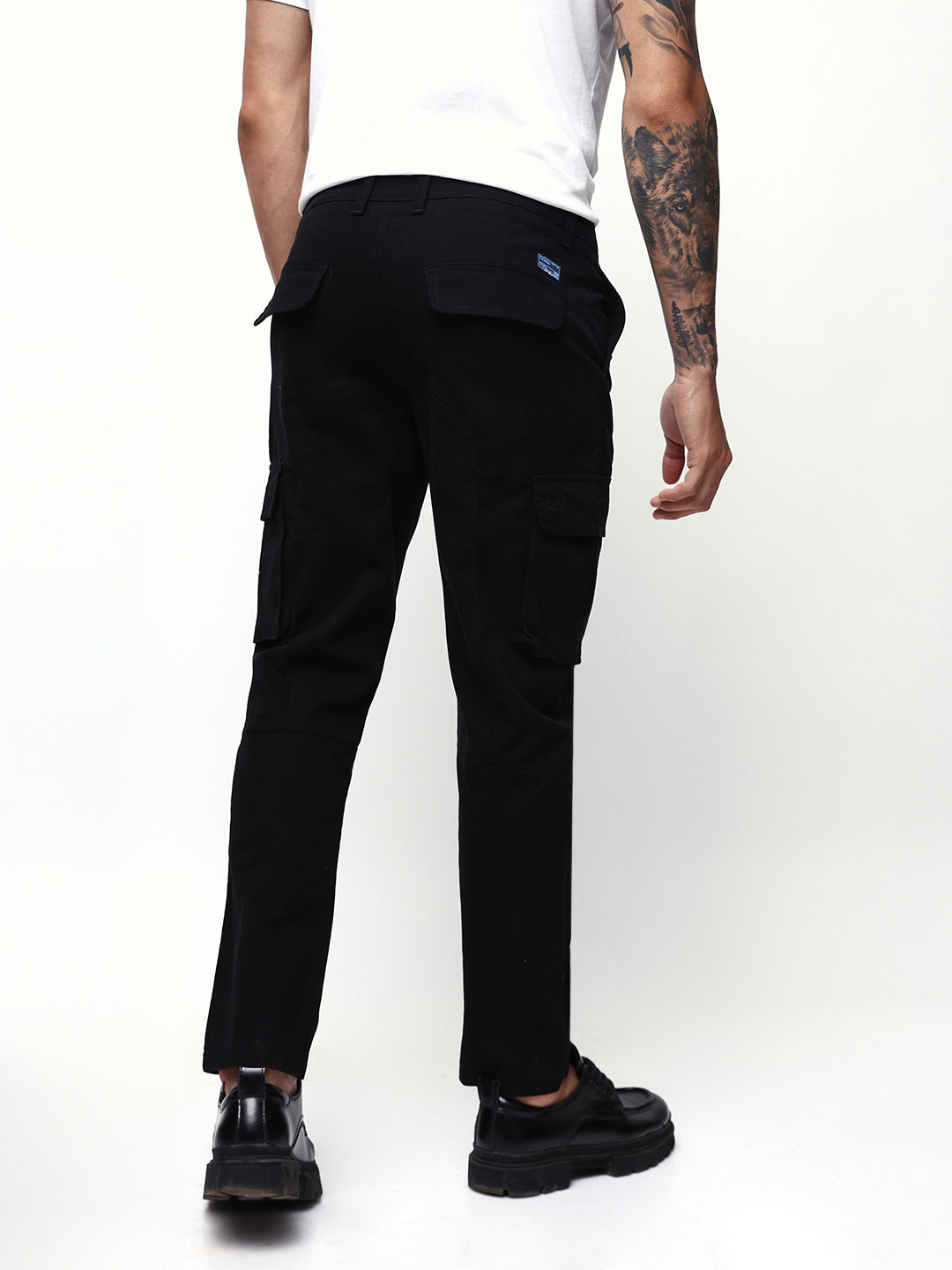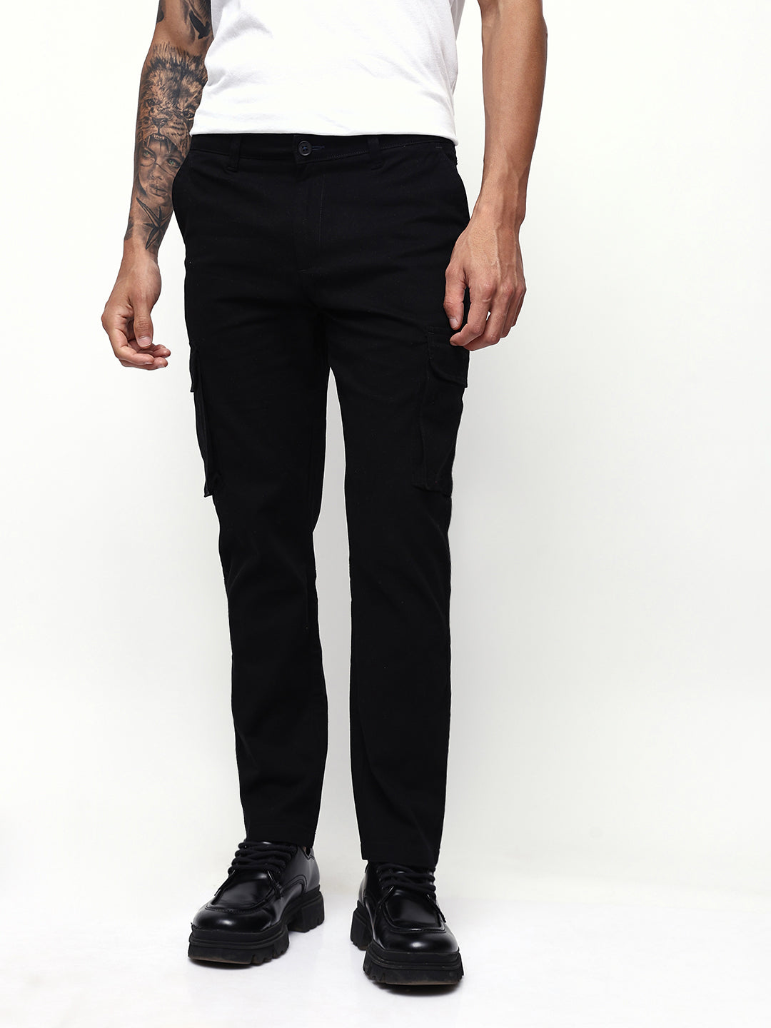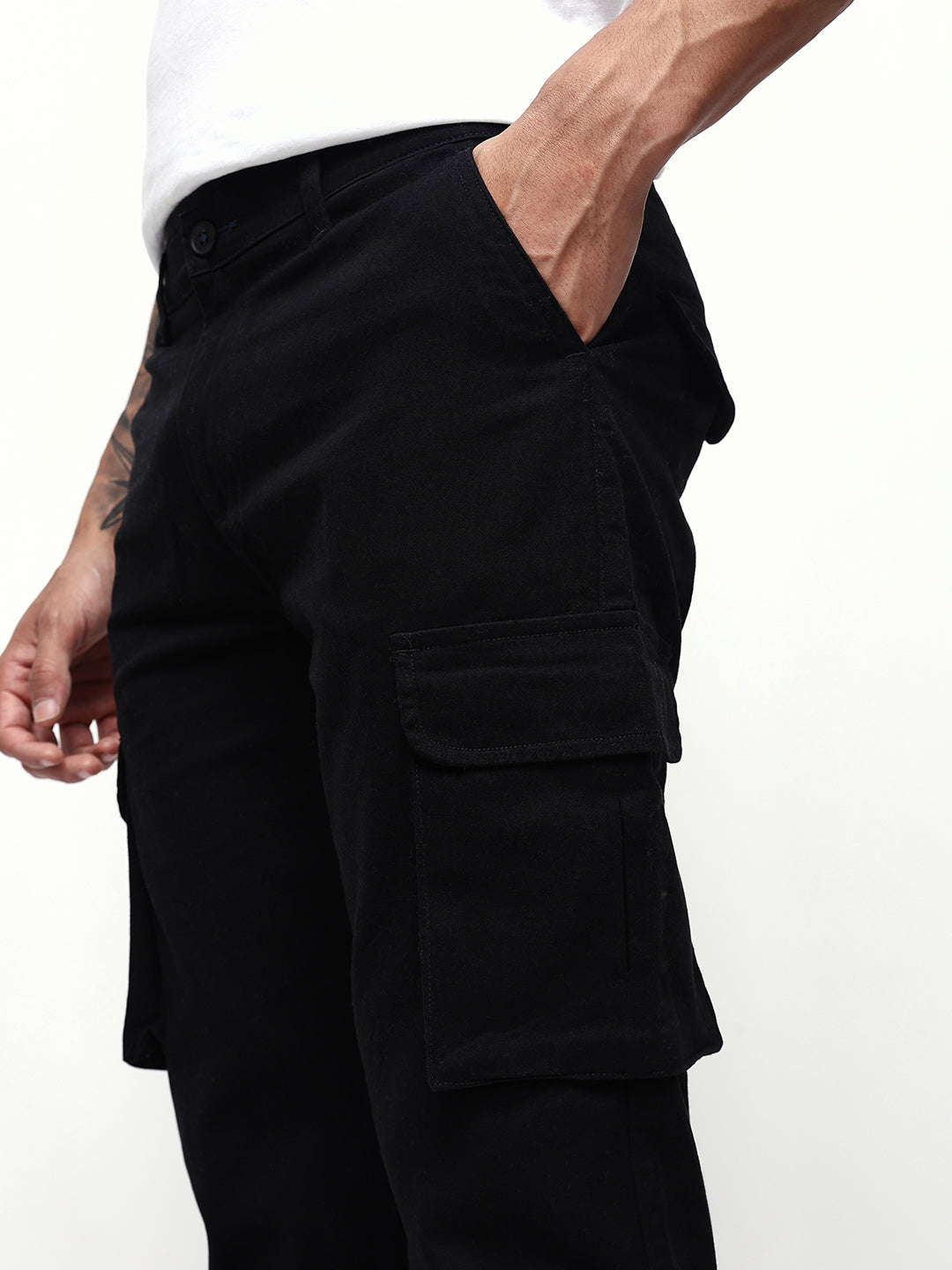 Men's Balck Solid Cotton Relaxed Fit Mid-Rise Cargo Trousers