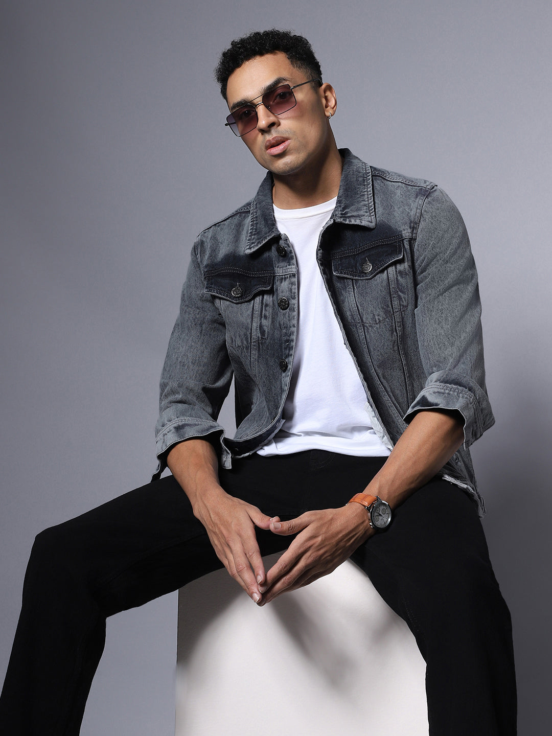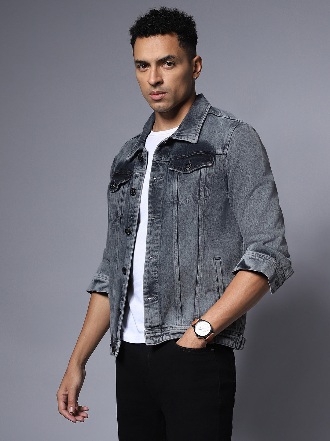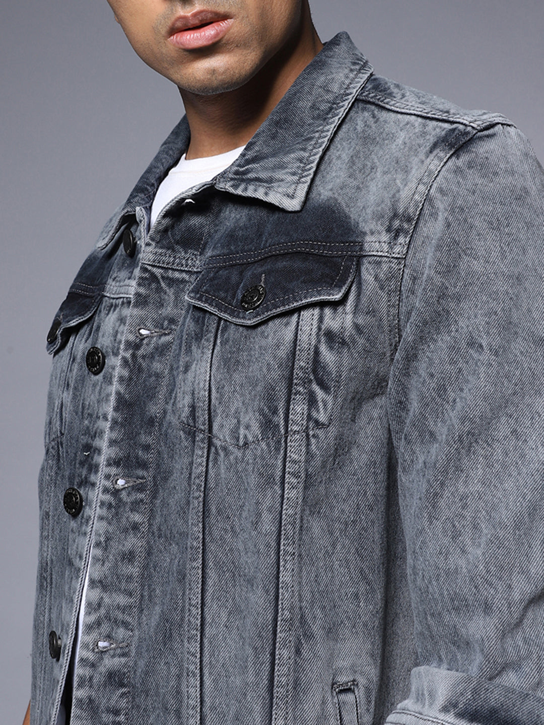 Men's Grey Solid Denim Jacket