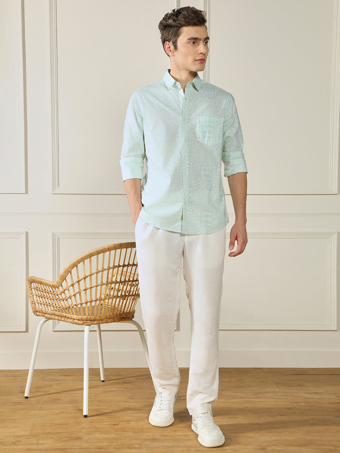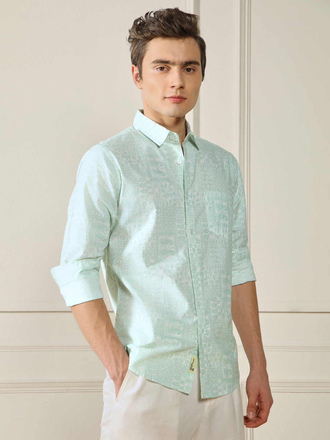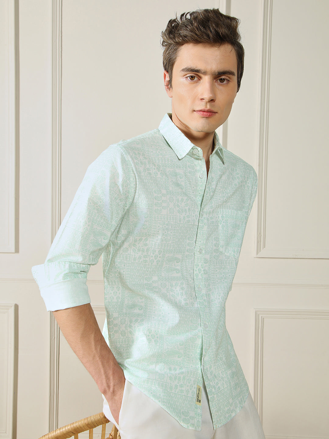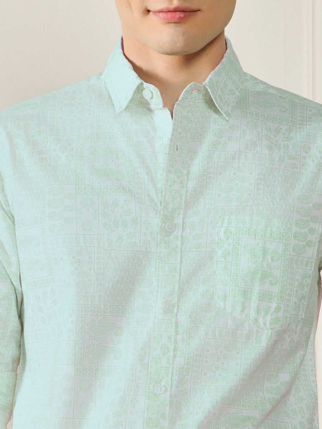 Men's Green Ethnic Motifs Printed Cotton Slub Casual Shirt
