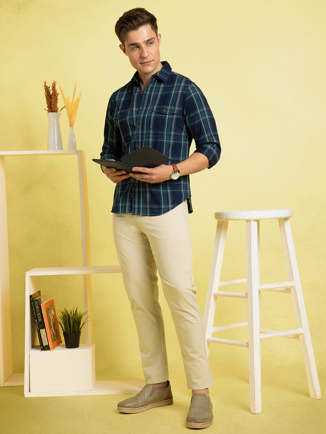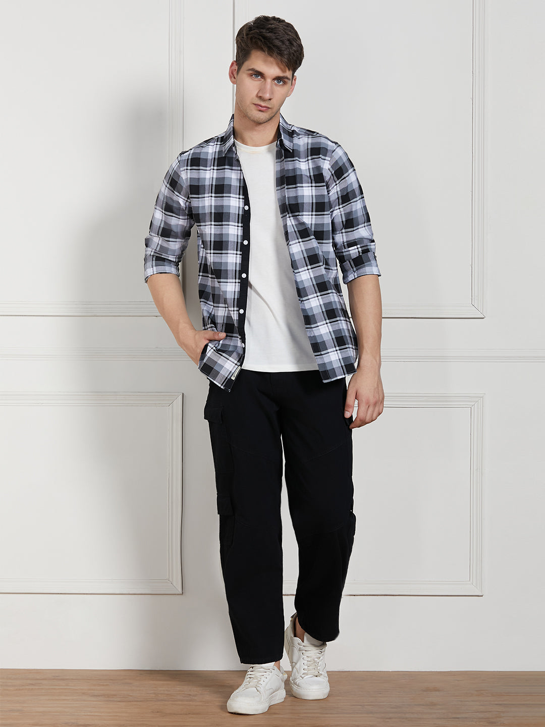 Men's Button-Down Collar Slim Fit Windowpane Checks Opaque Cotton Casual Shirt
