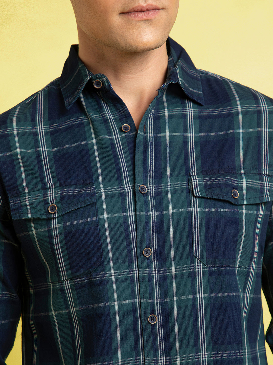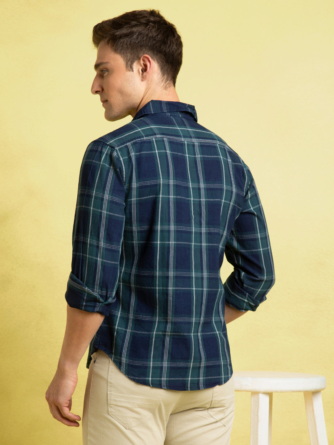 Men's Navy Blue Checks Spread Collar Full Sleeves Casual Shirt