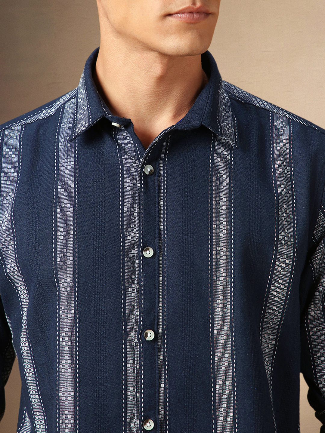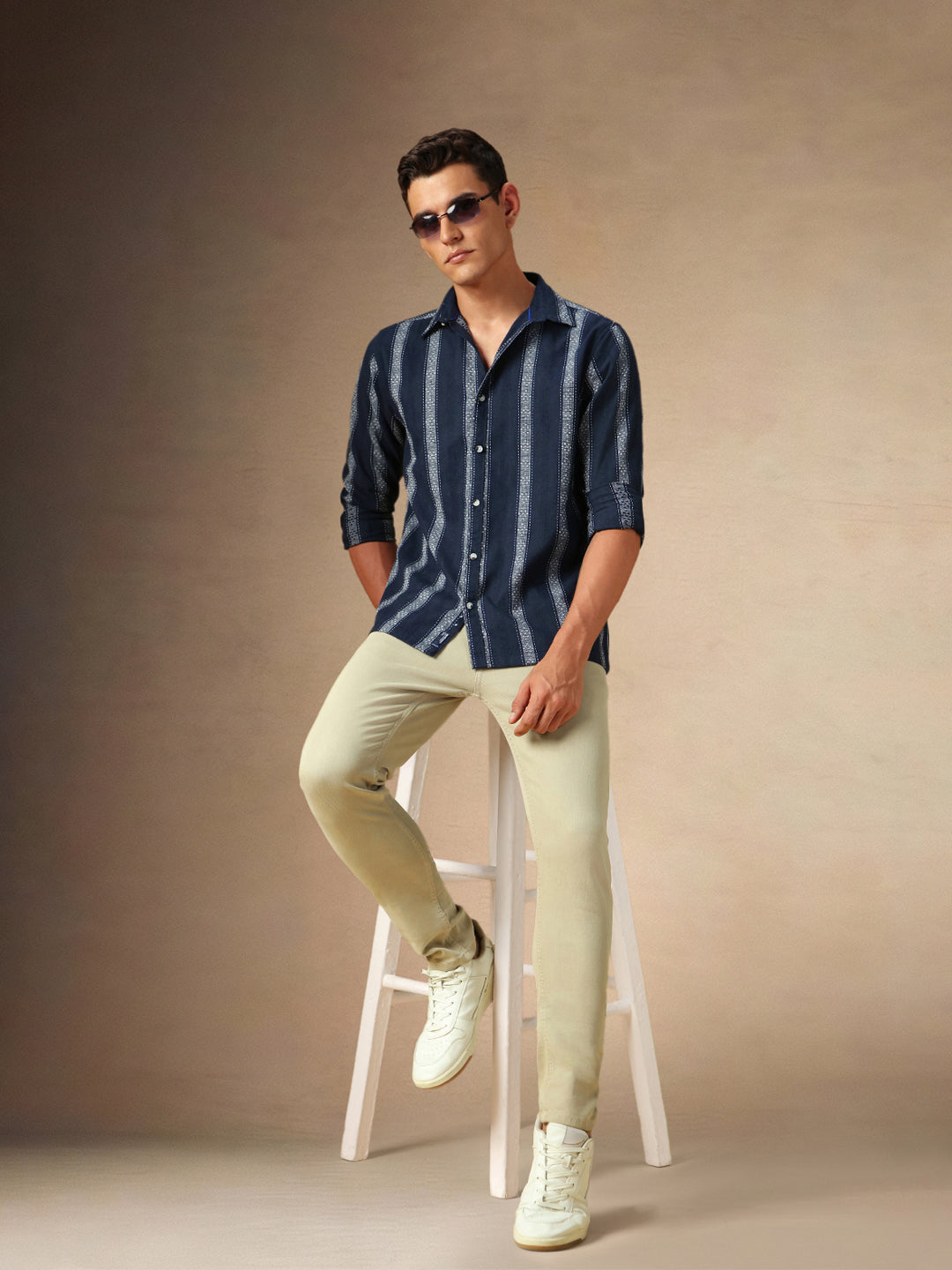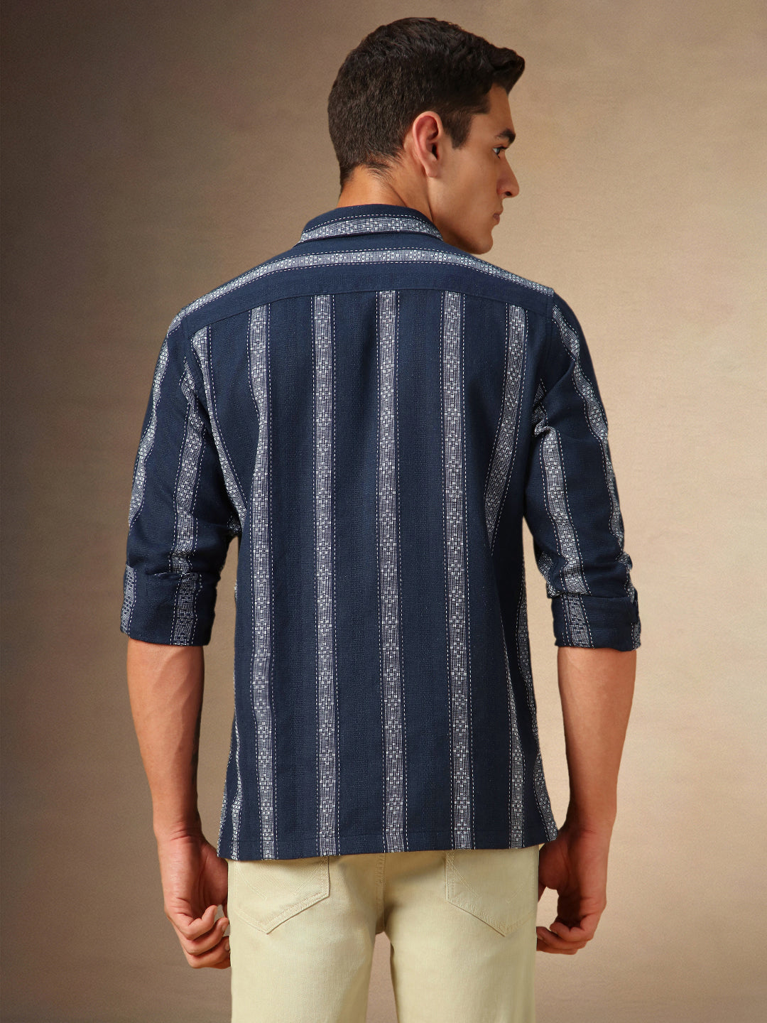 Men's Navy Striped Spread Collar Full Sleeves Casual Shirt