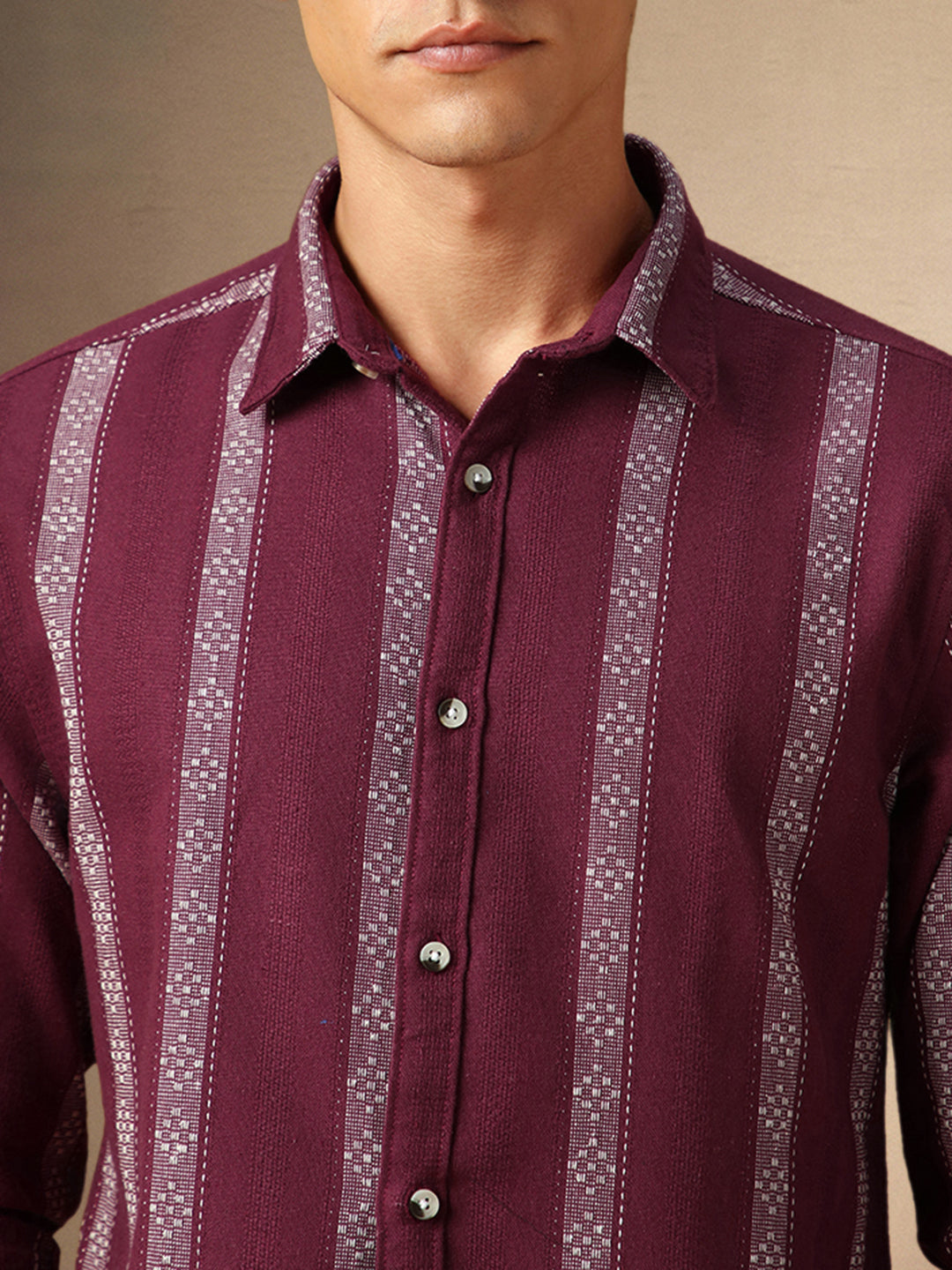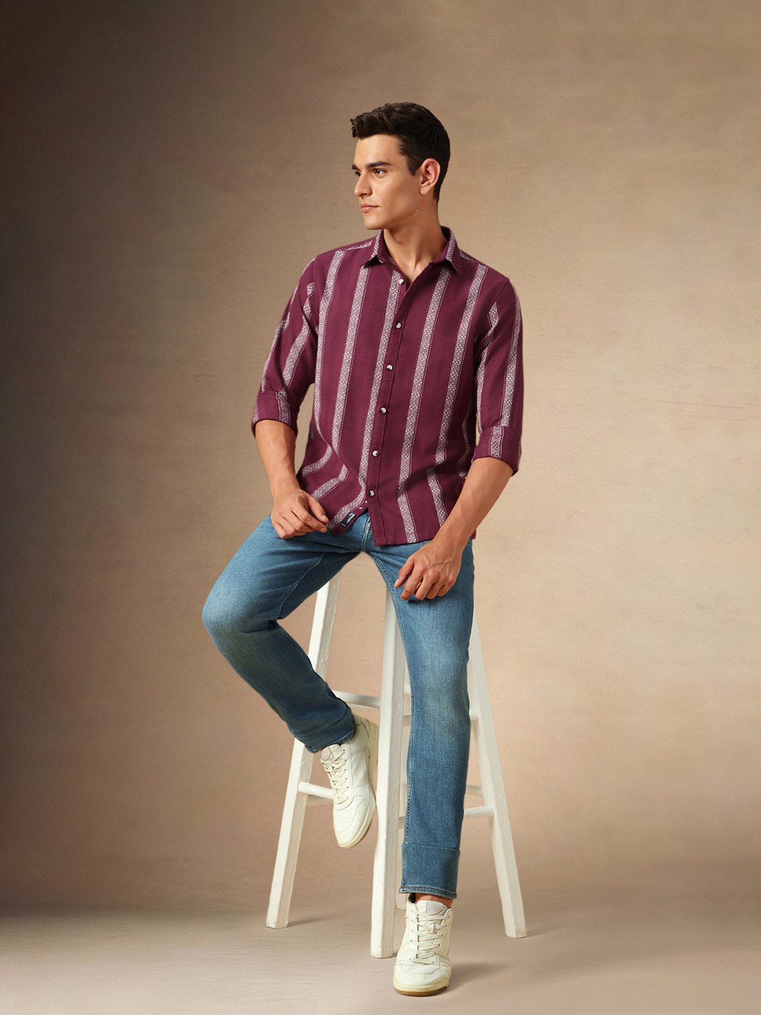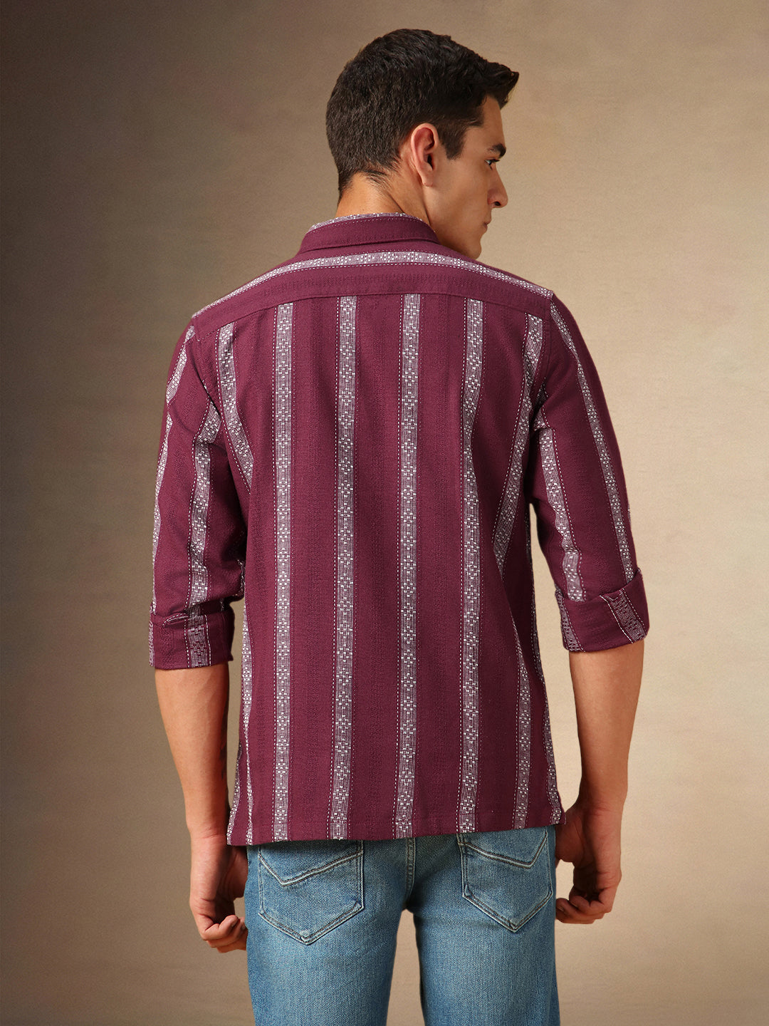 Men's Maroon Striped Spread Collar Full Sleeves Casual Shirt