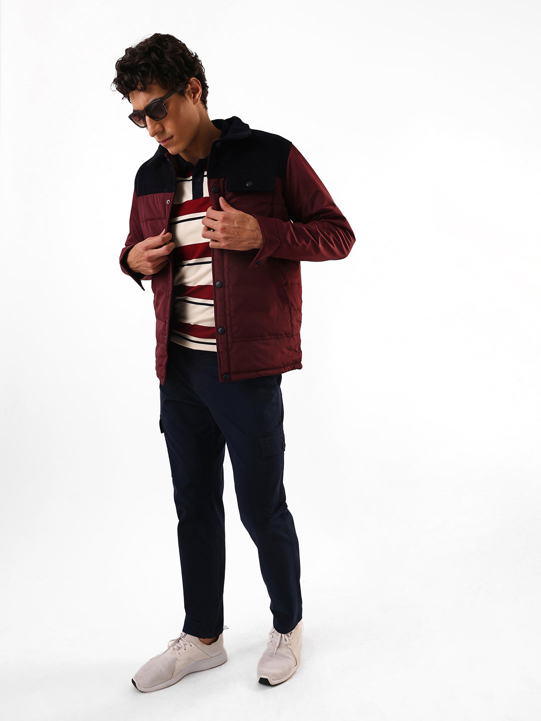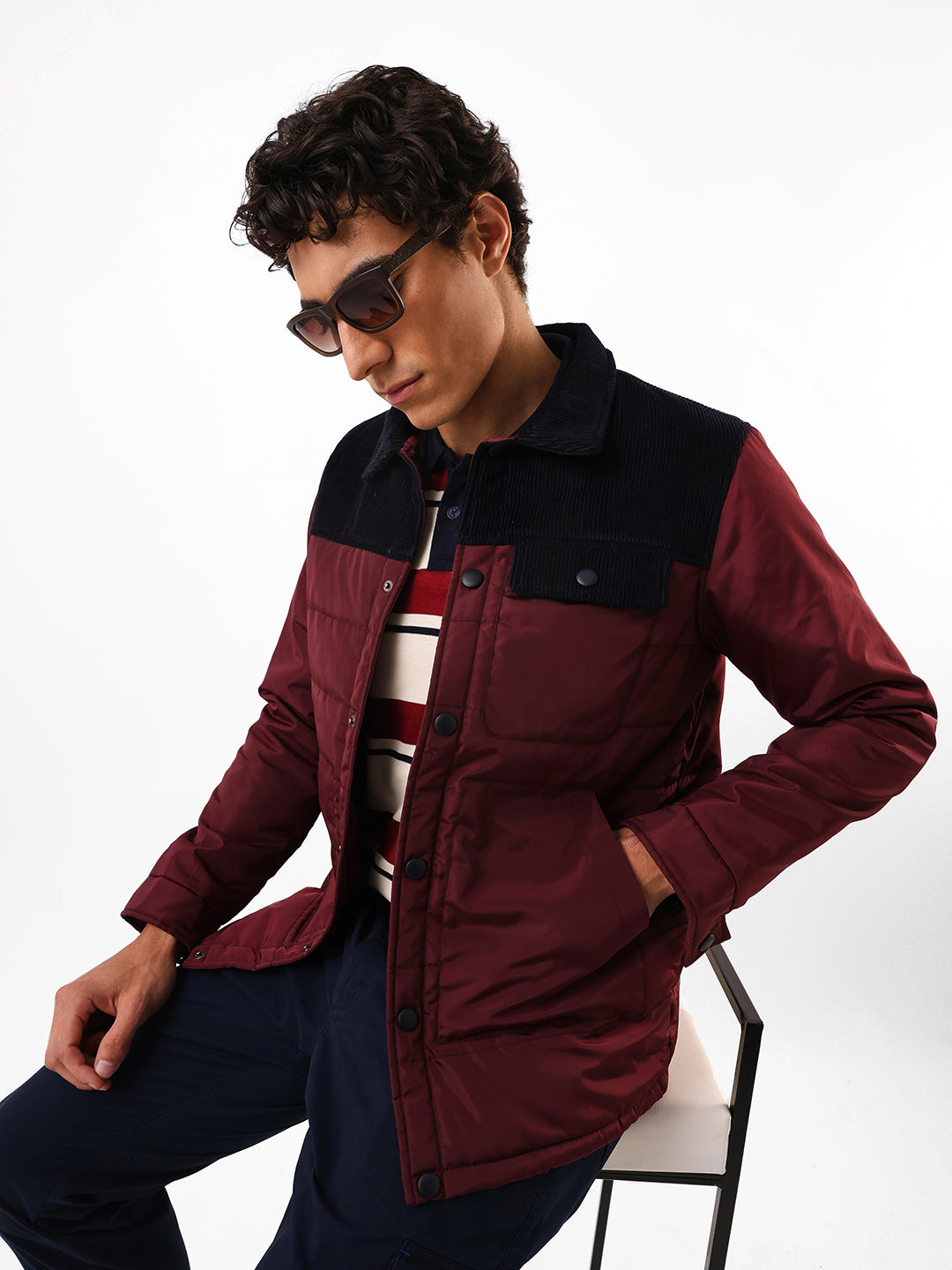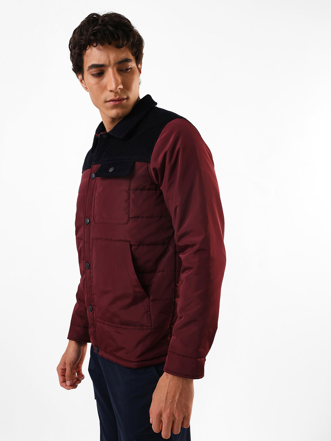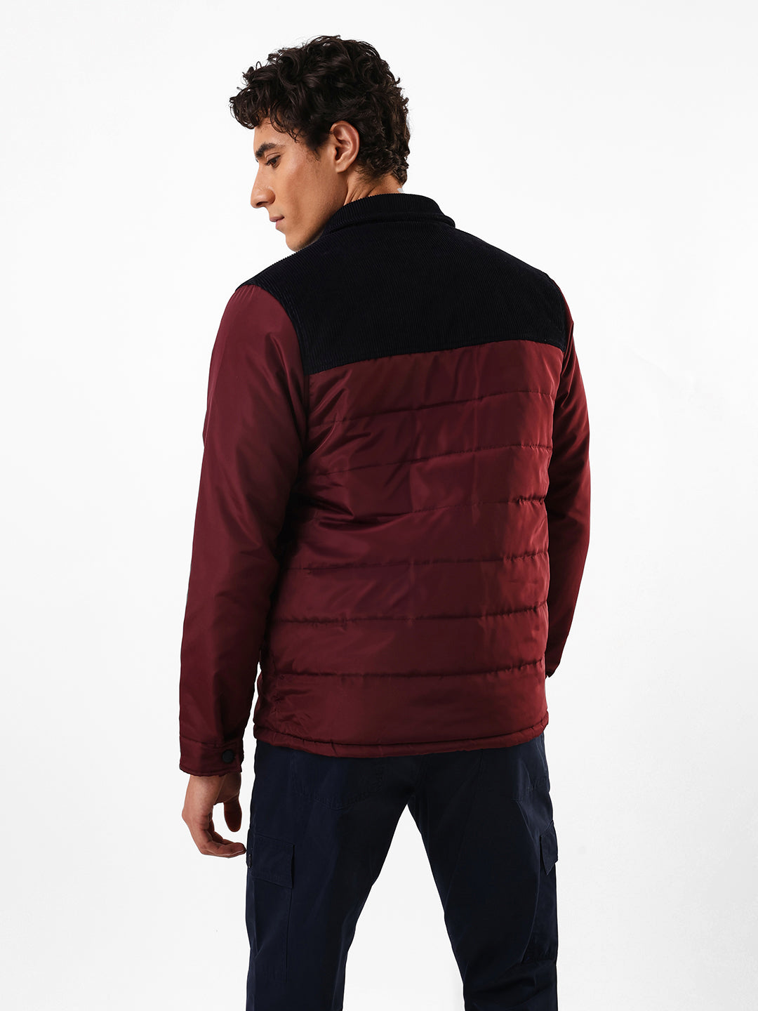 Men's Black & Maroon Colourblocked Spread Collar Full Sleeves Puffer Jacket