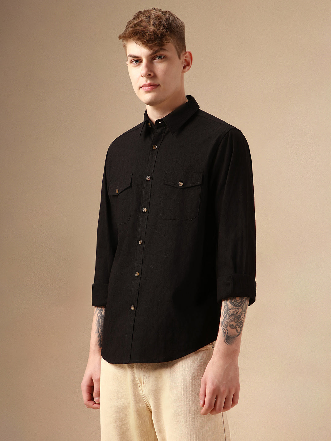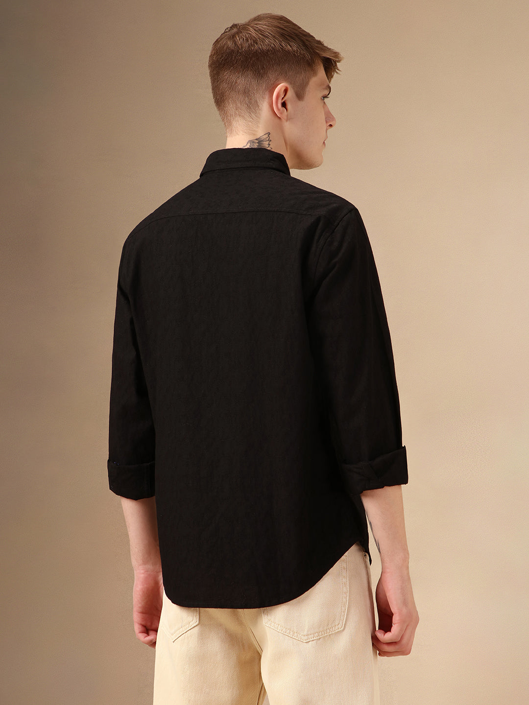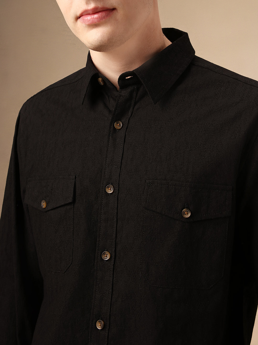Men's Black Textured Spread Collar Full Sleeves 100% Cotton Casual Shirt
