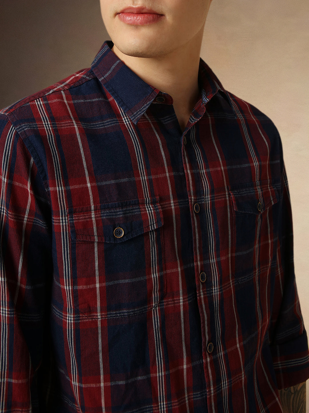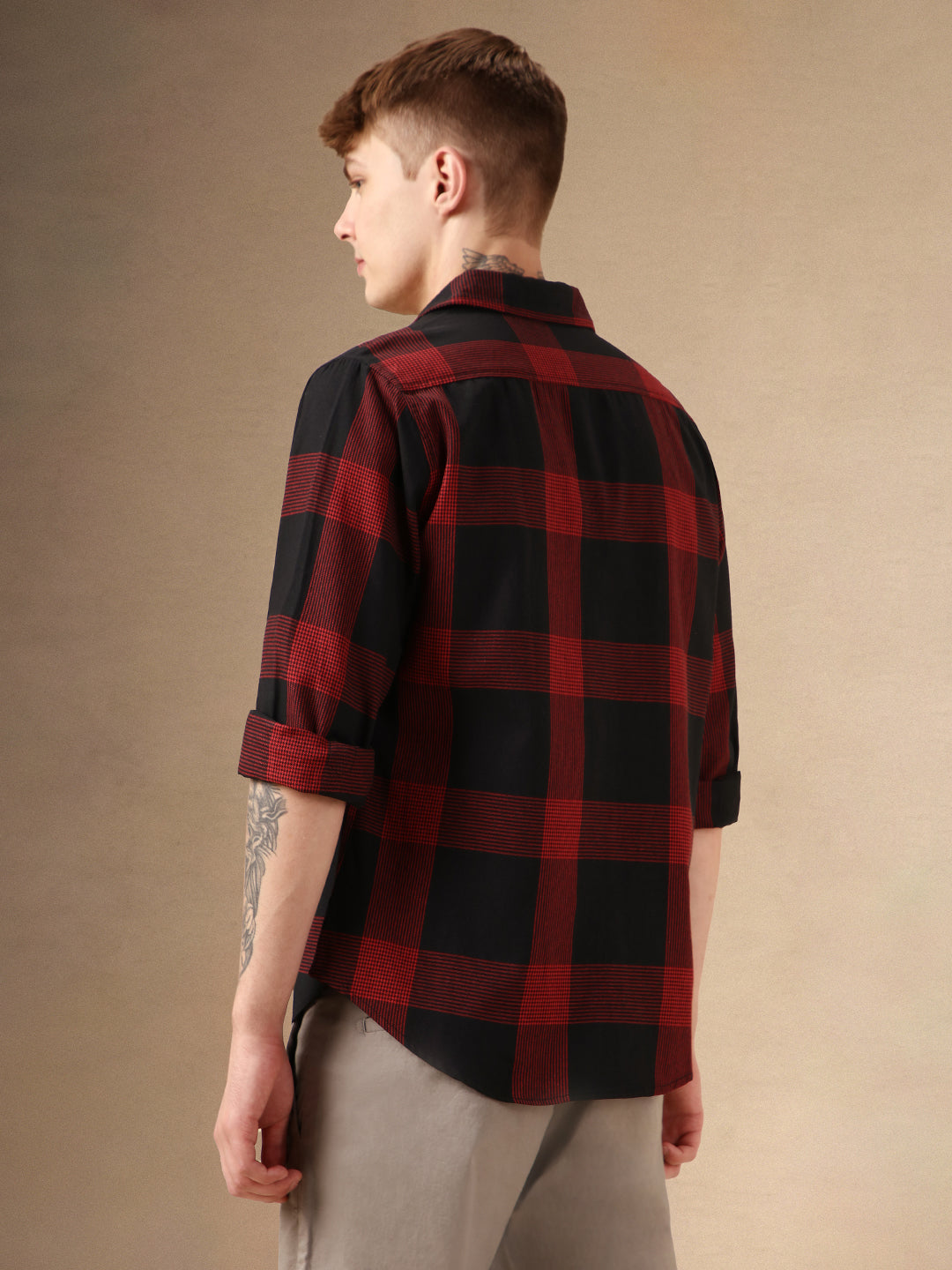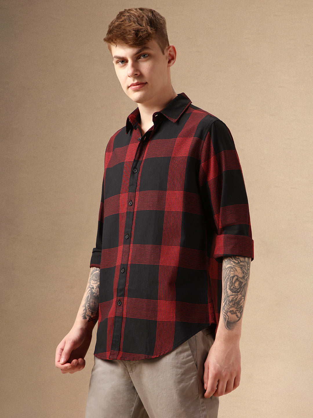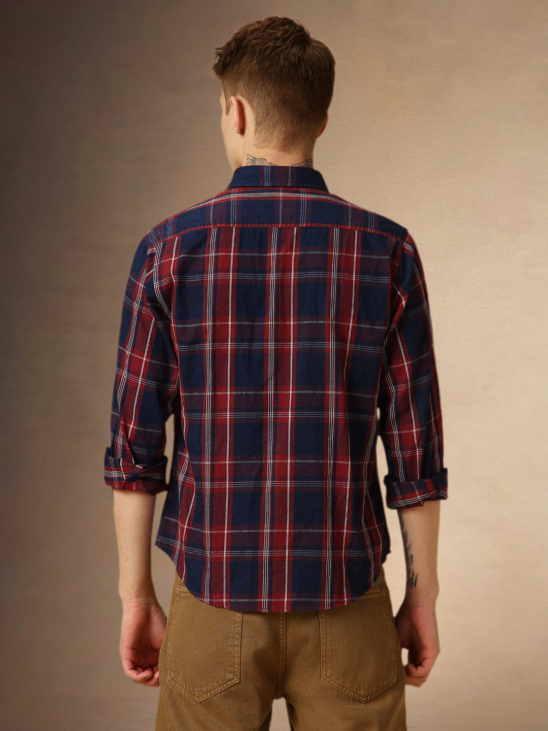 Men's Brown Checks Spread Collar Full Sleeves Regular Fit Shirt