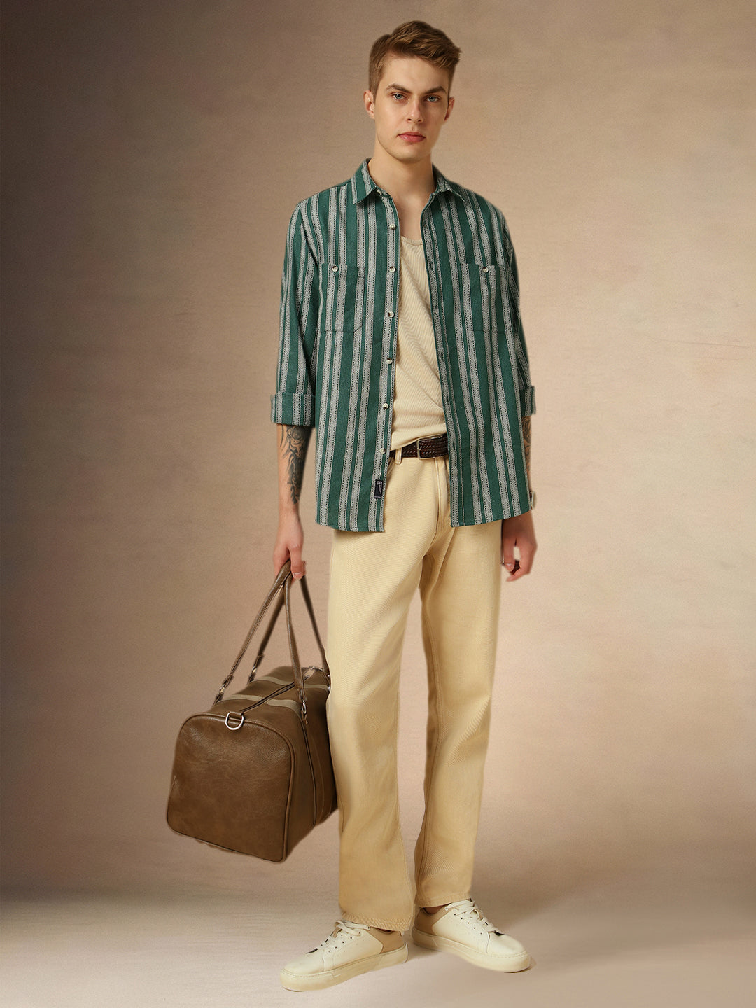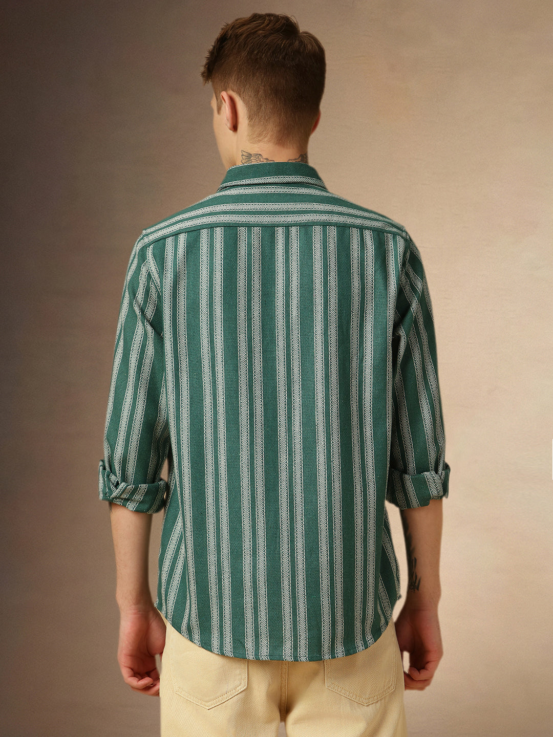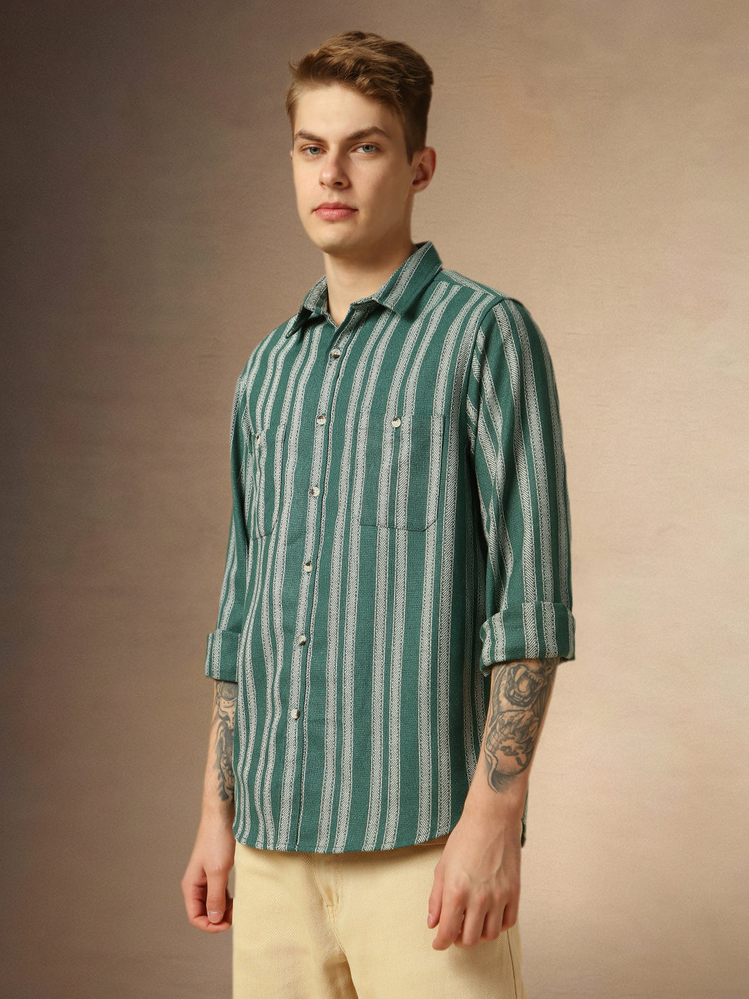 Men's Beige Striped Button Down Collar Full Sleeves Relaxed Fit Shirt