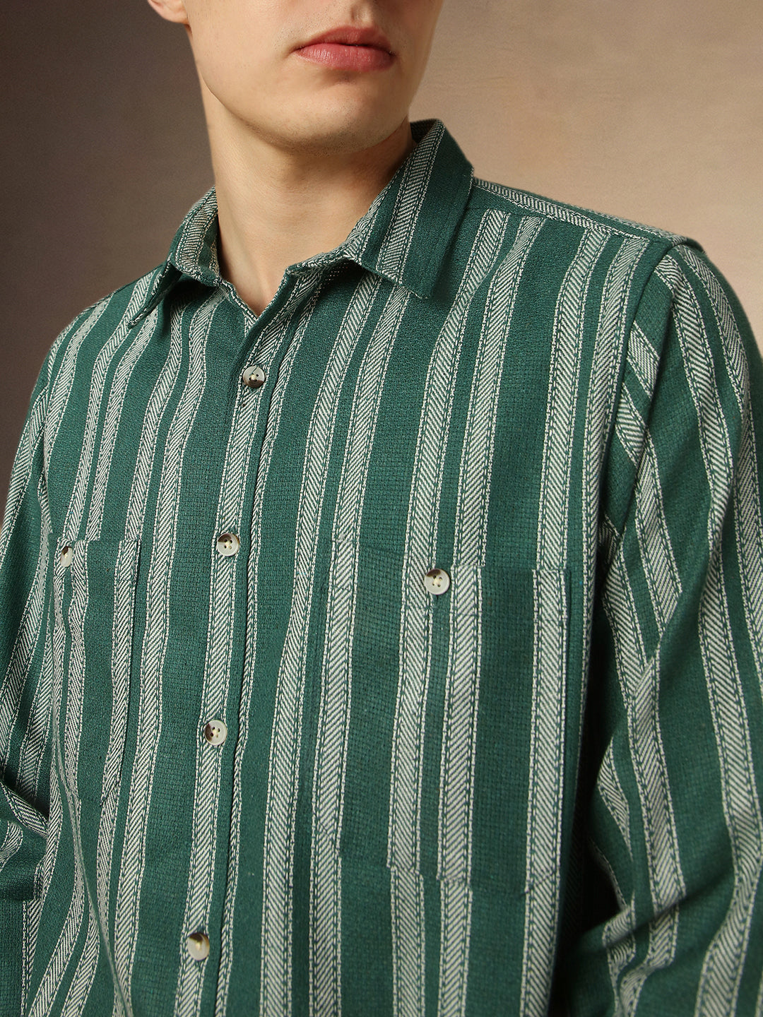 Men's Olive Striped Spread Collar Full Sleeves Relaxed Fit Shirt