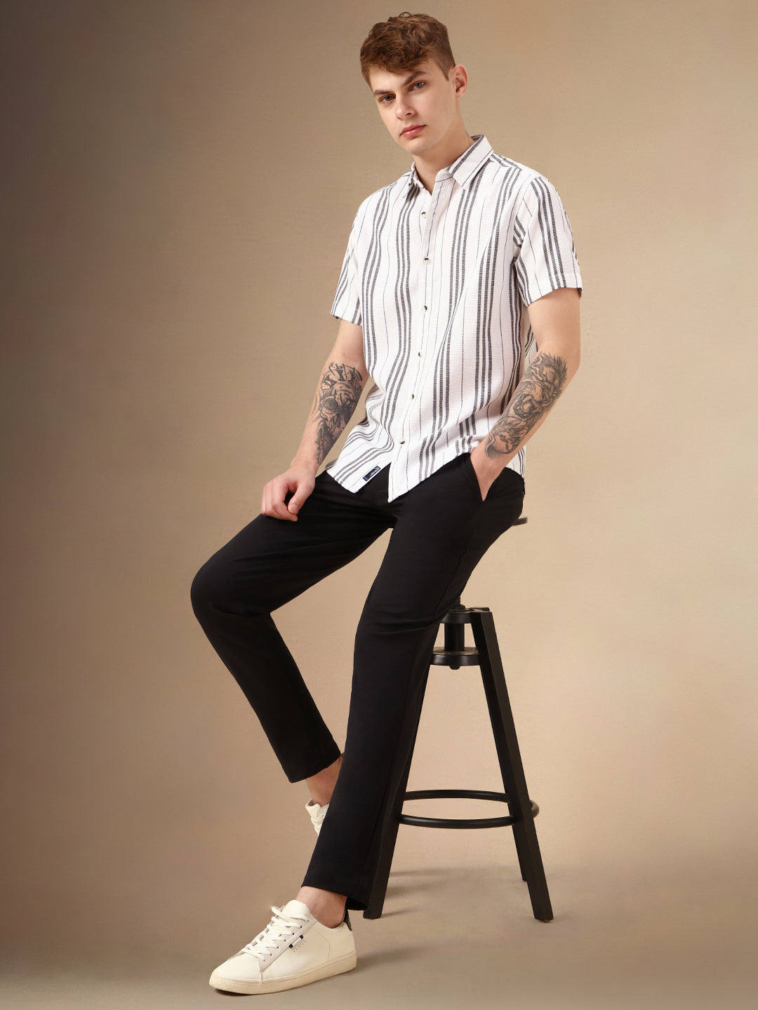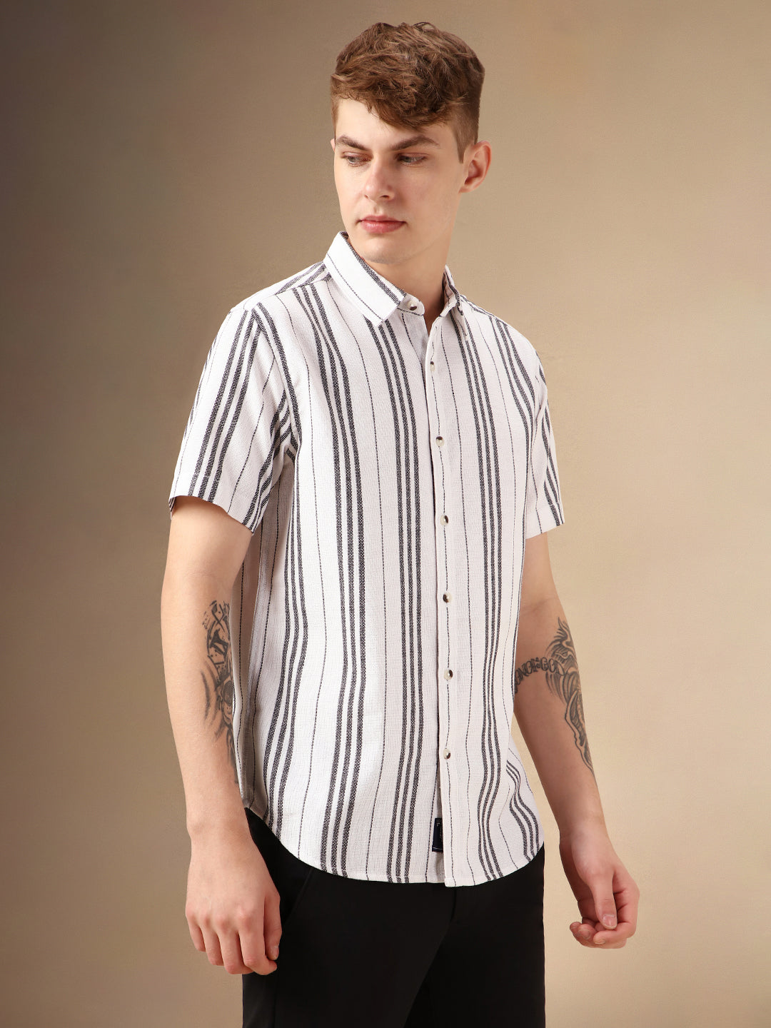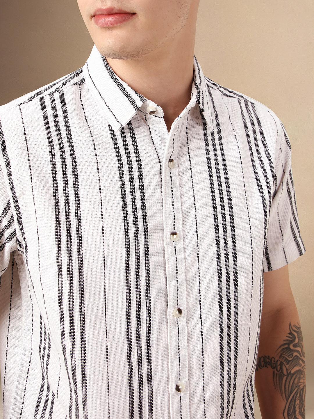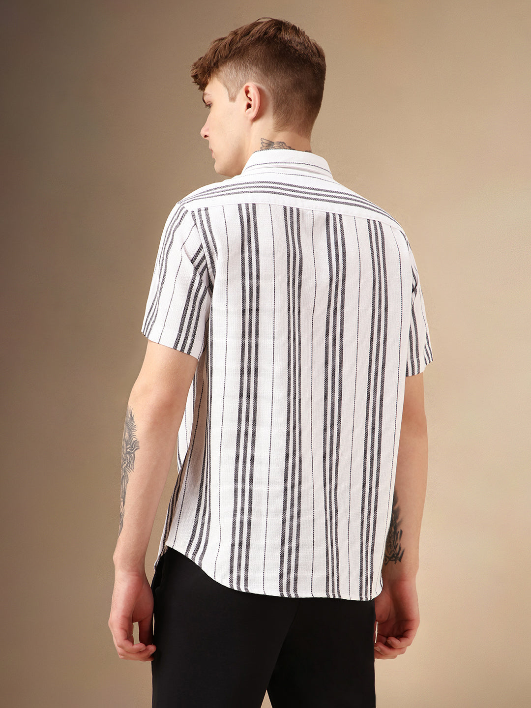 Men's White Striped Spread Collar Half Sleeves Casual Shirt