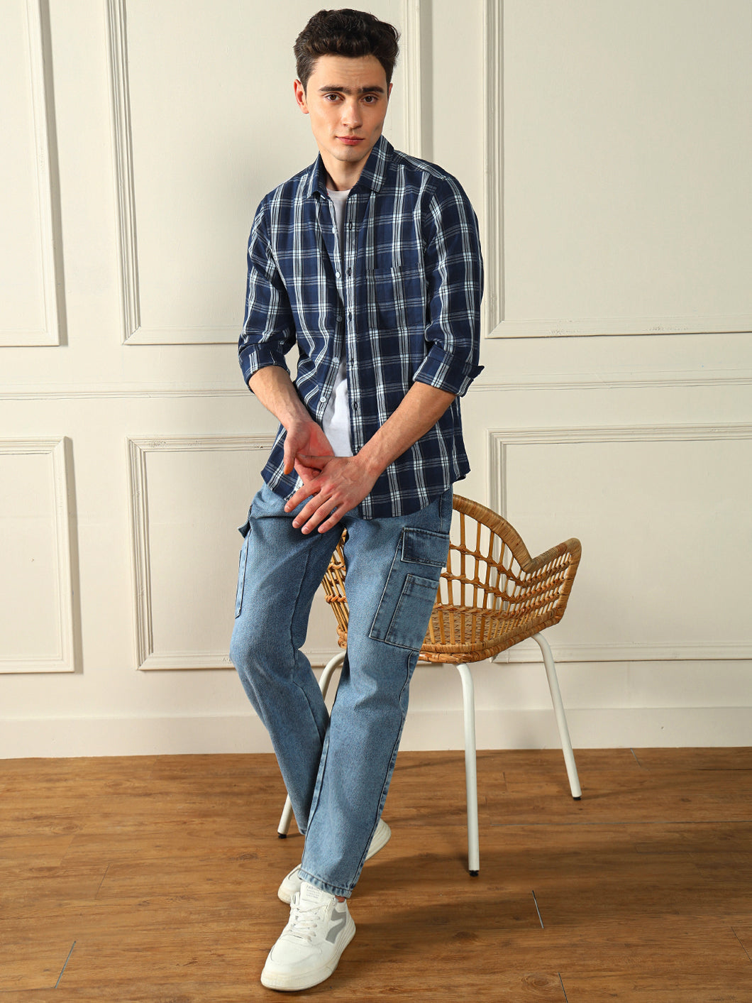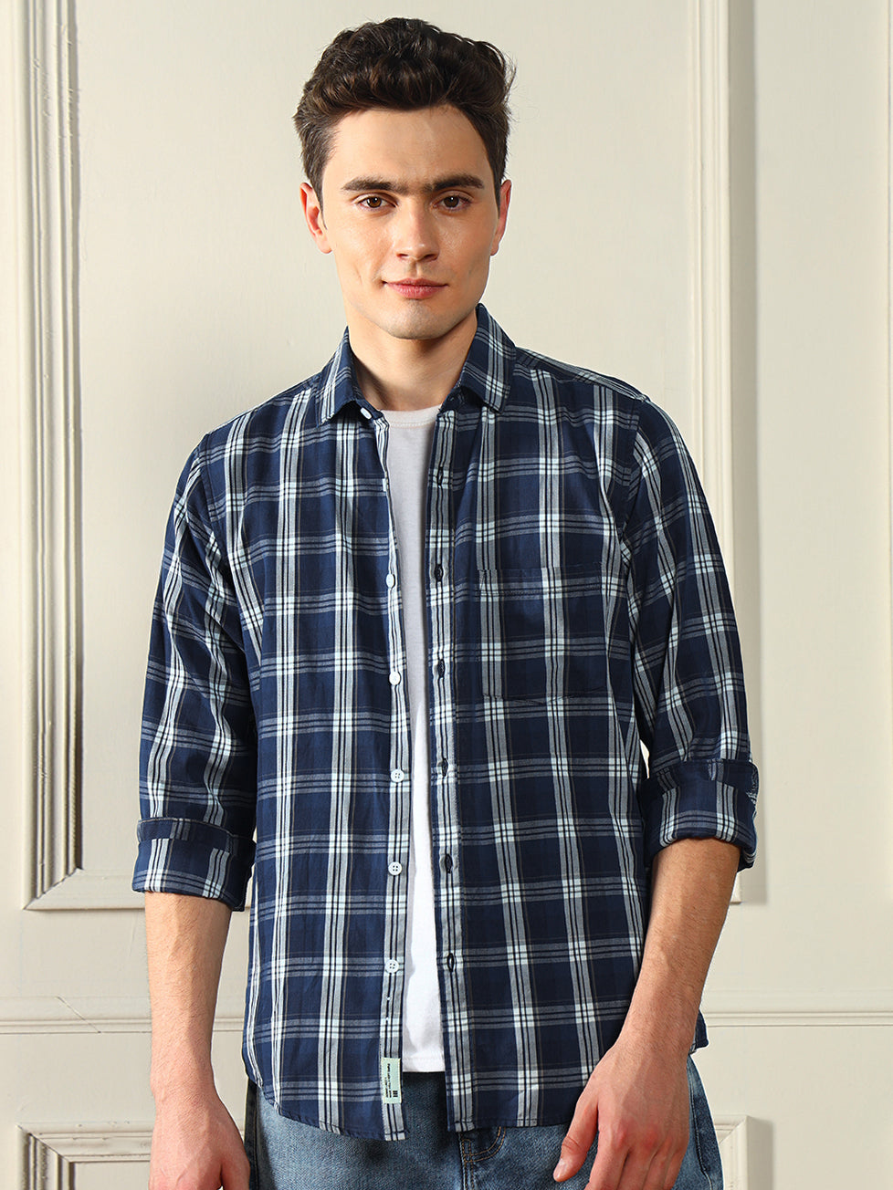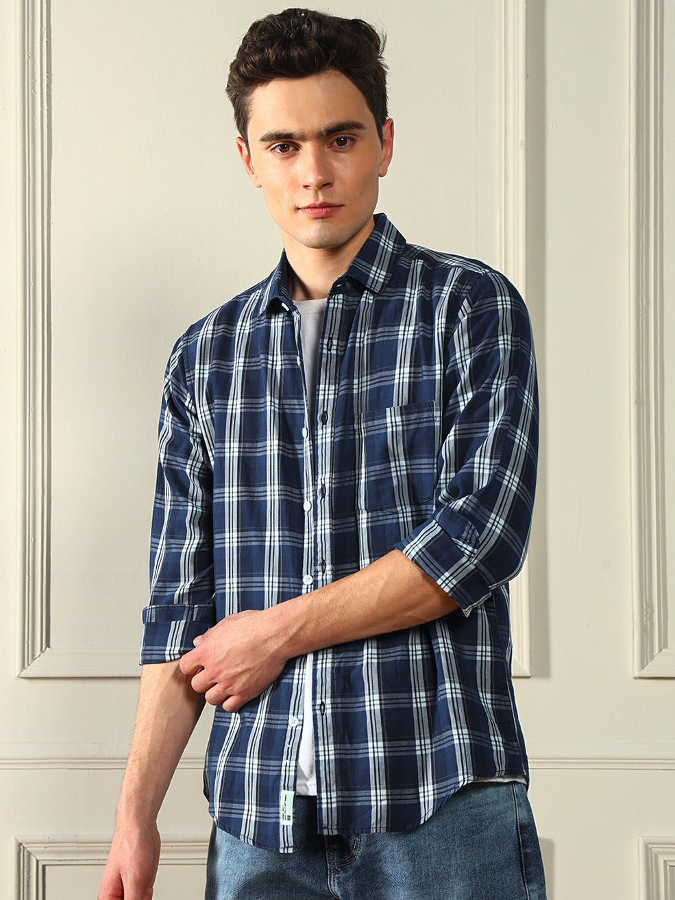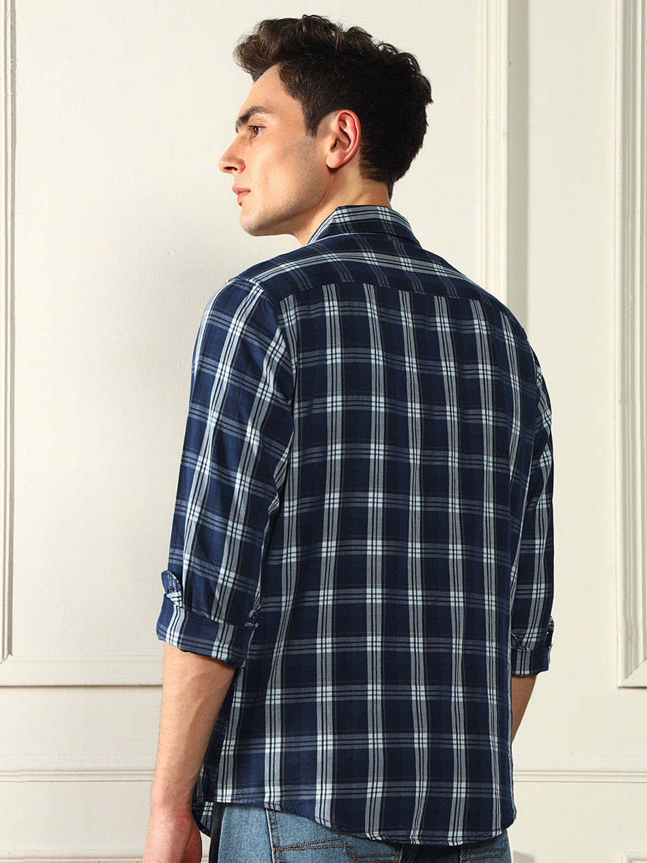 Men's Spread Collar Regular Fit Checks Blue Casual Shirt