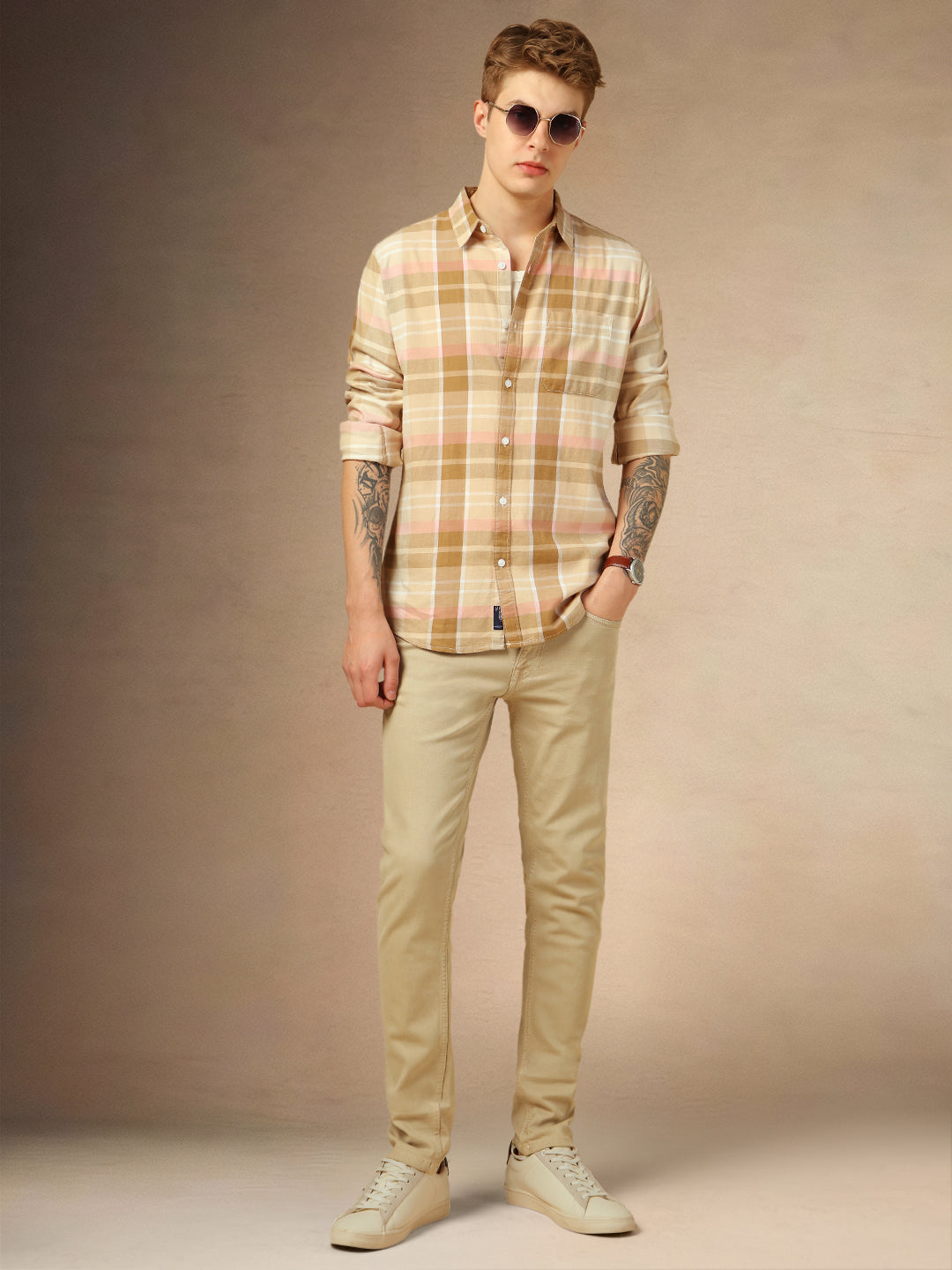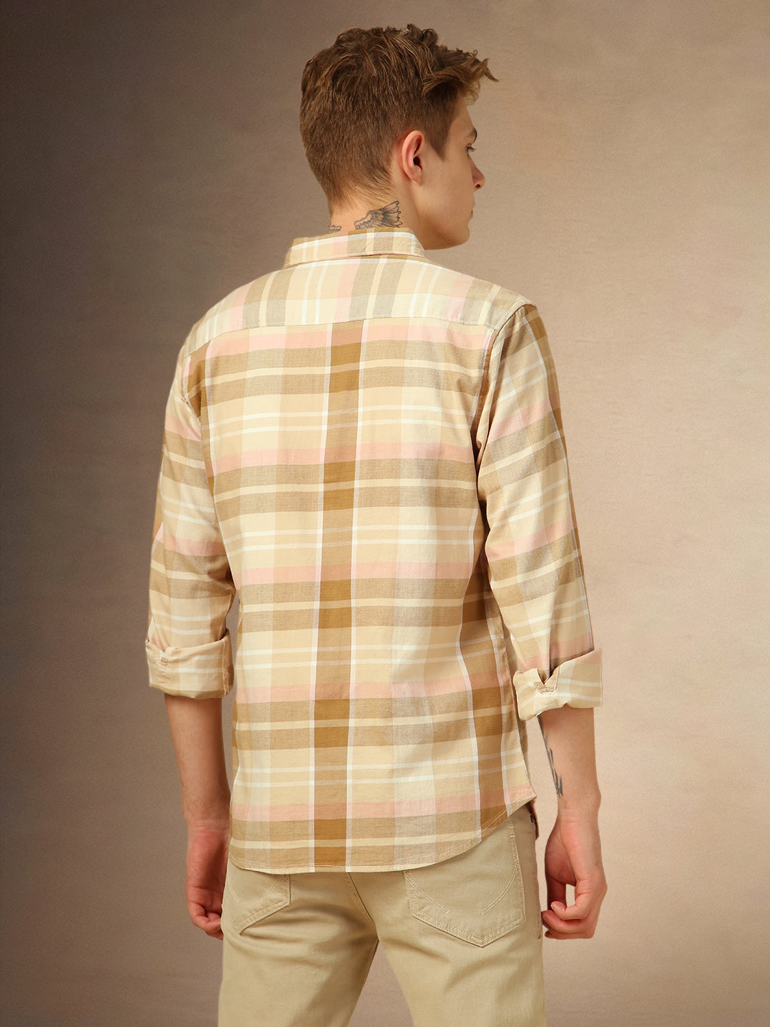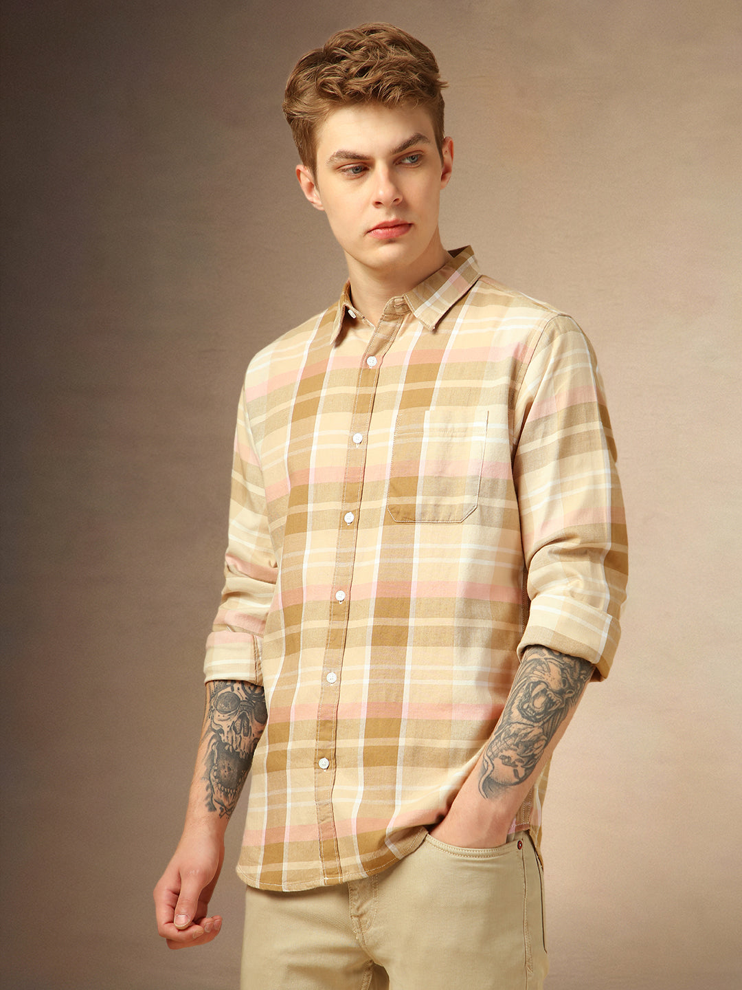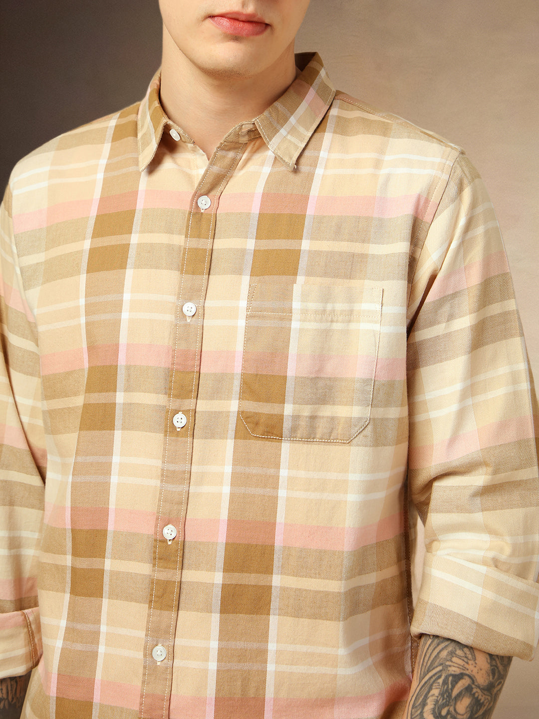 Men's Khaki Checks Spread Collar Full Sleeve Regular Fit Shirt