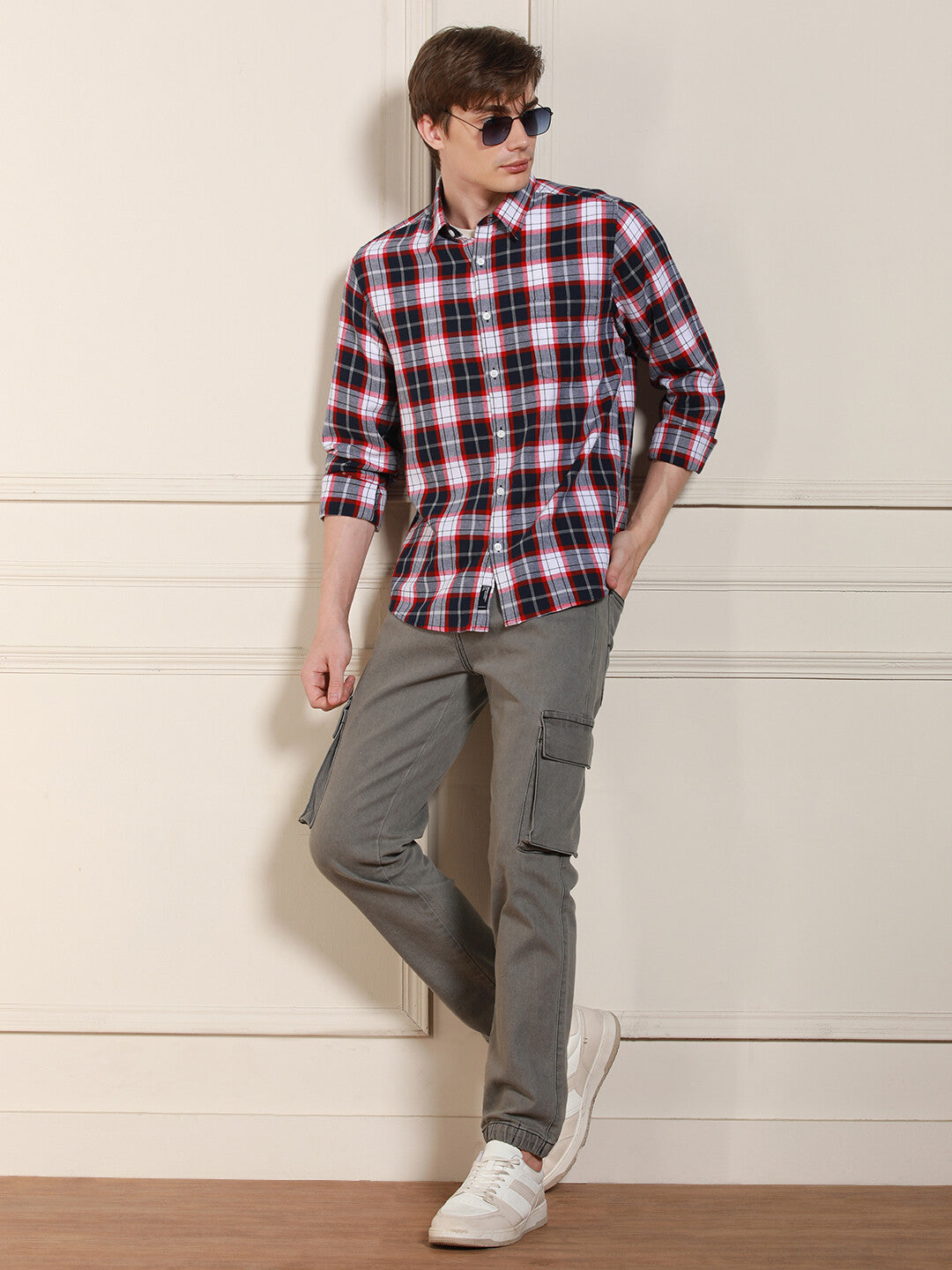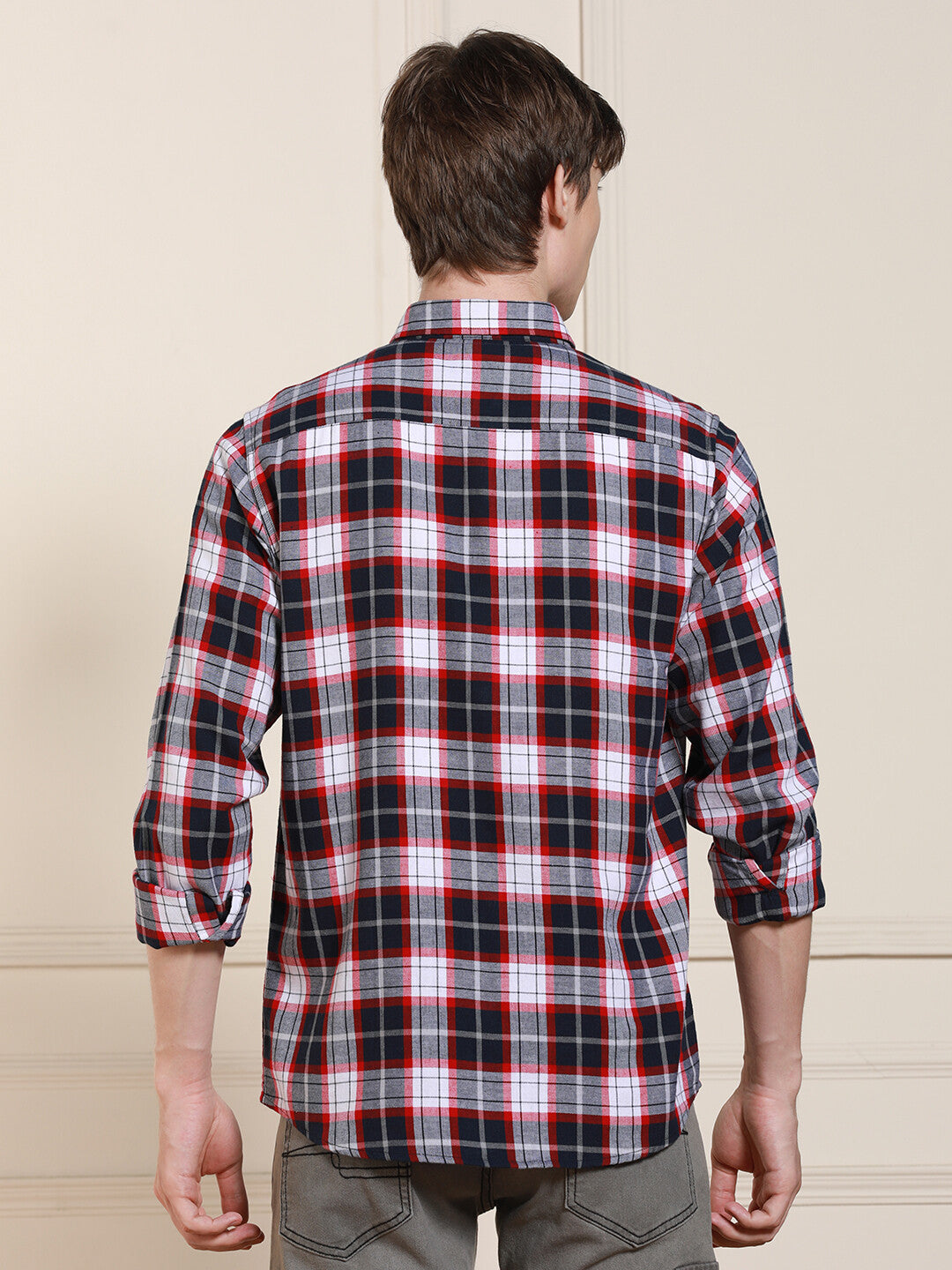 Men's Red Tartan Checks Spread Collar Full Sleeves Casual Shirt