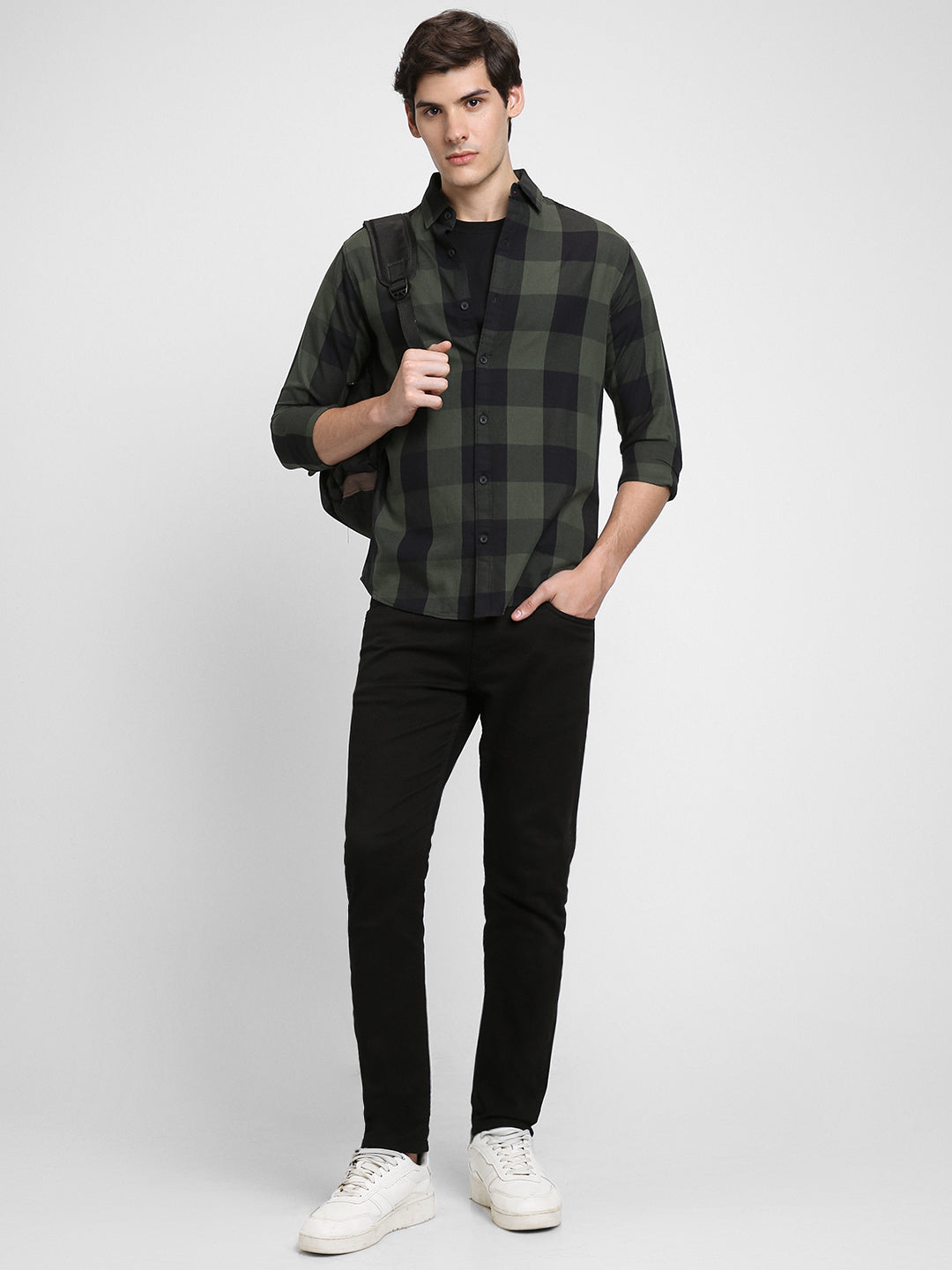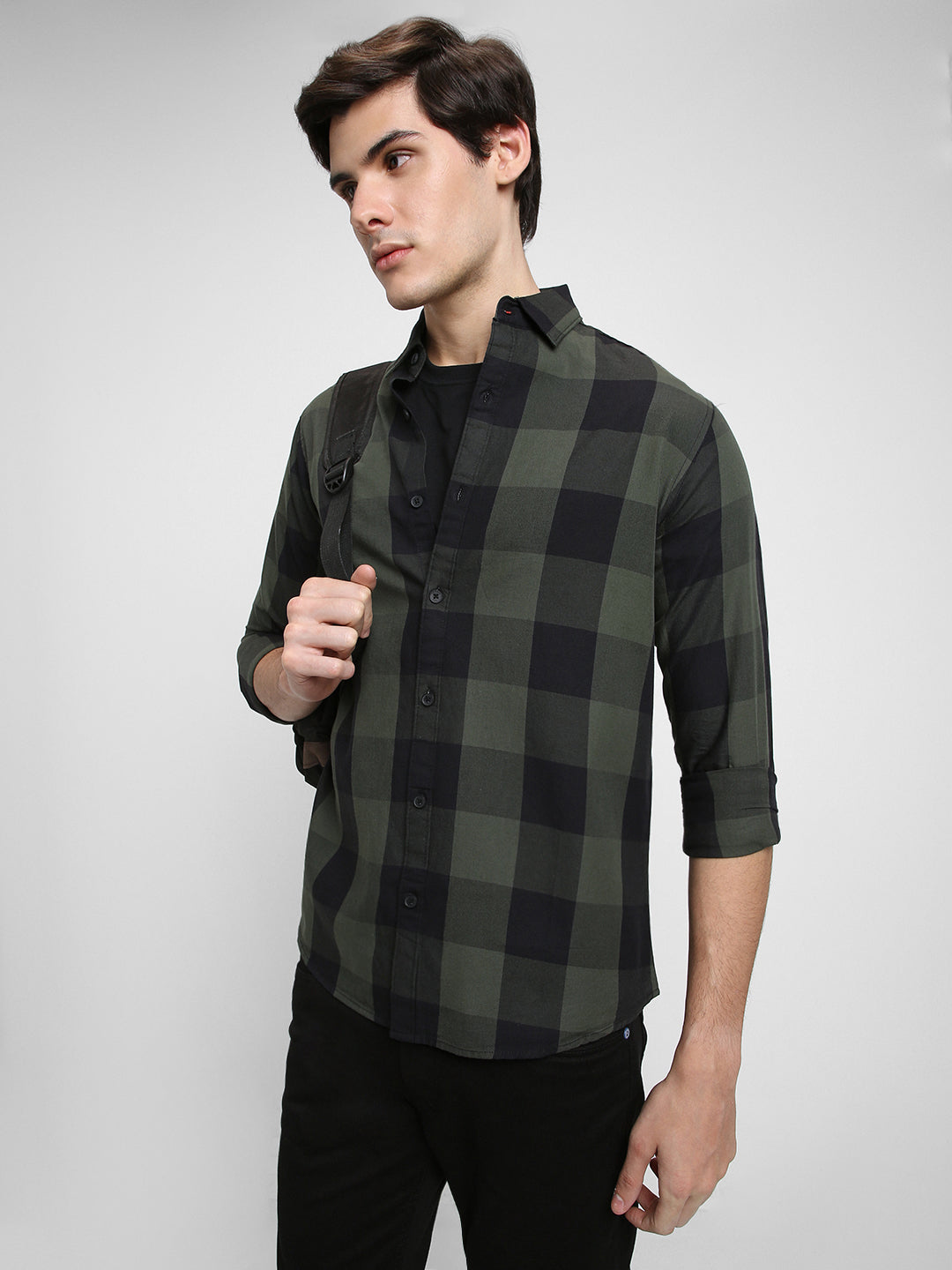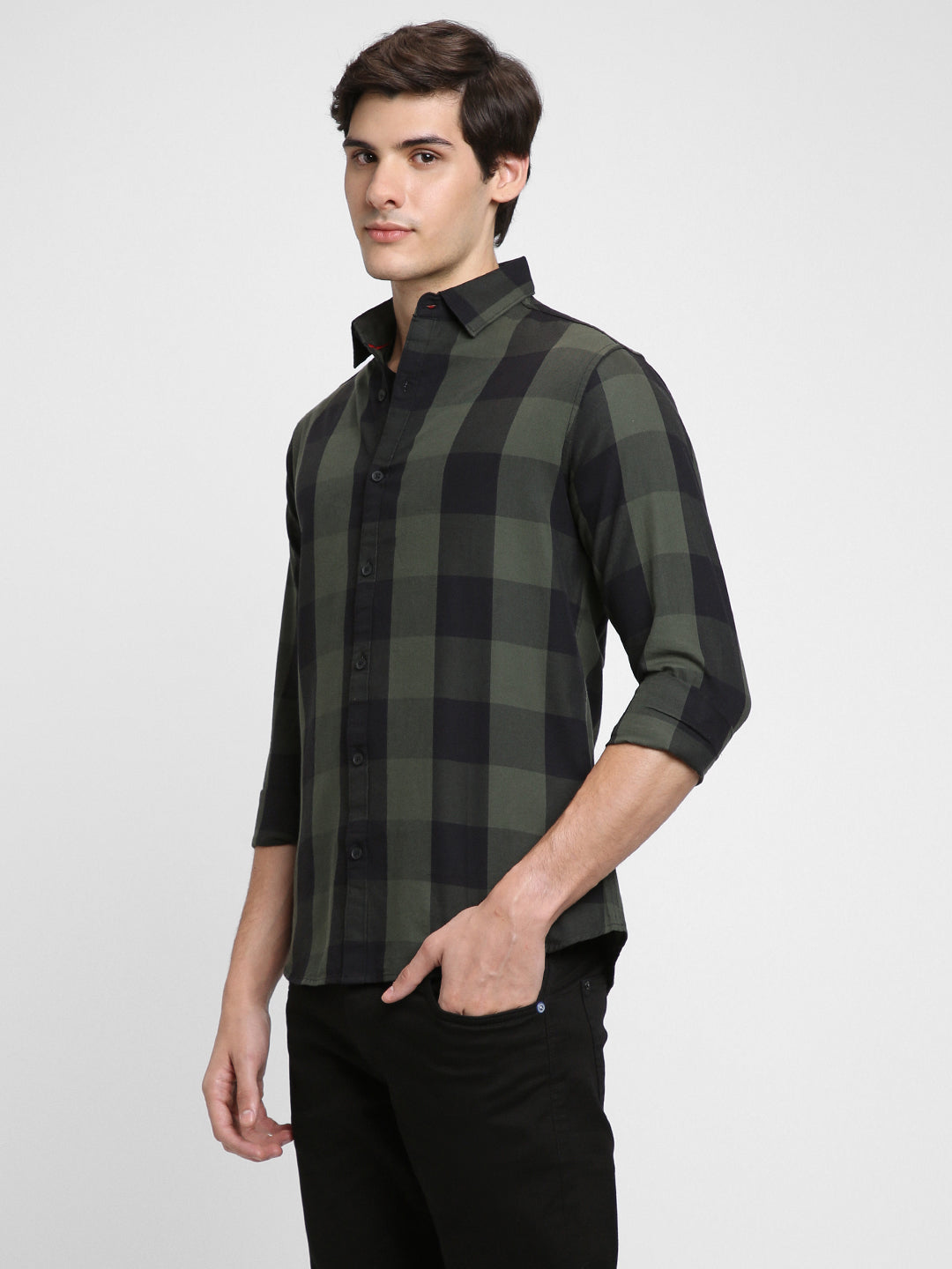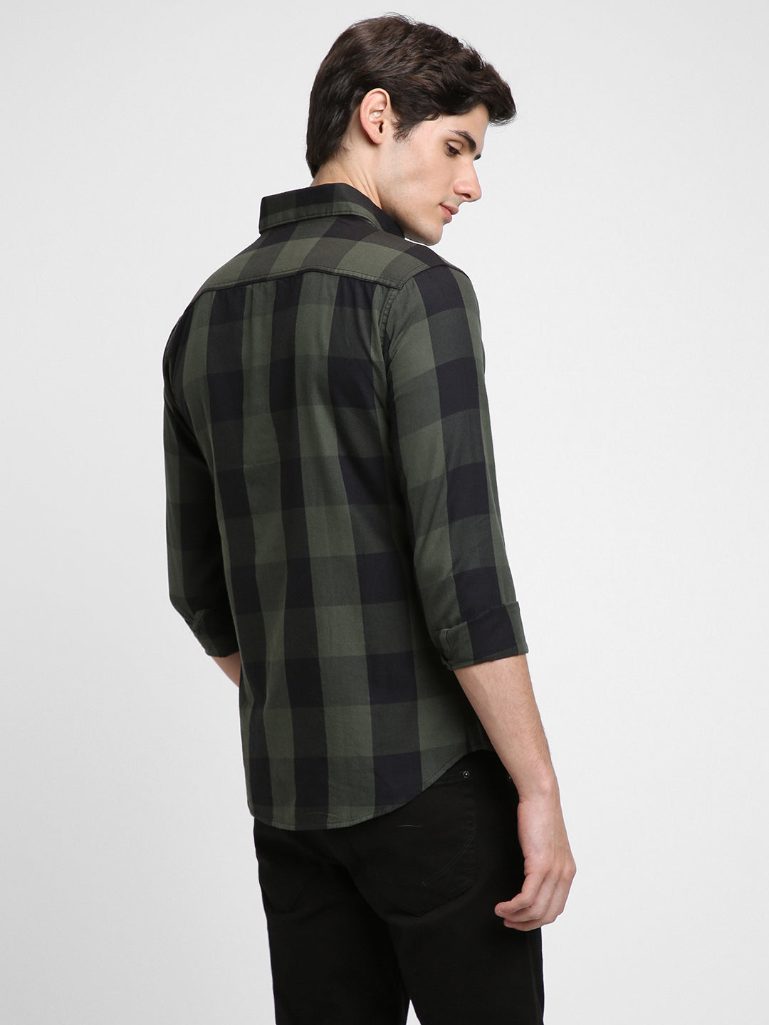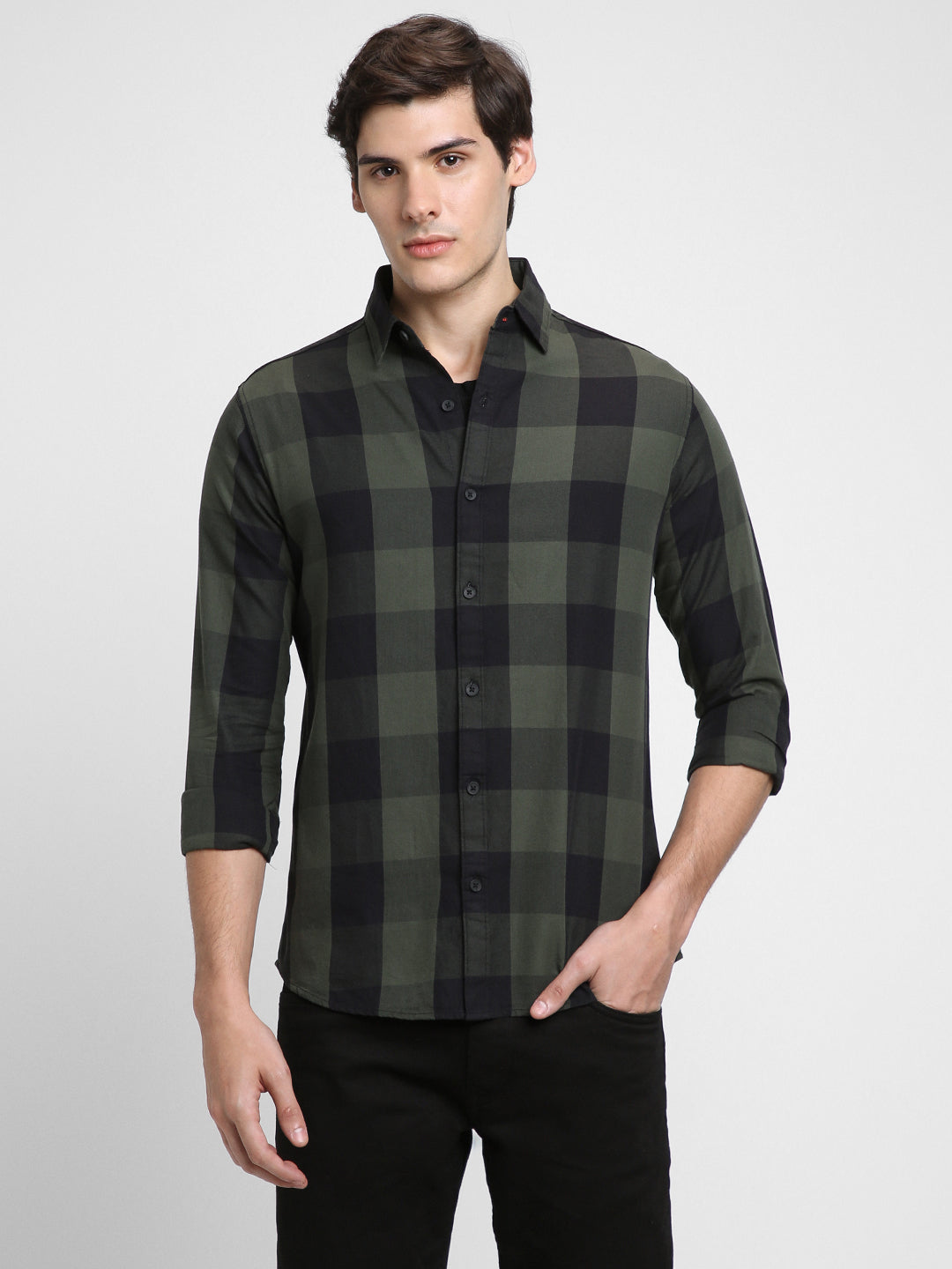 Men's Checkered Green Slim Fit Casual Shirt Button-Down Collar