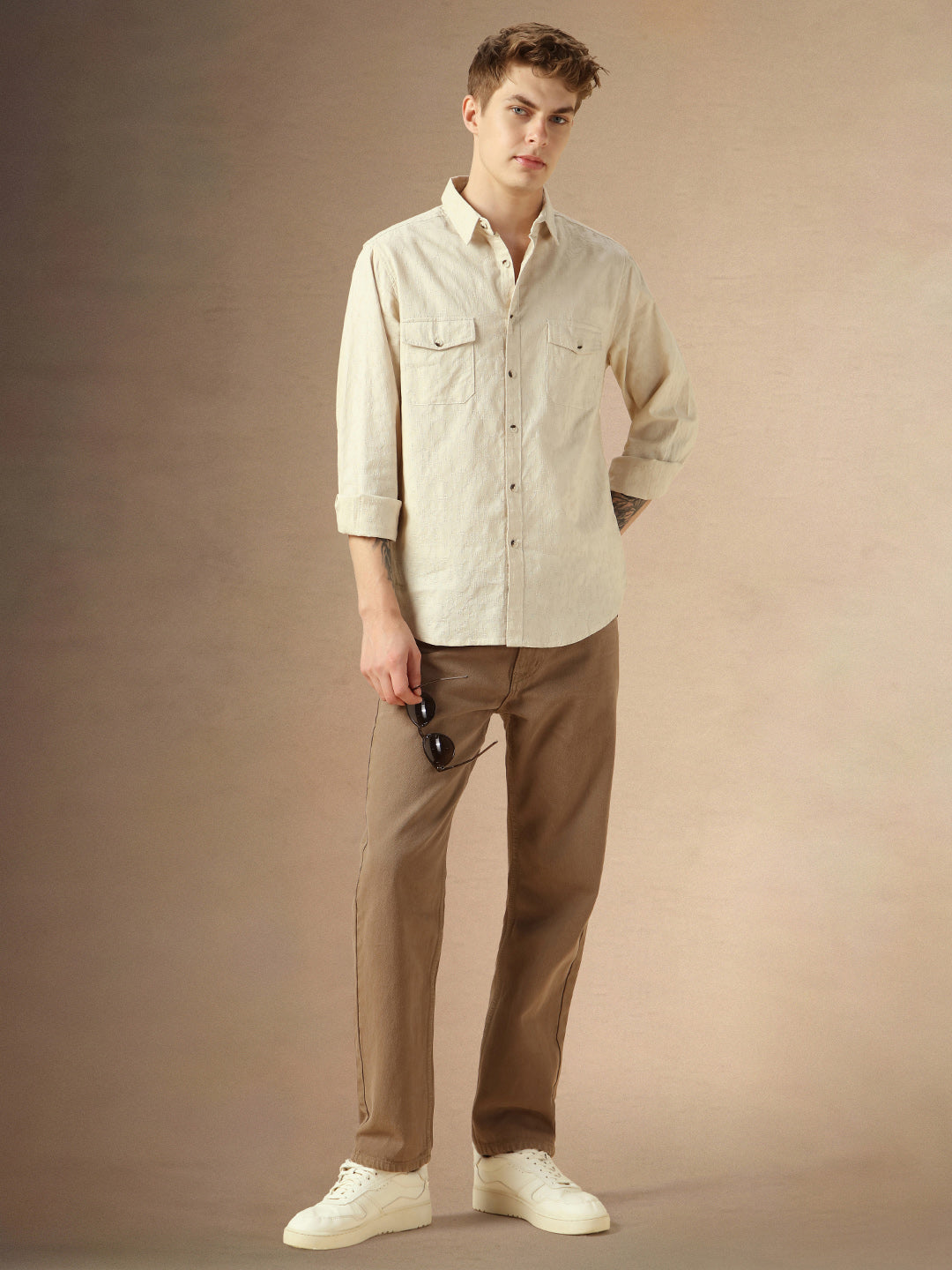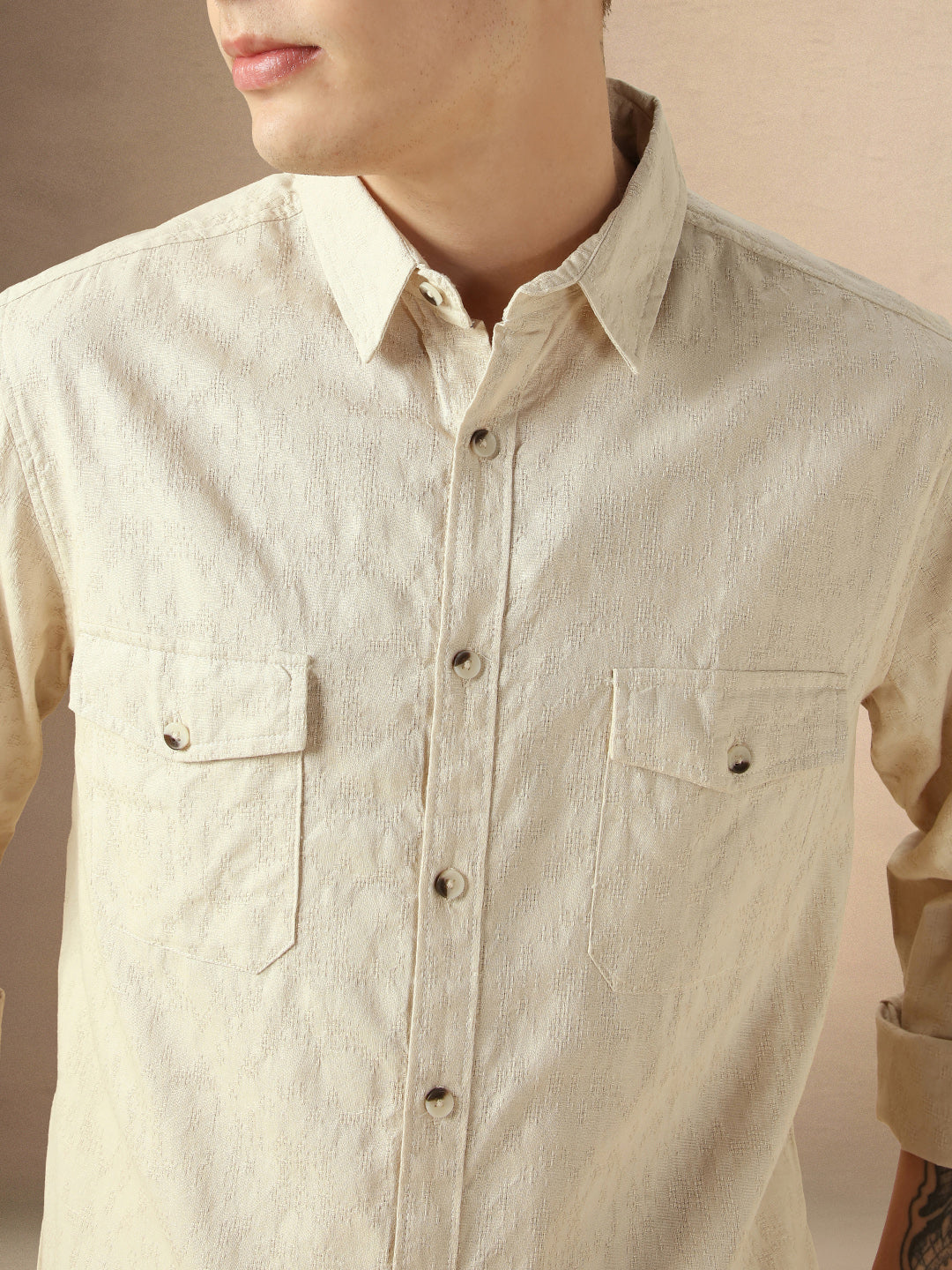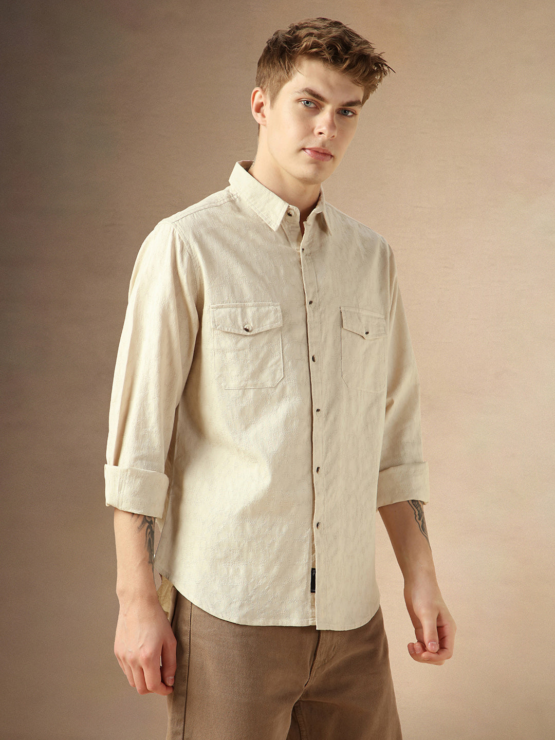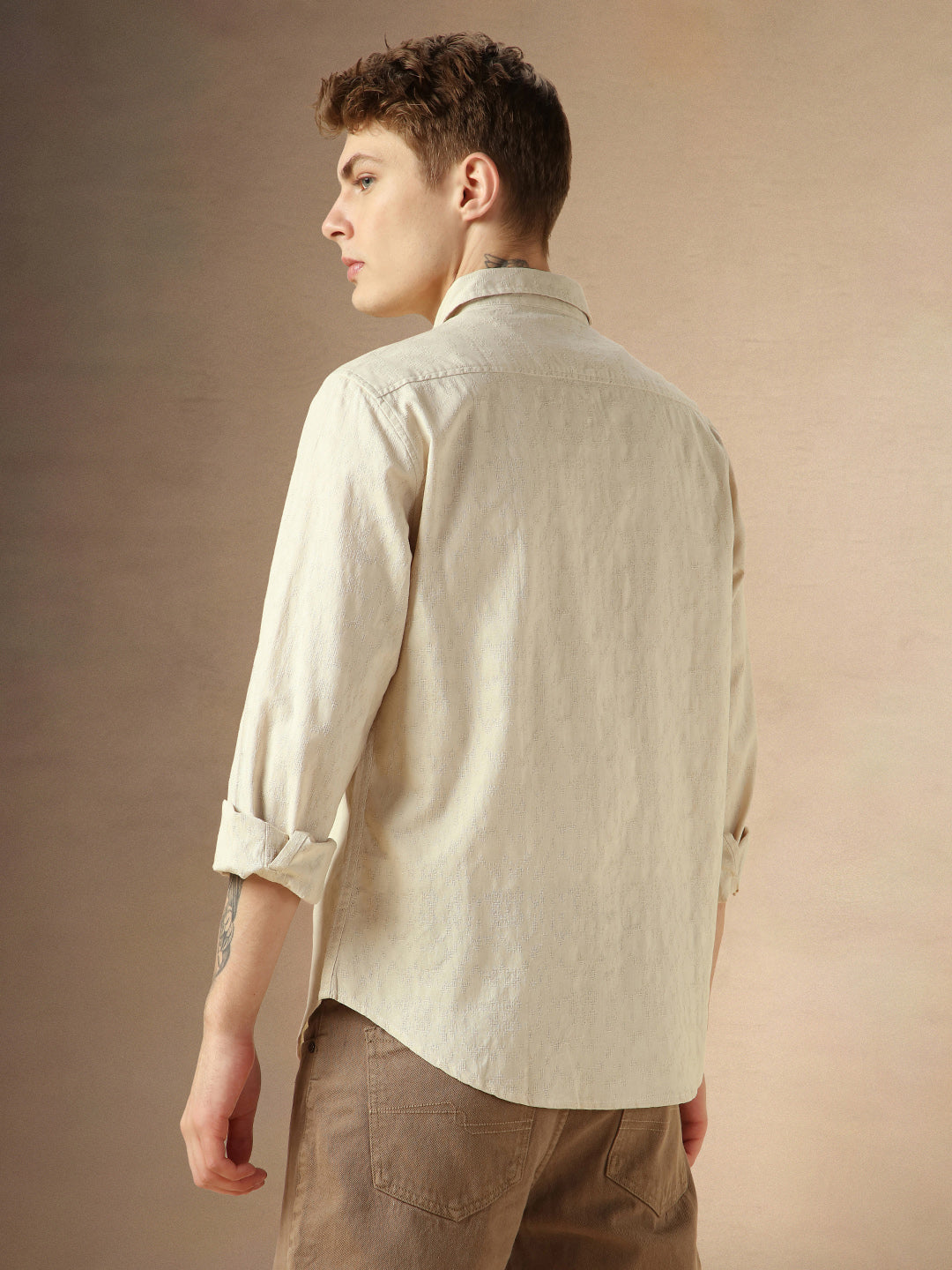 Men's Beige Solid Textured Spread Collar Full Sleeves Casual Shirt