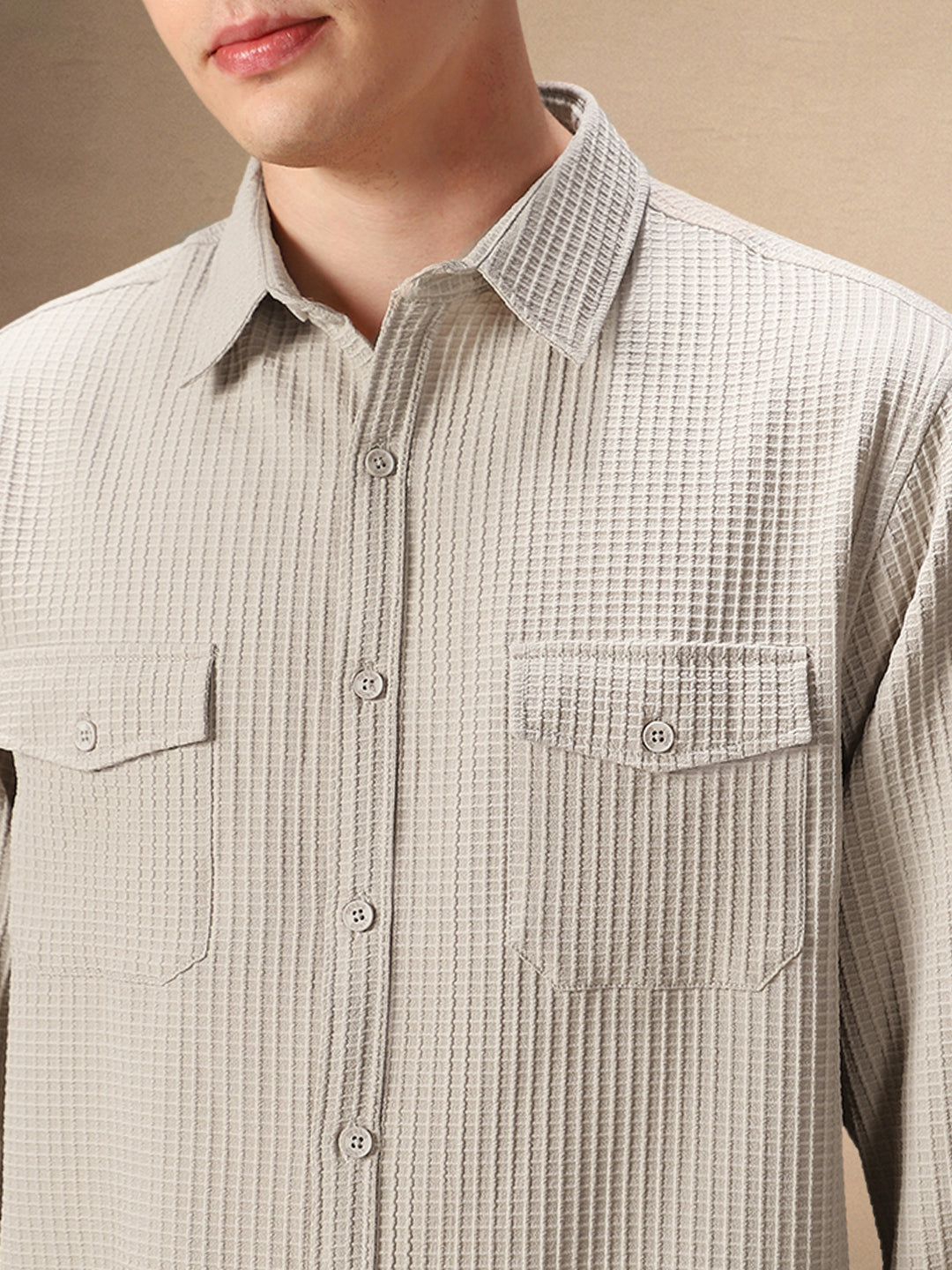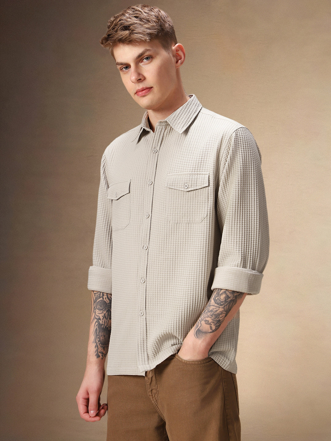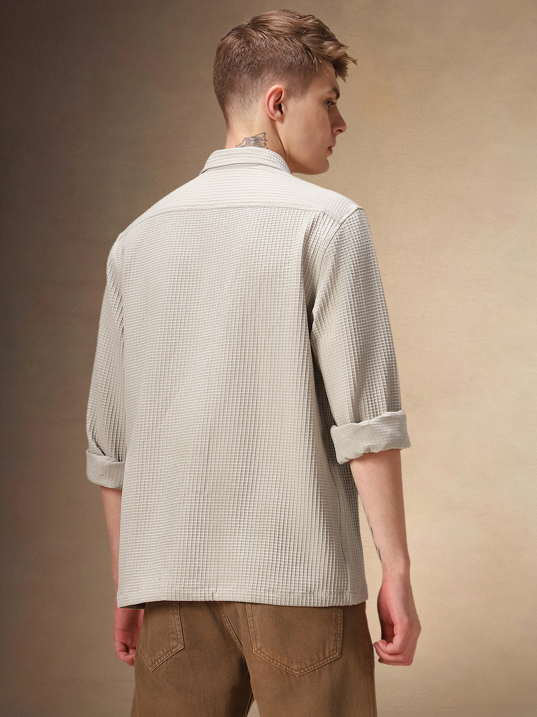 Men's Beige Solid Textured Spread Collar Full Sleeves Casual Shirt