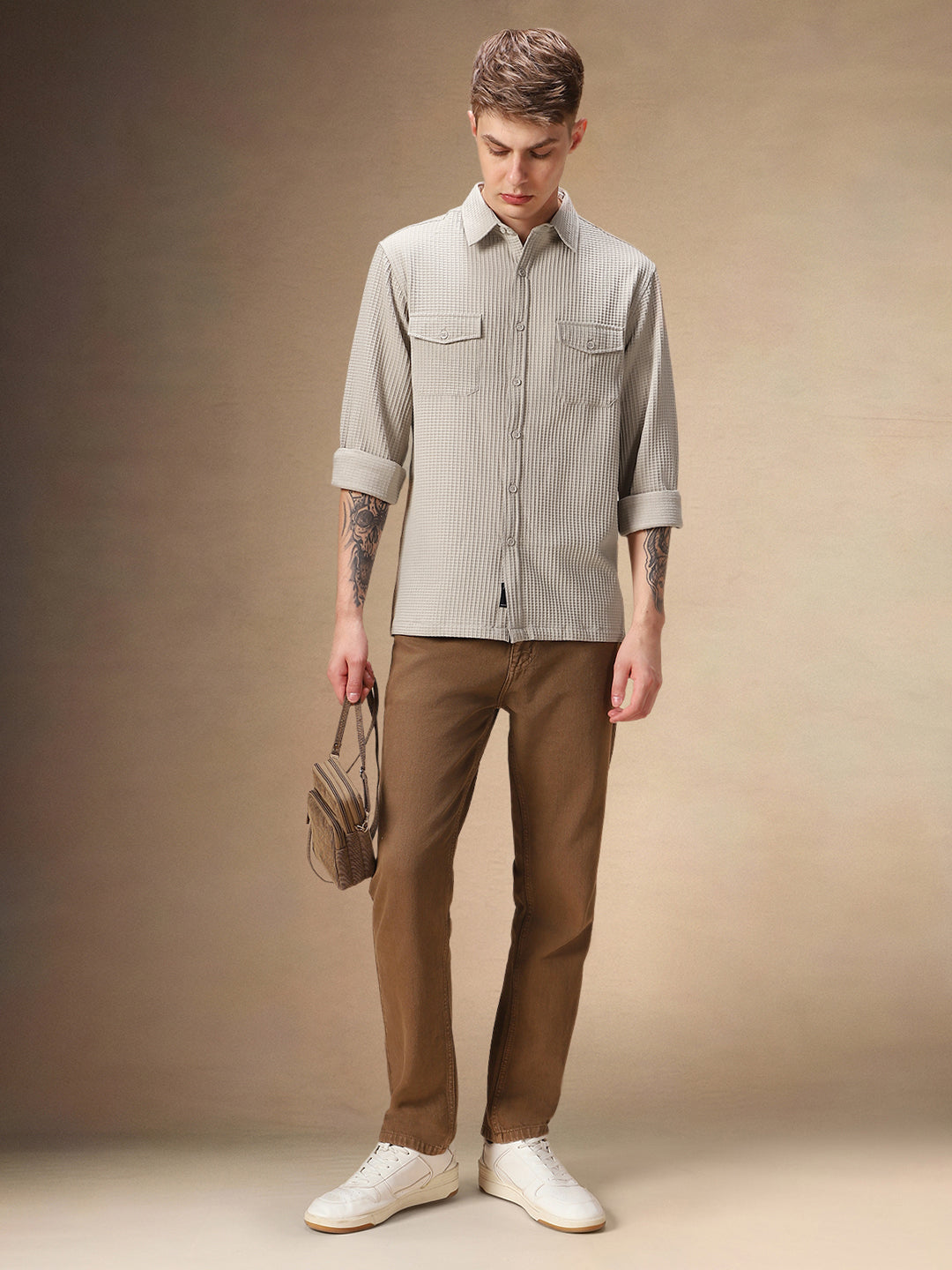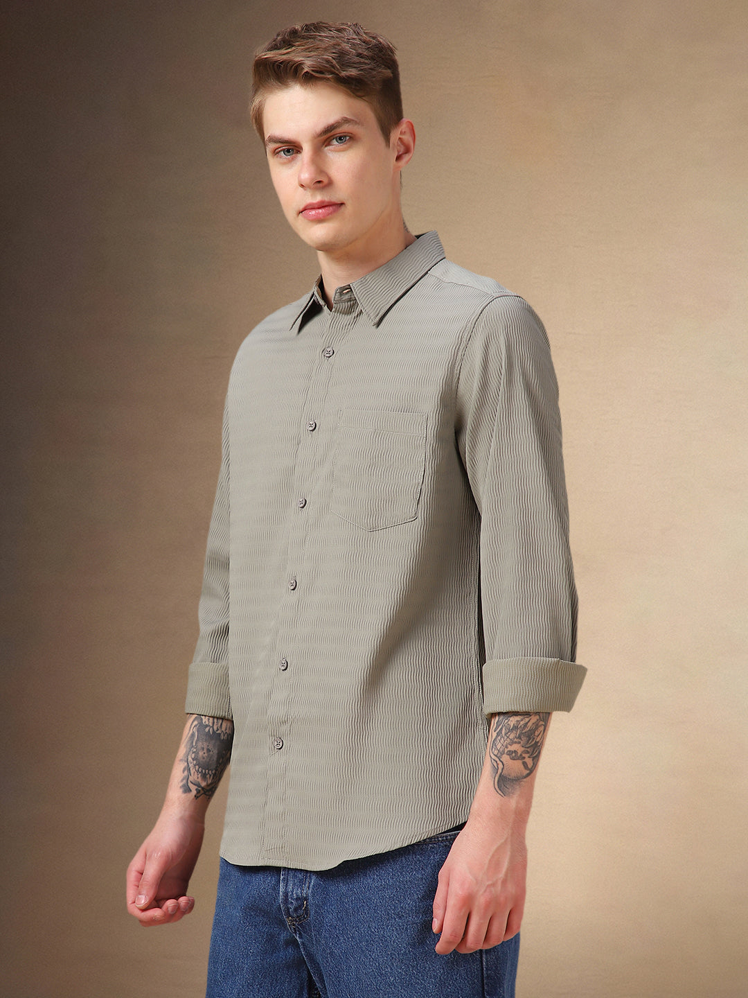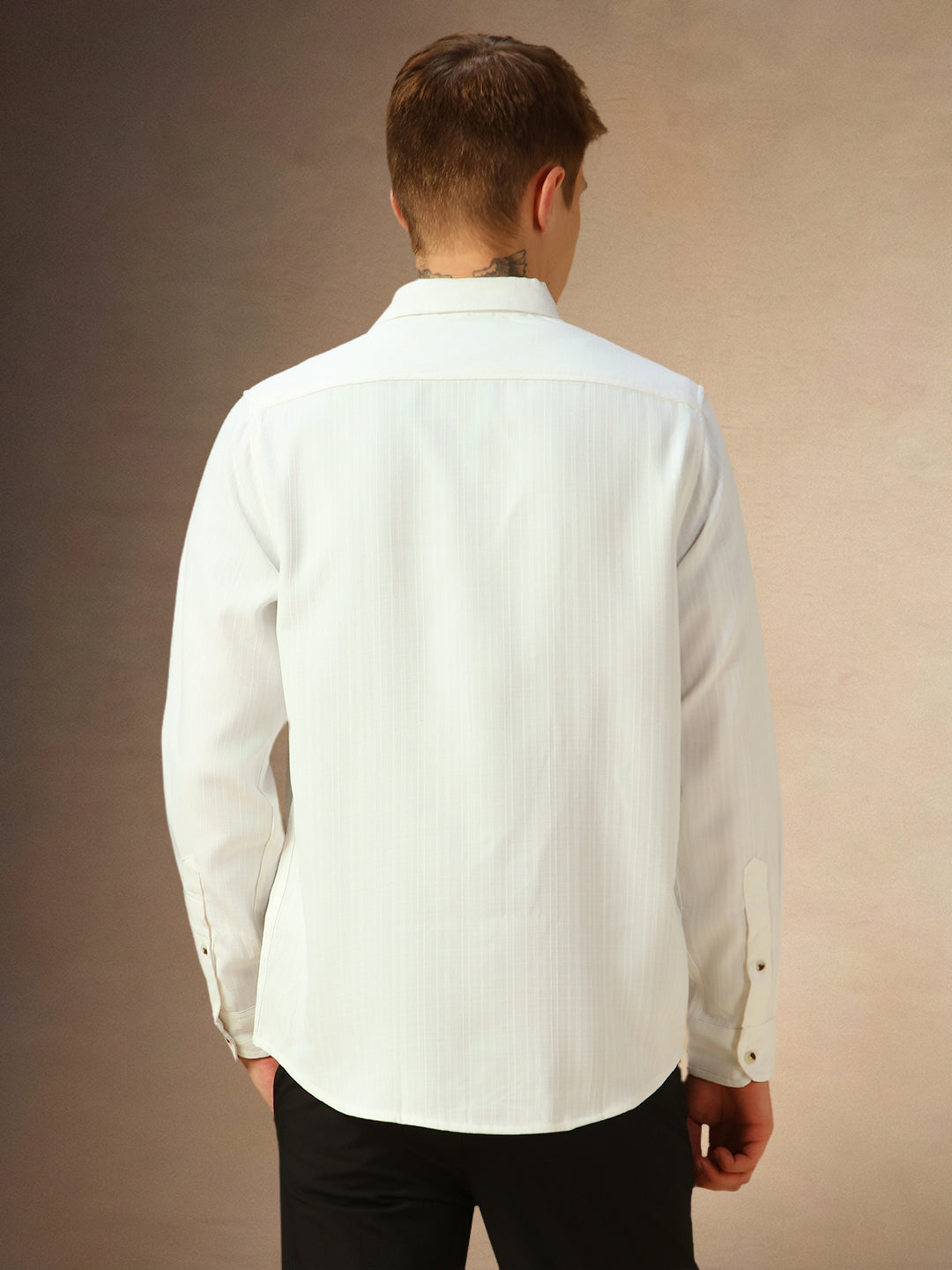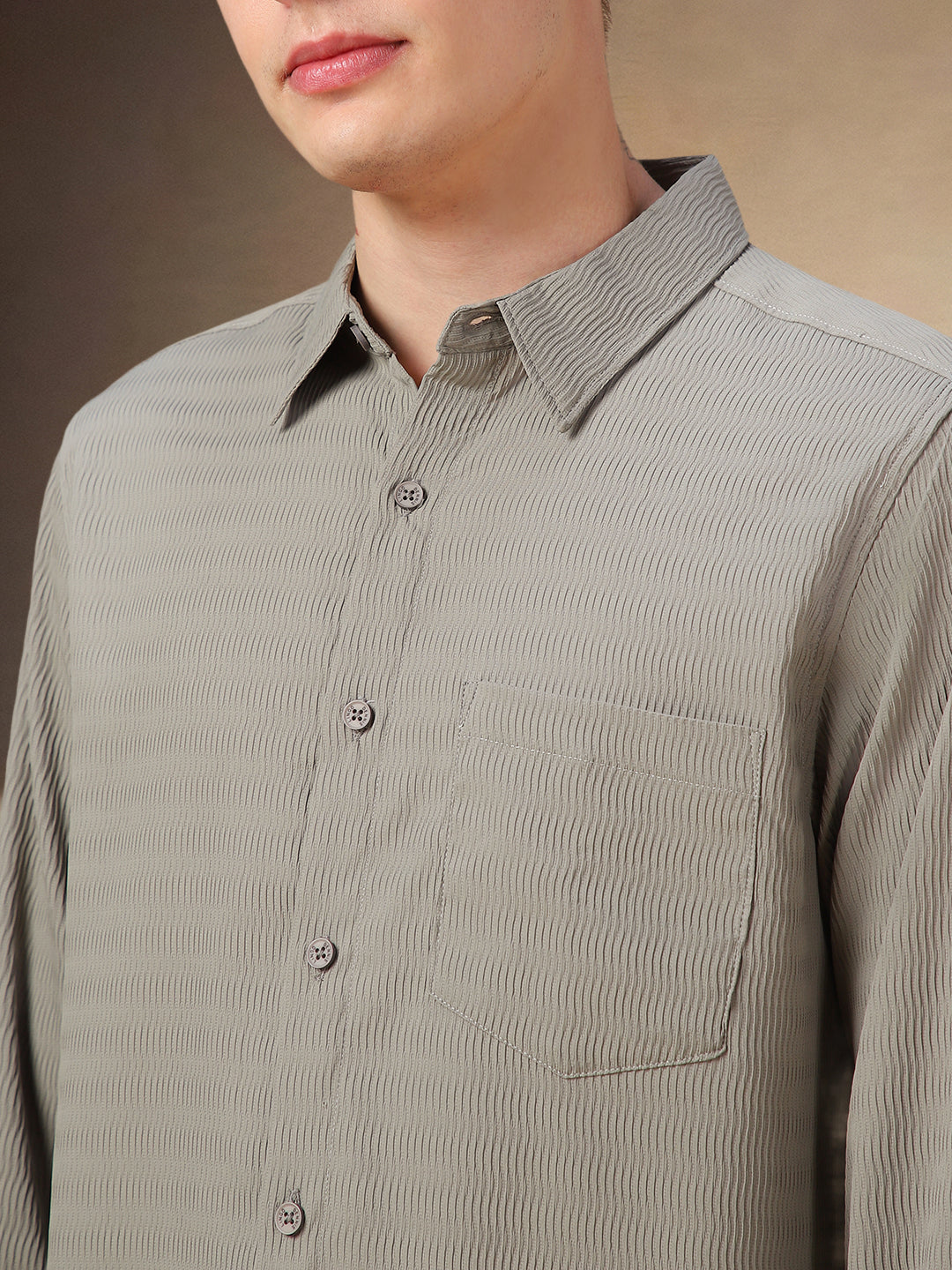 Men's Beige Solid Textured Spread Collar Full Sleeves Casual Shirt