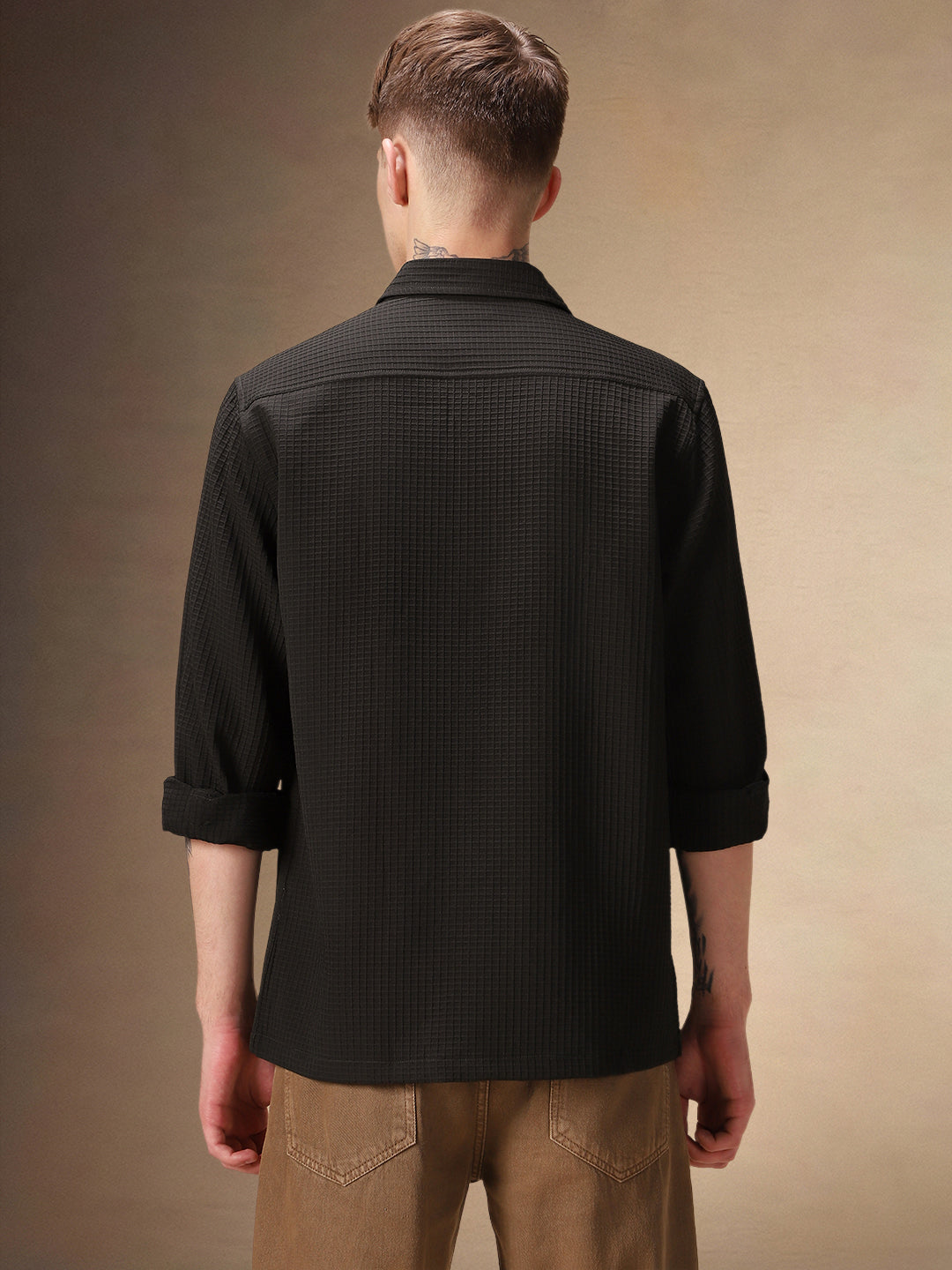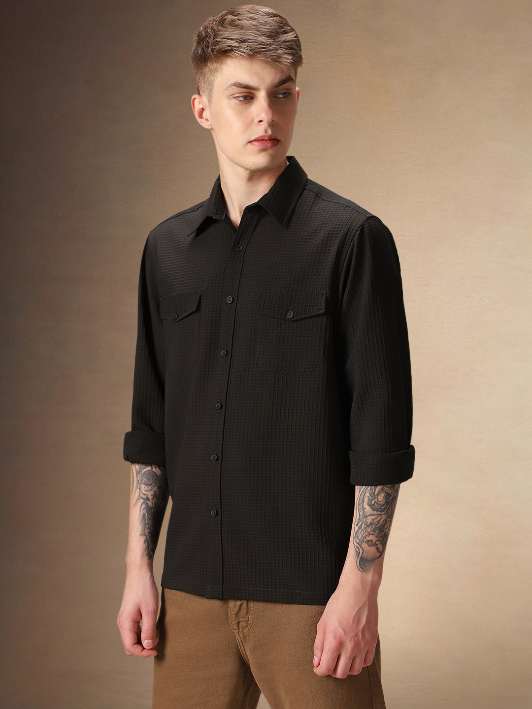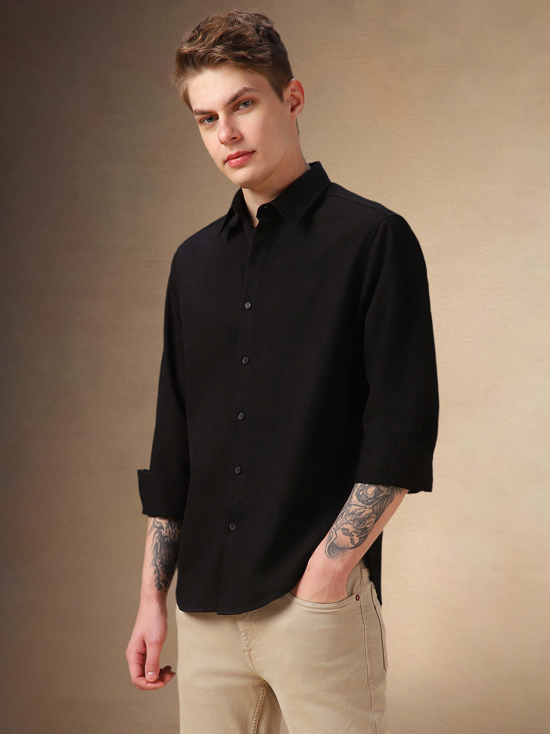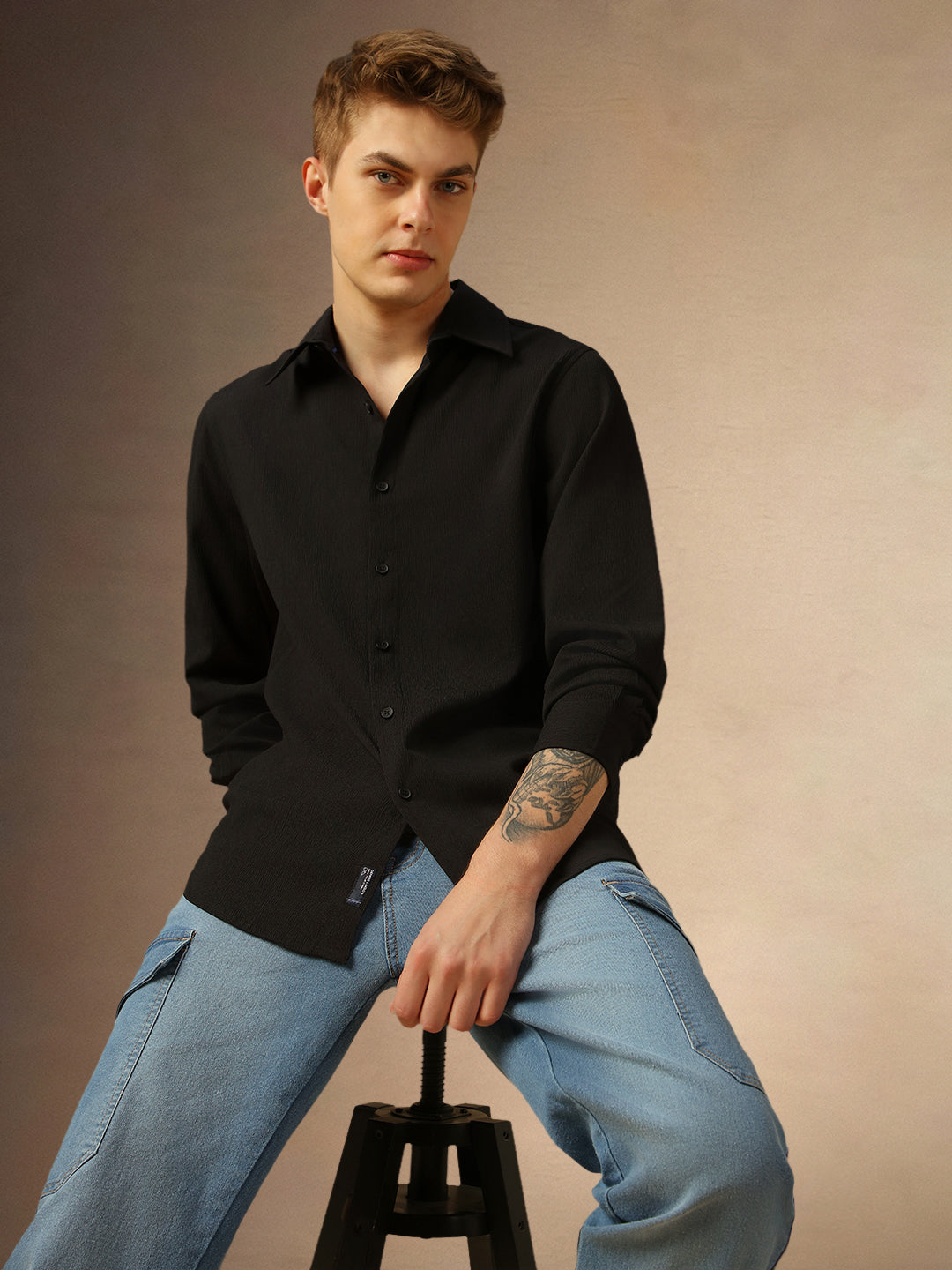 Men's Black Solid Textured Spread Collar Full Sleeves Casual Shirt