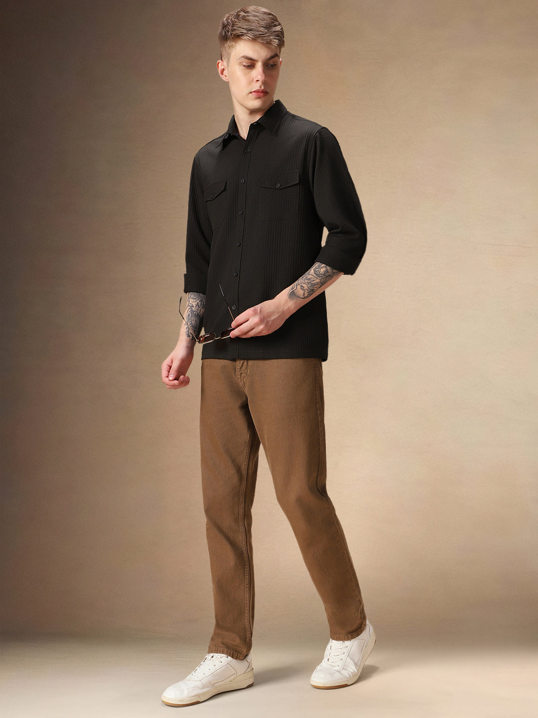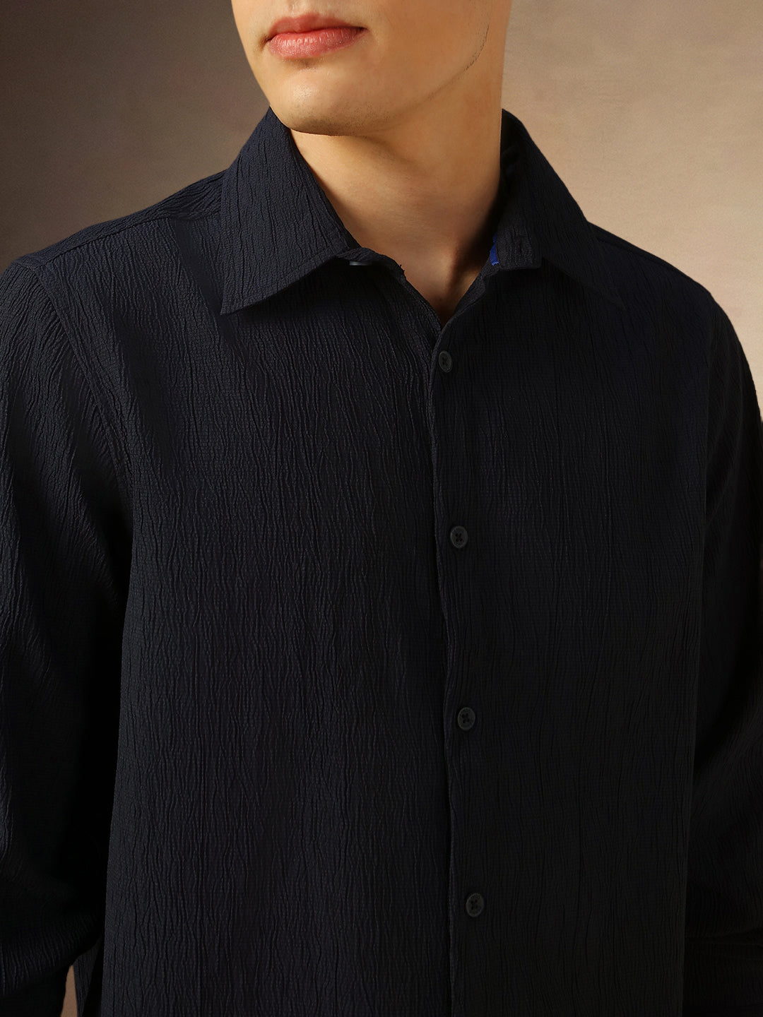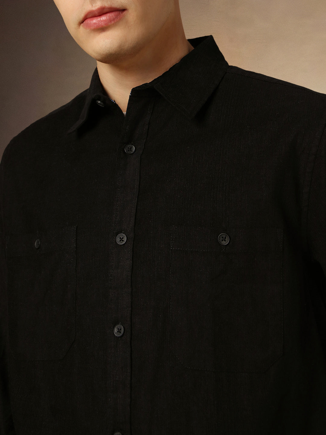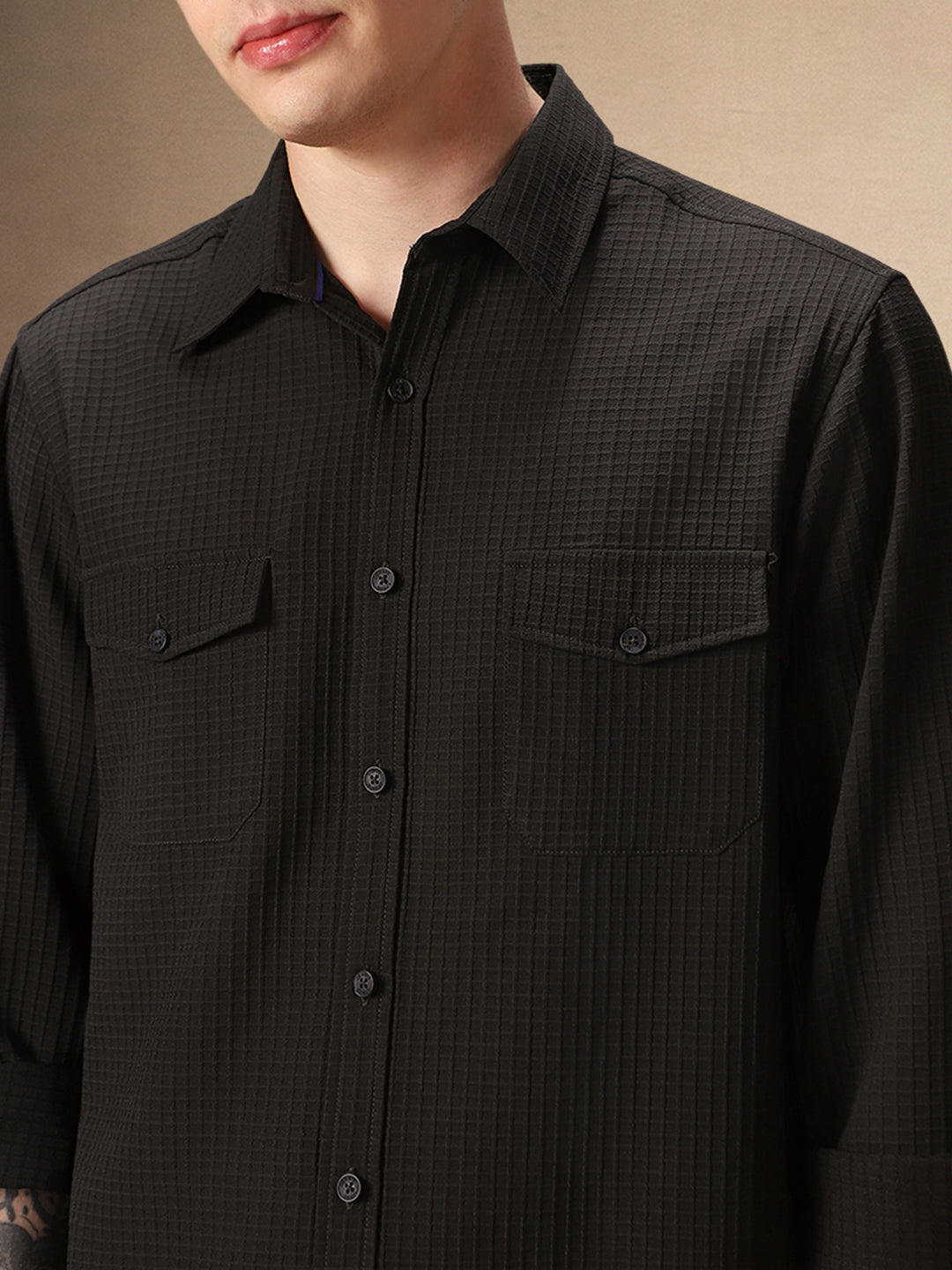 Men's Black Solid Textured Spread Collar Full Sleeves Casual Shirt