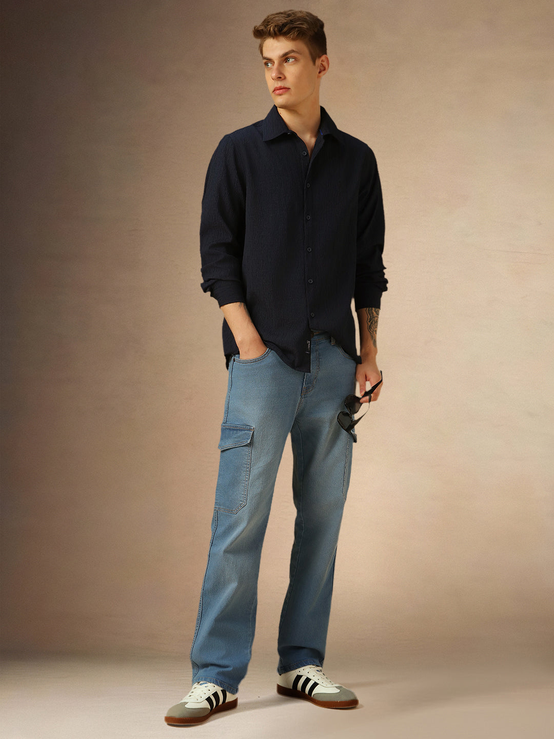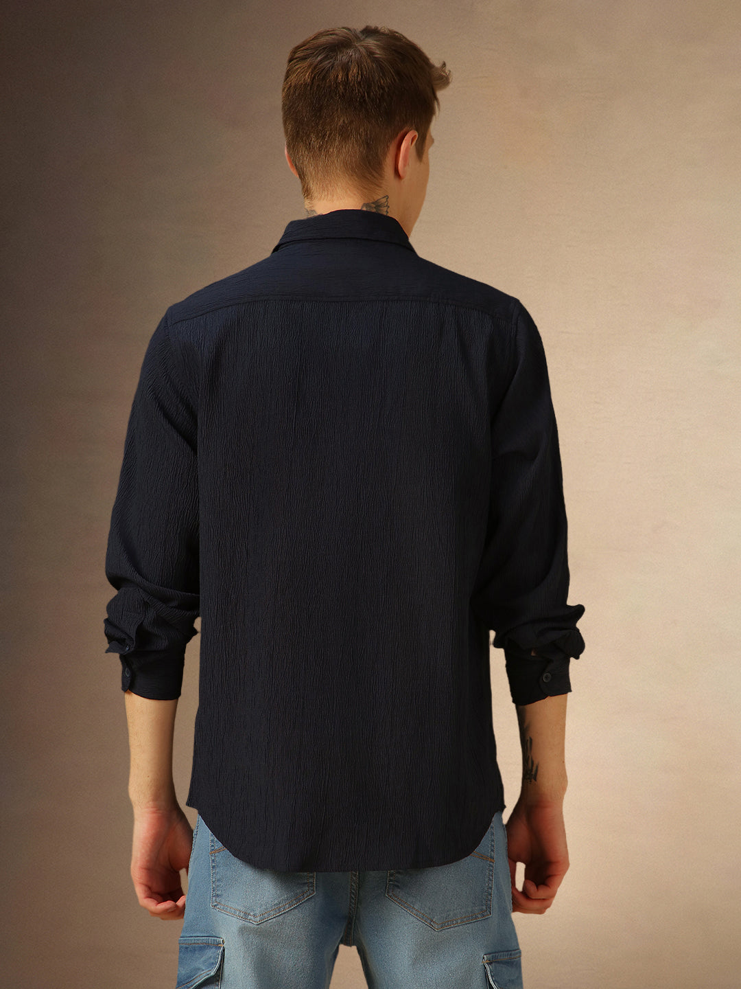 Men's Solid Blue Textured Full Sleeves Spread Collar Casual shirt