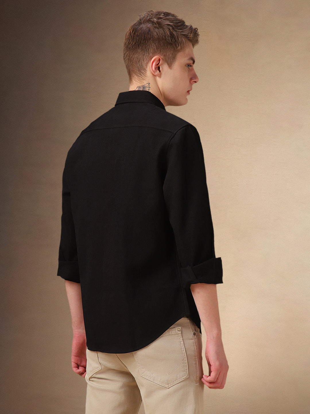Men's Black Solid Spread Collar Full Sleeves Corduroy Shirt