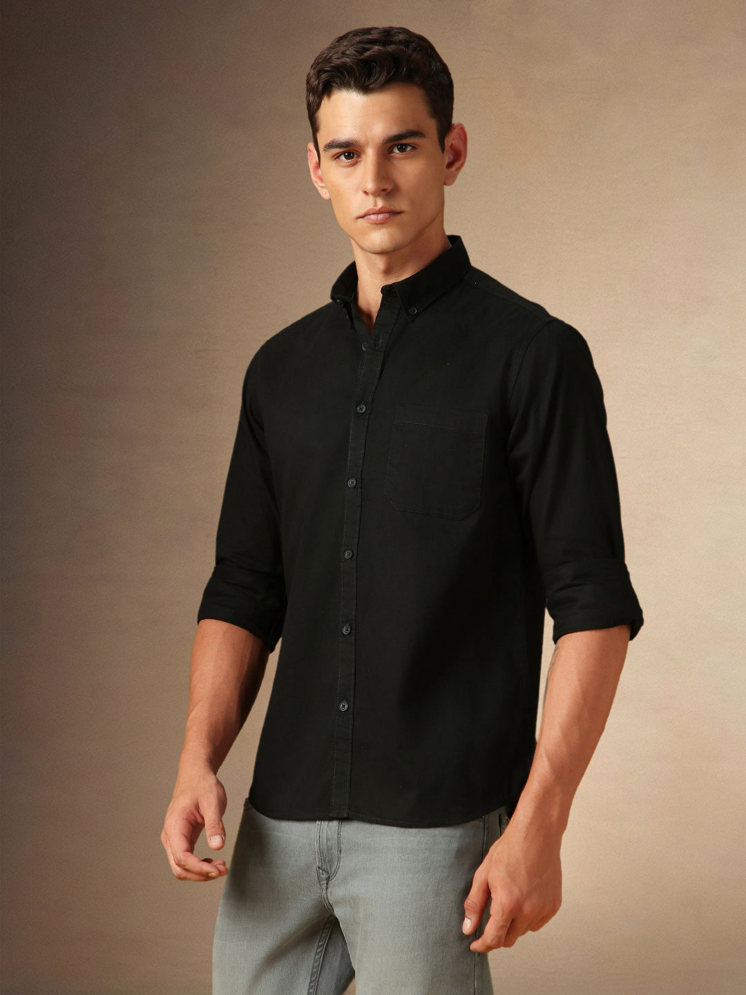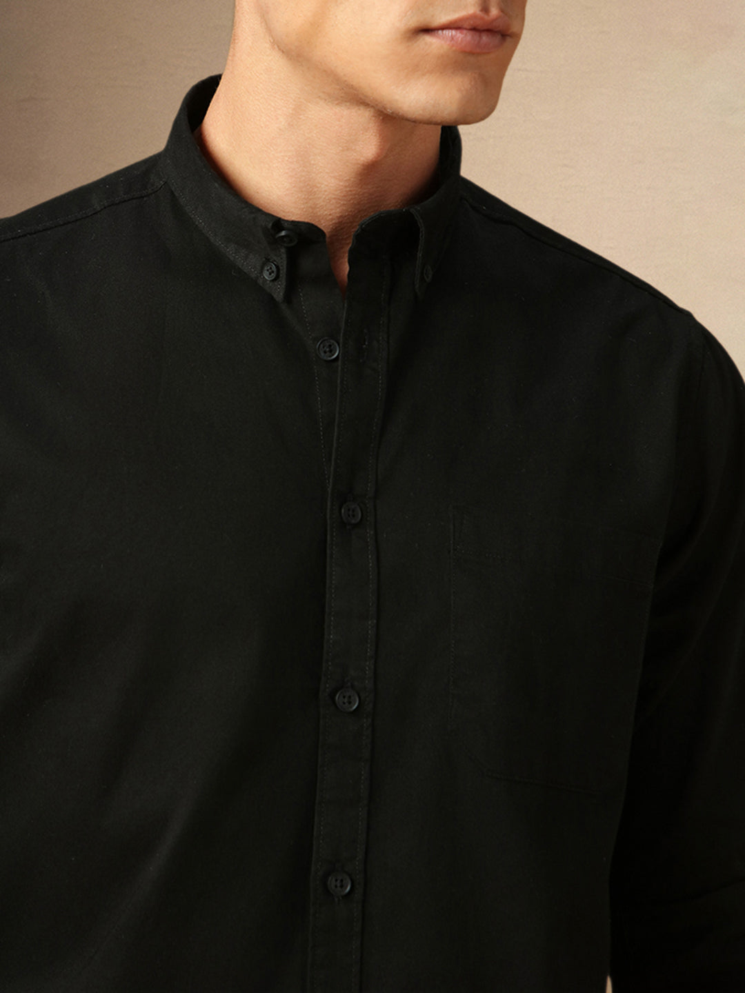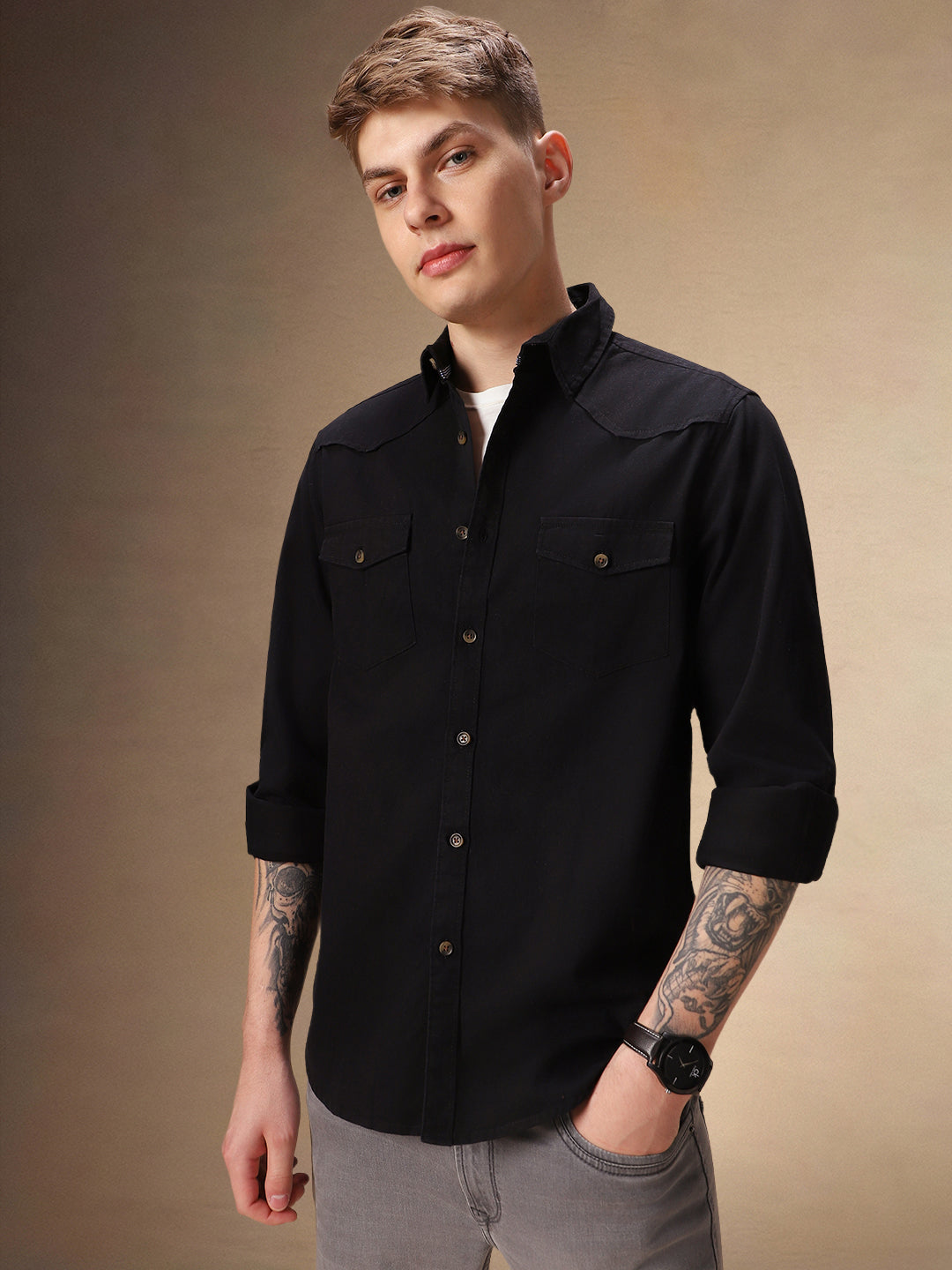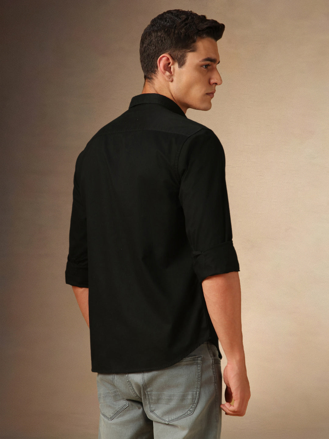 Men's Solid Black Full Sleeves Spread Collar Casual Shirt