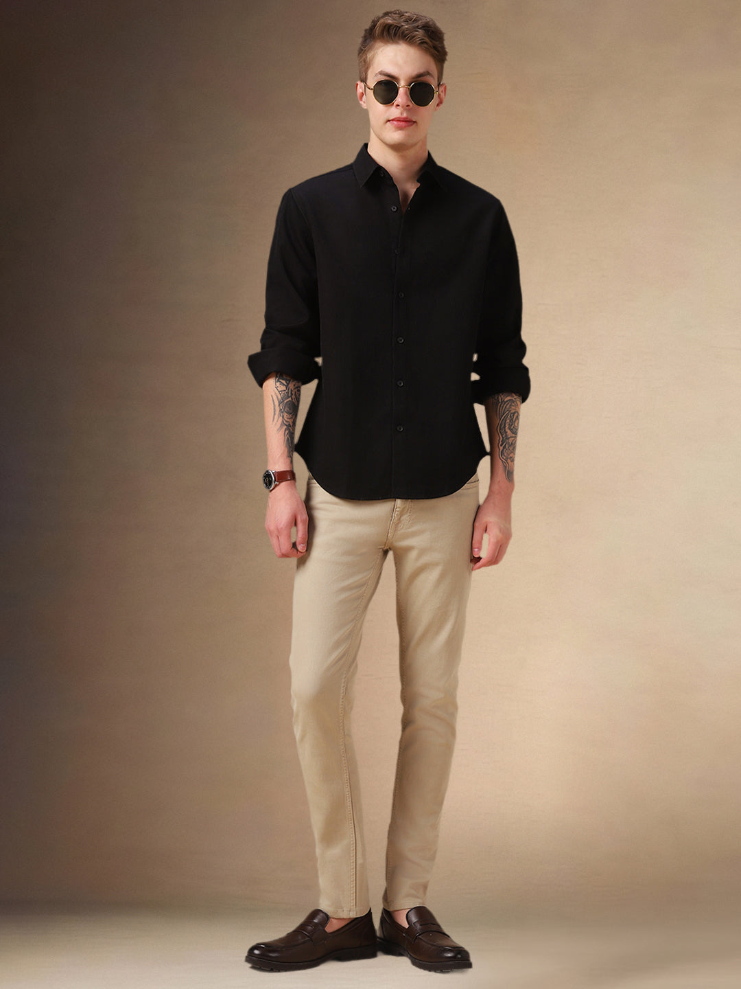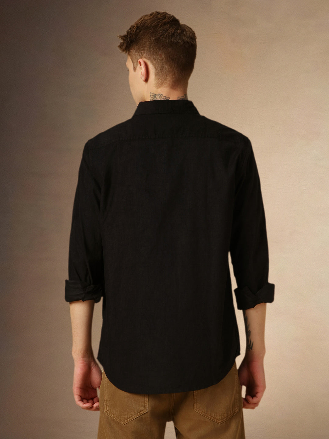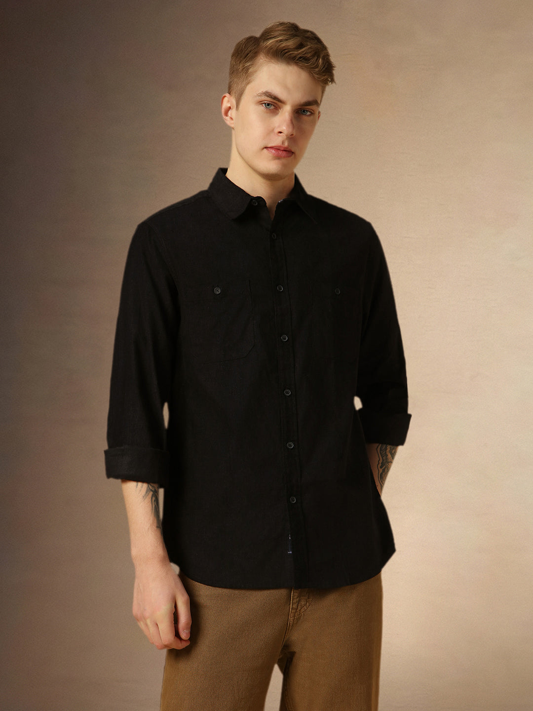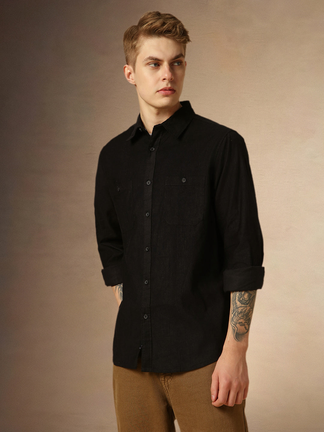 Men's Solid Black Full Sleeves Spread Collar Casual Shirt