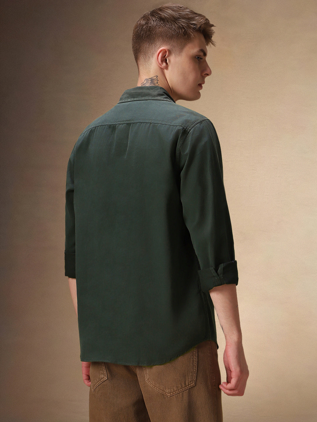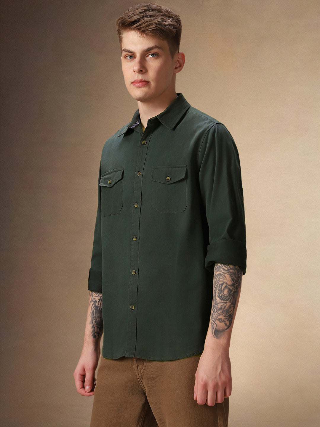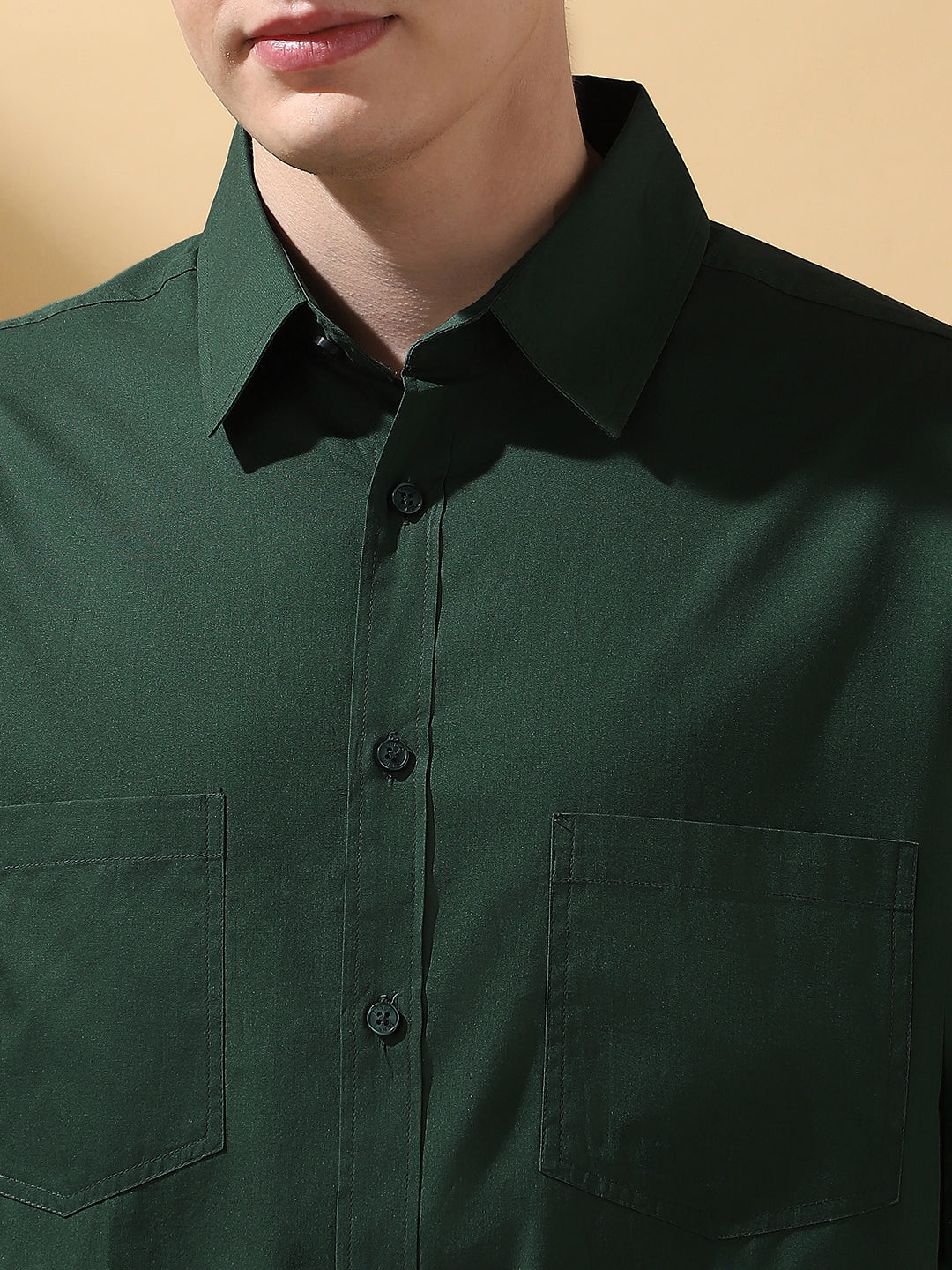 Men's Solid Dark Green Full Sleeves Spread Collar Casual Shirt