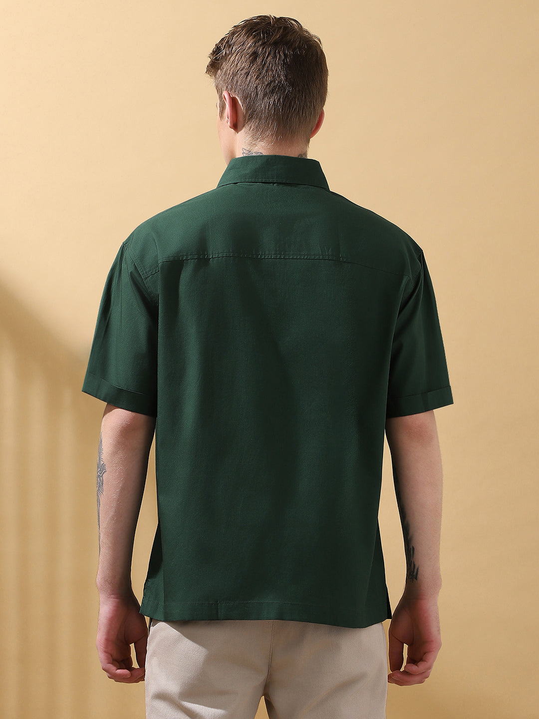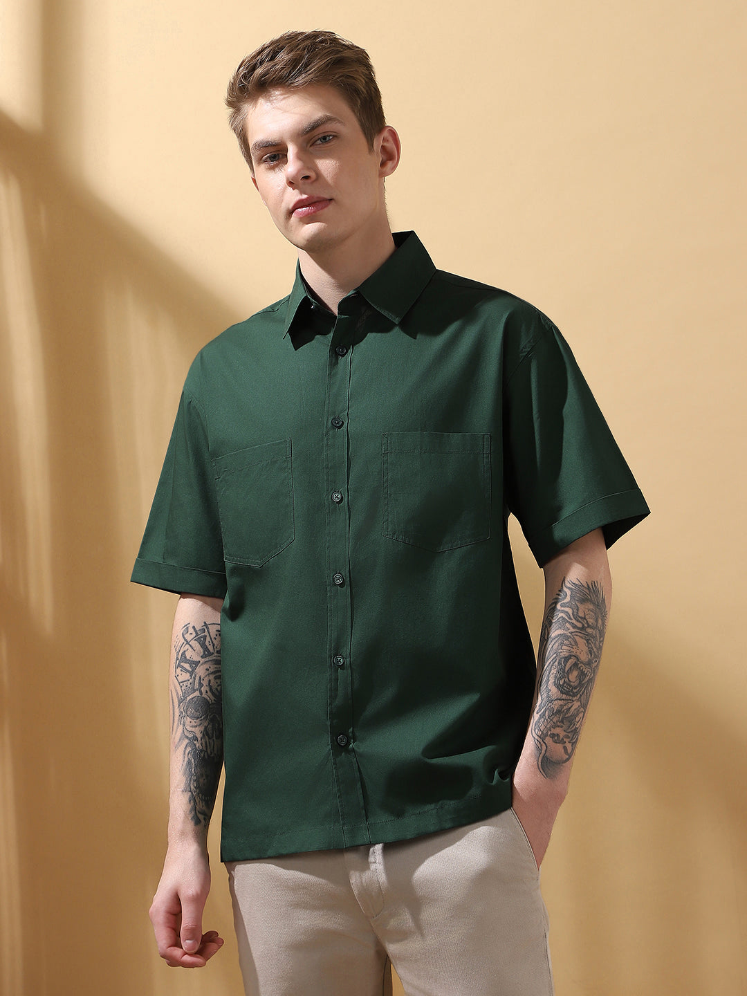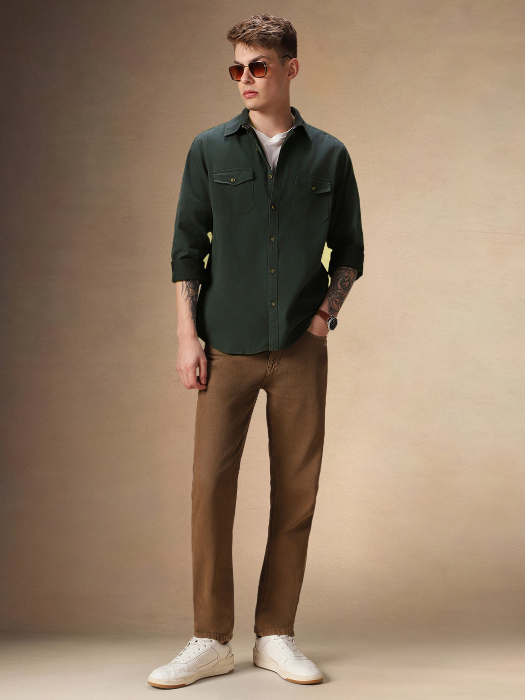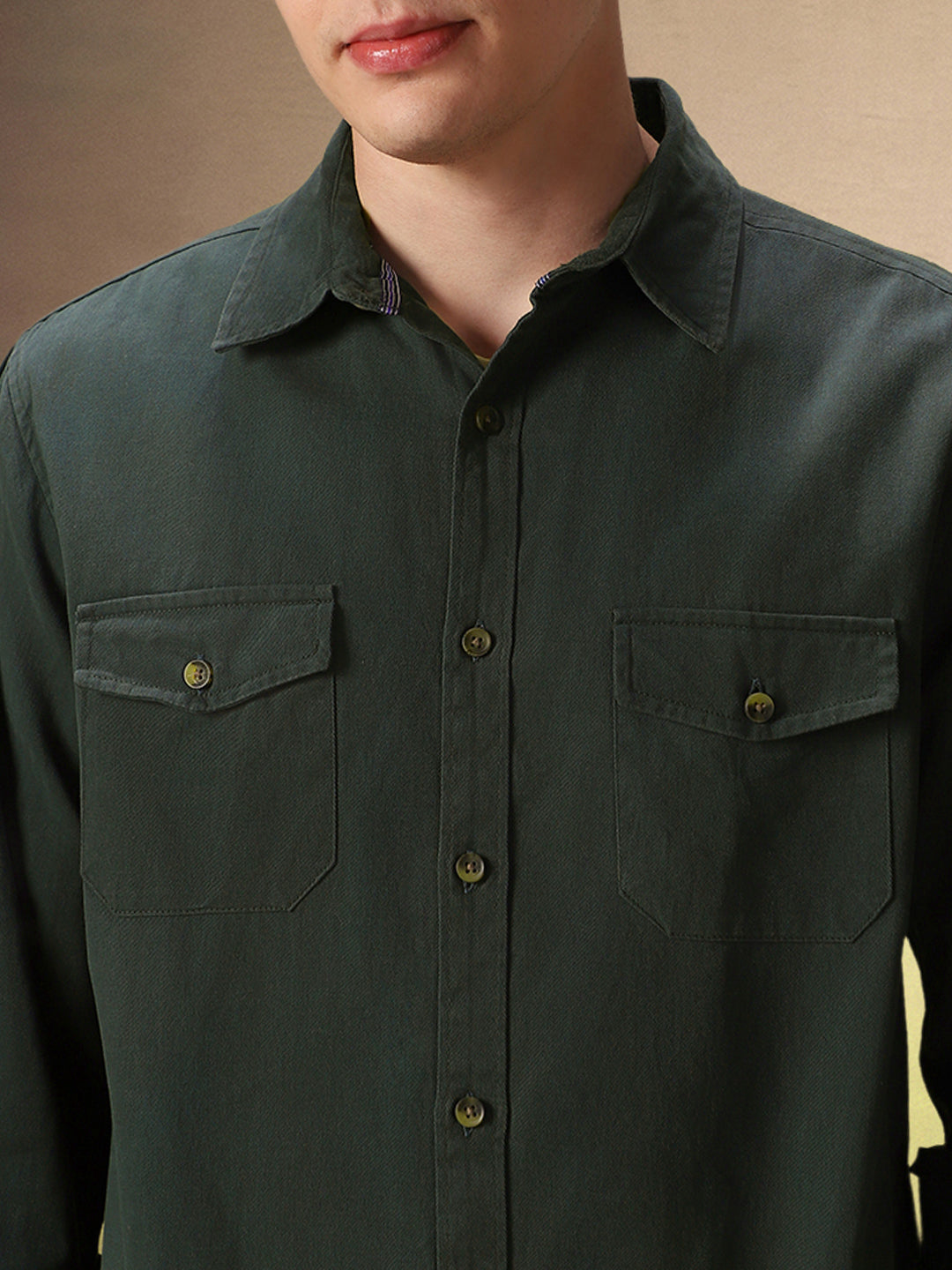 Men's Solid Dark Green Full Sleeves Spread Collar Casual Shirt