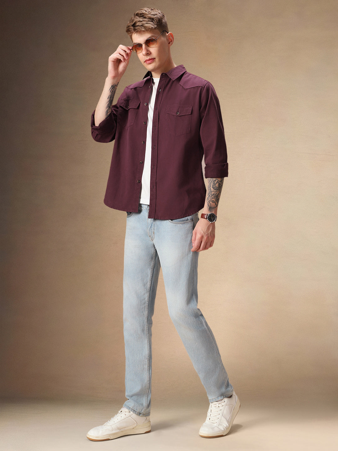 Men's Solid Maroon Full Sleeves Spread Collar Casual Shirt