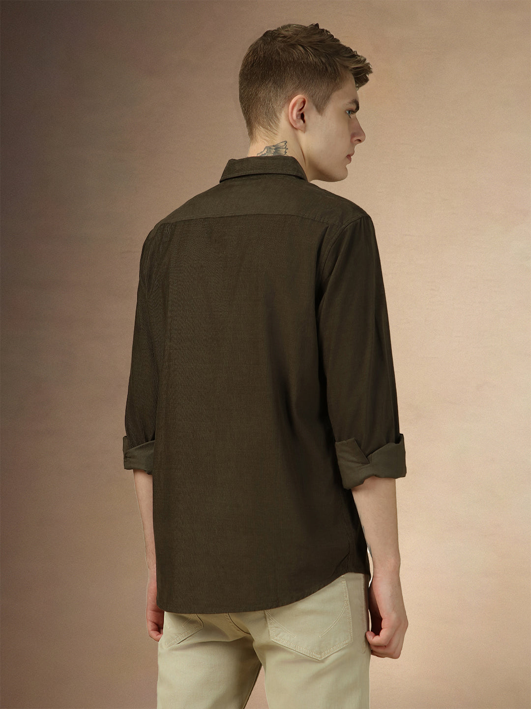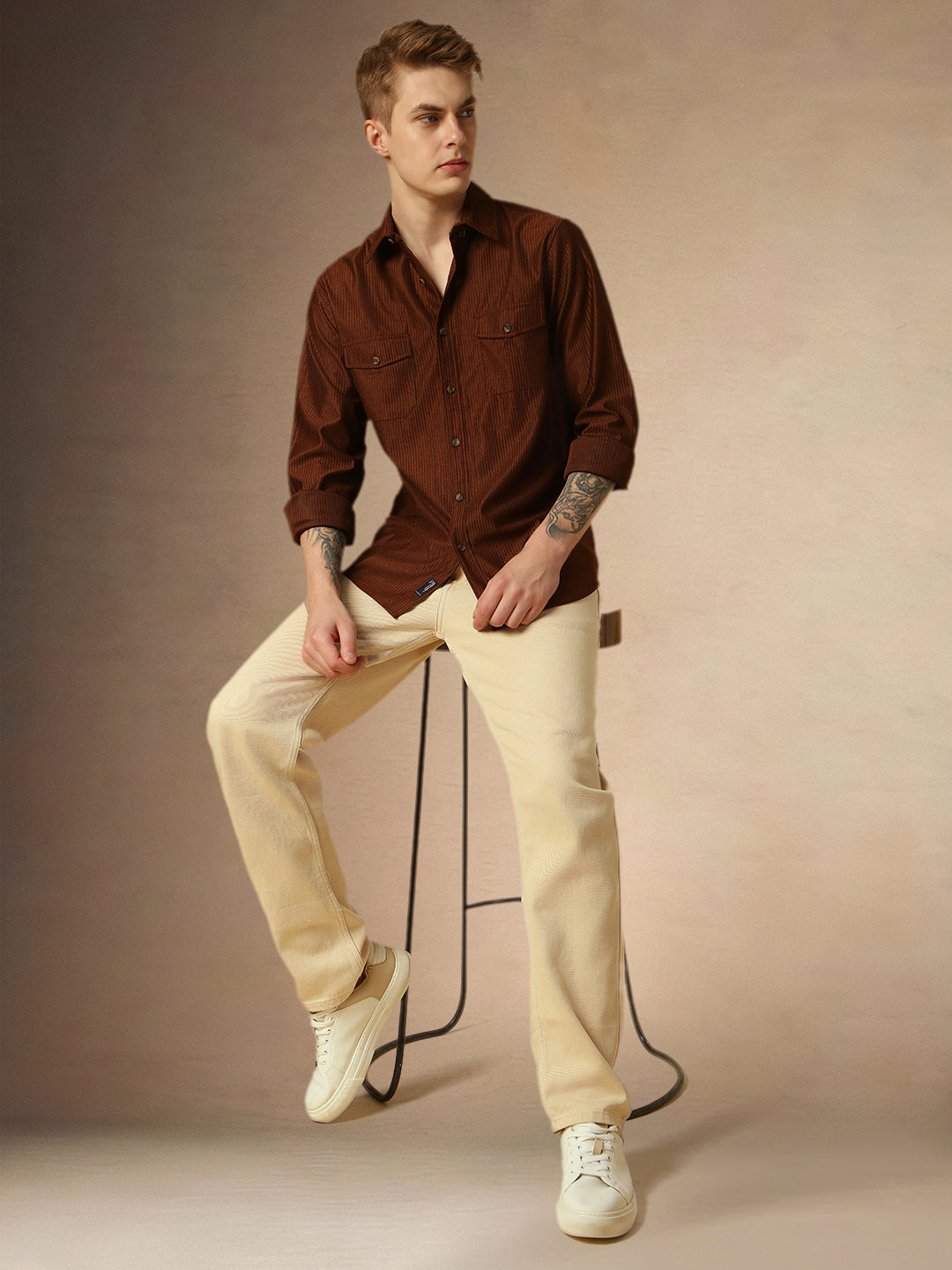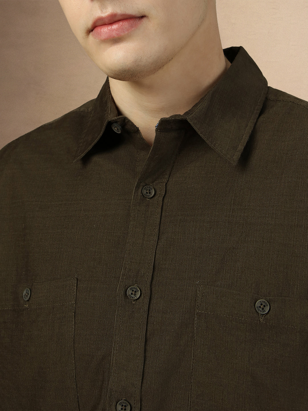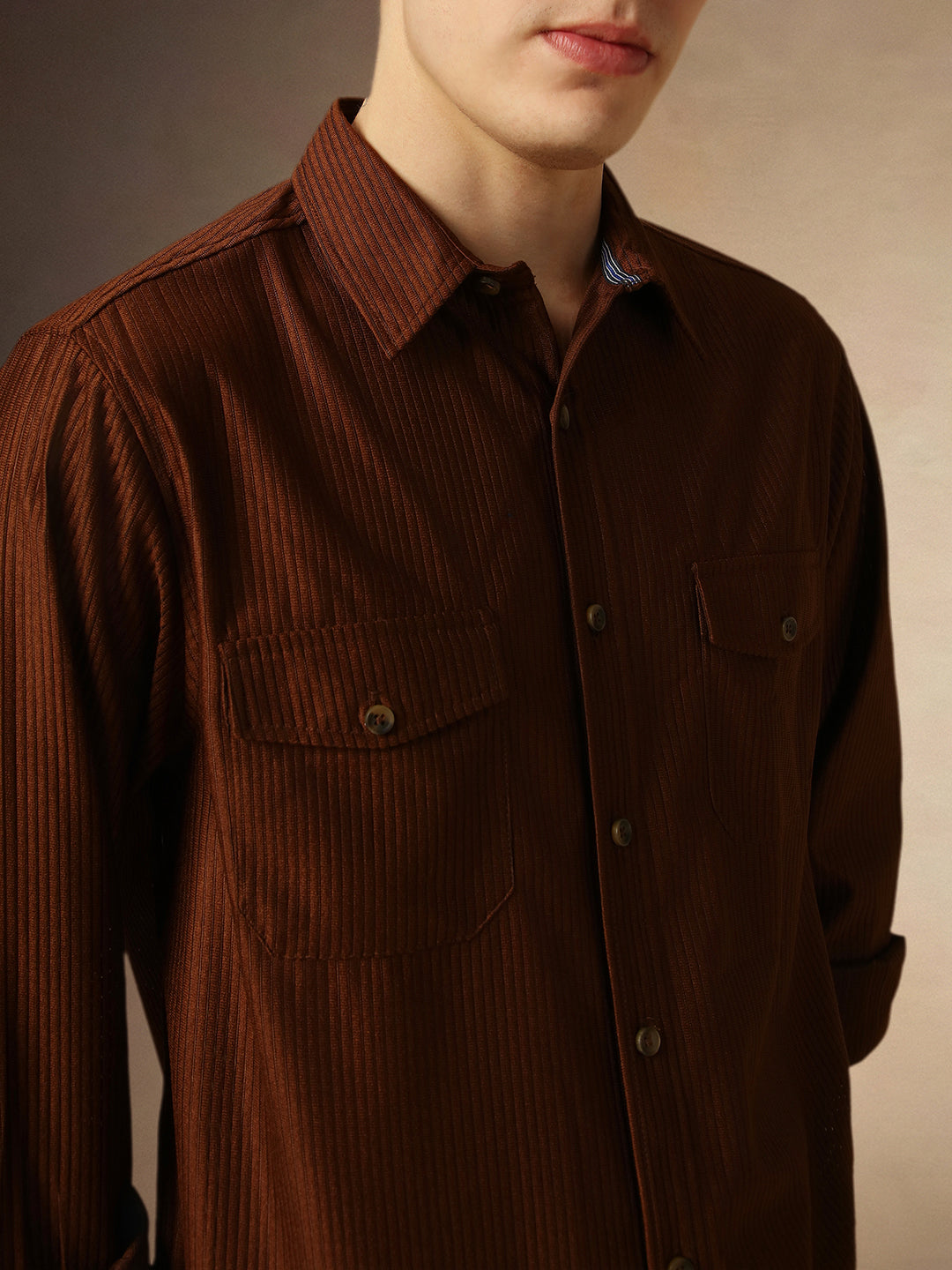 Men's Brown Solid Spread Collar Full Sleeves Relaxed Fit Corduroy/Textured Shirt