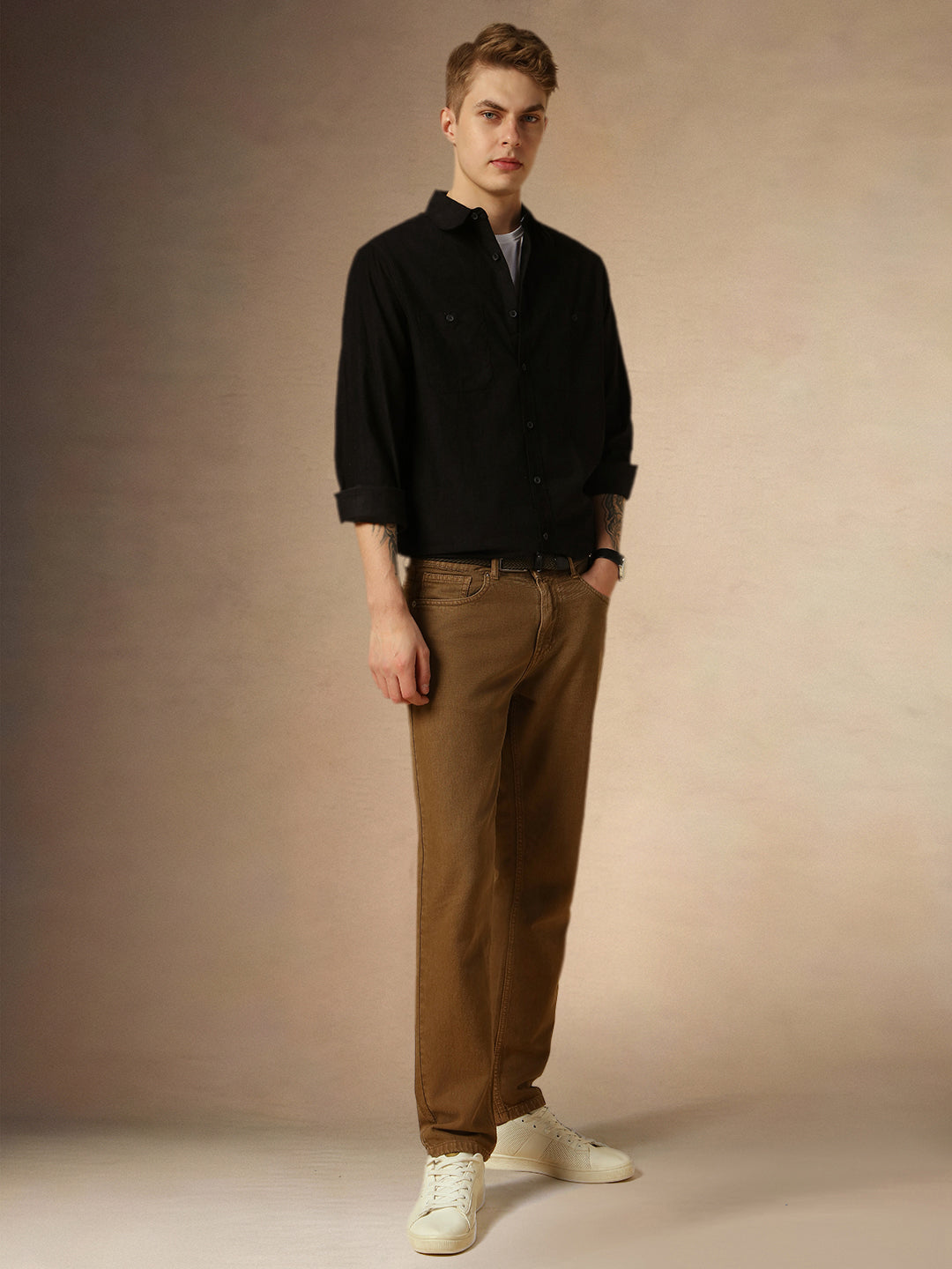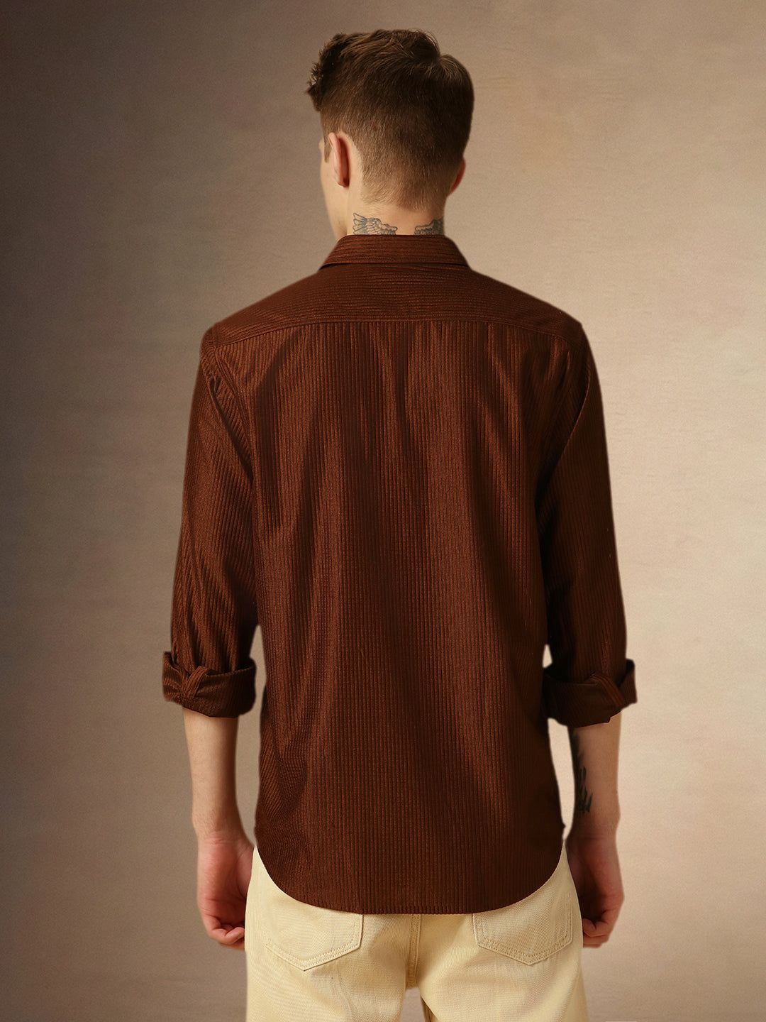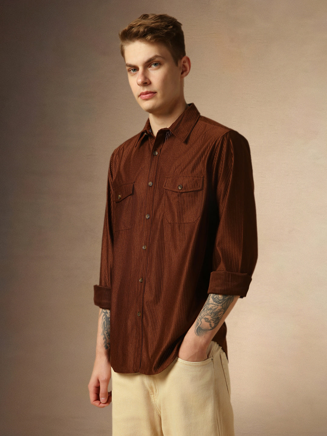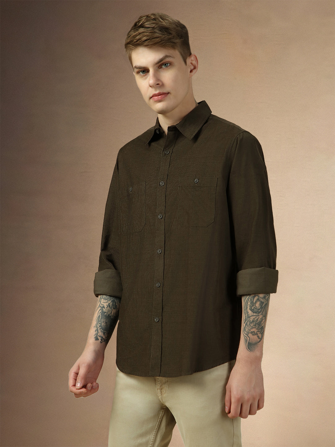 Men's Brown Solid Spread Collar Full Sleeves Relaxed Fit Corduroy/Textured Shirt