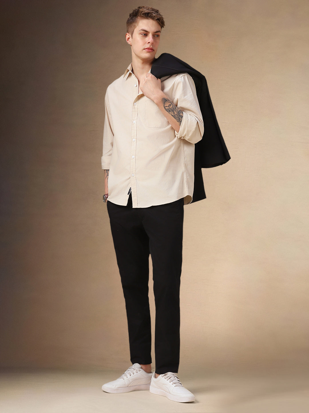 Men's Beige Cotton Spread Collar Full Sleeves Solid Shirt