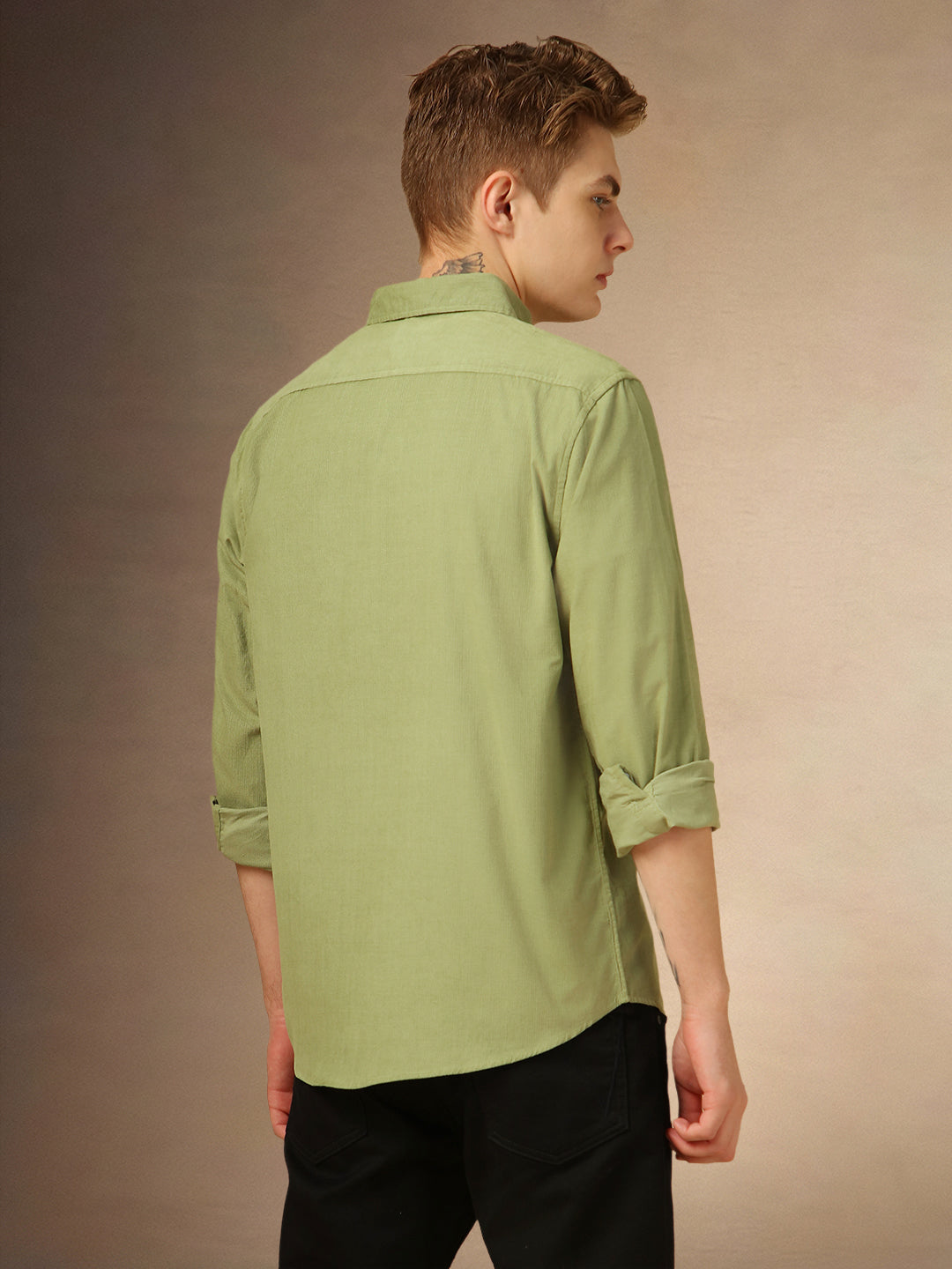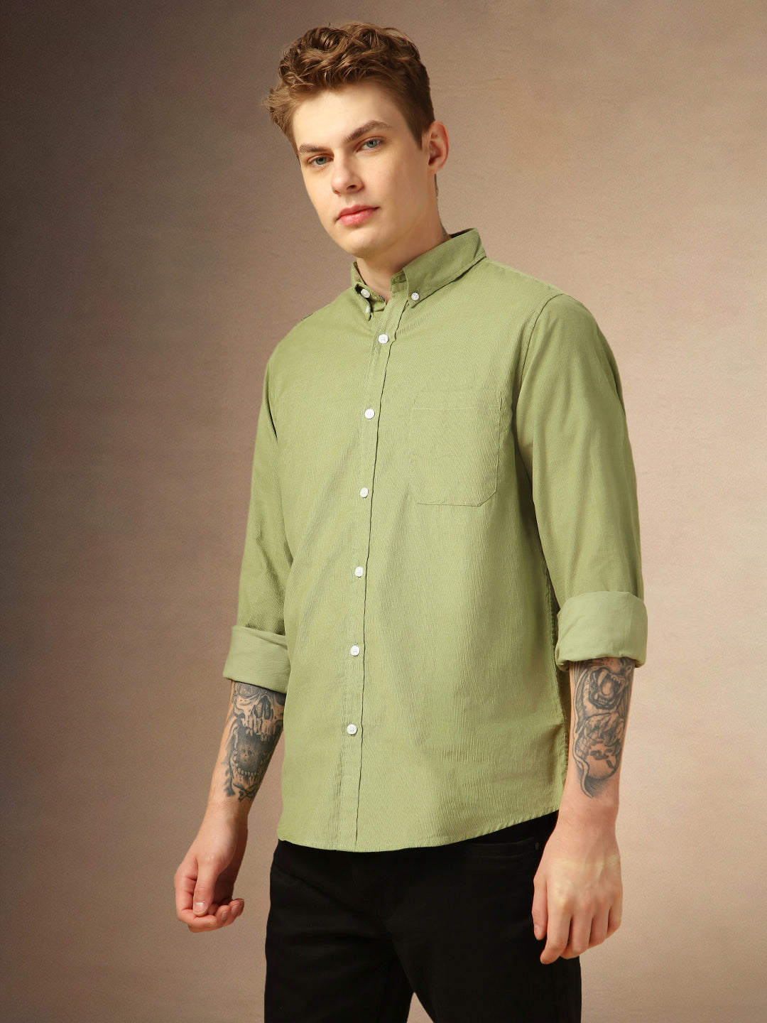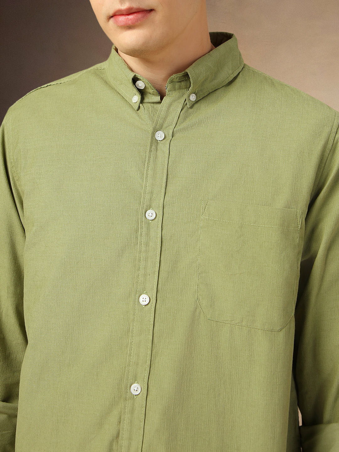 Men's Green Solid Button Down Collar Full Sleeves Relaxed Fit Corduroy Shirt