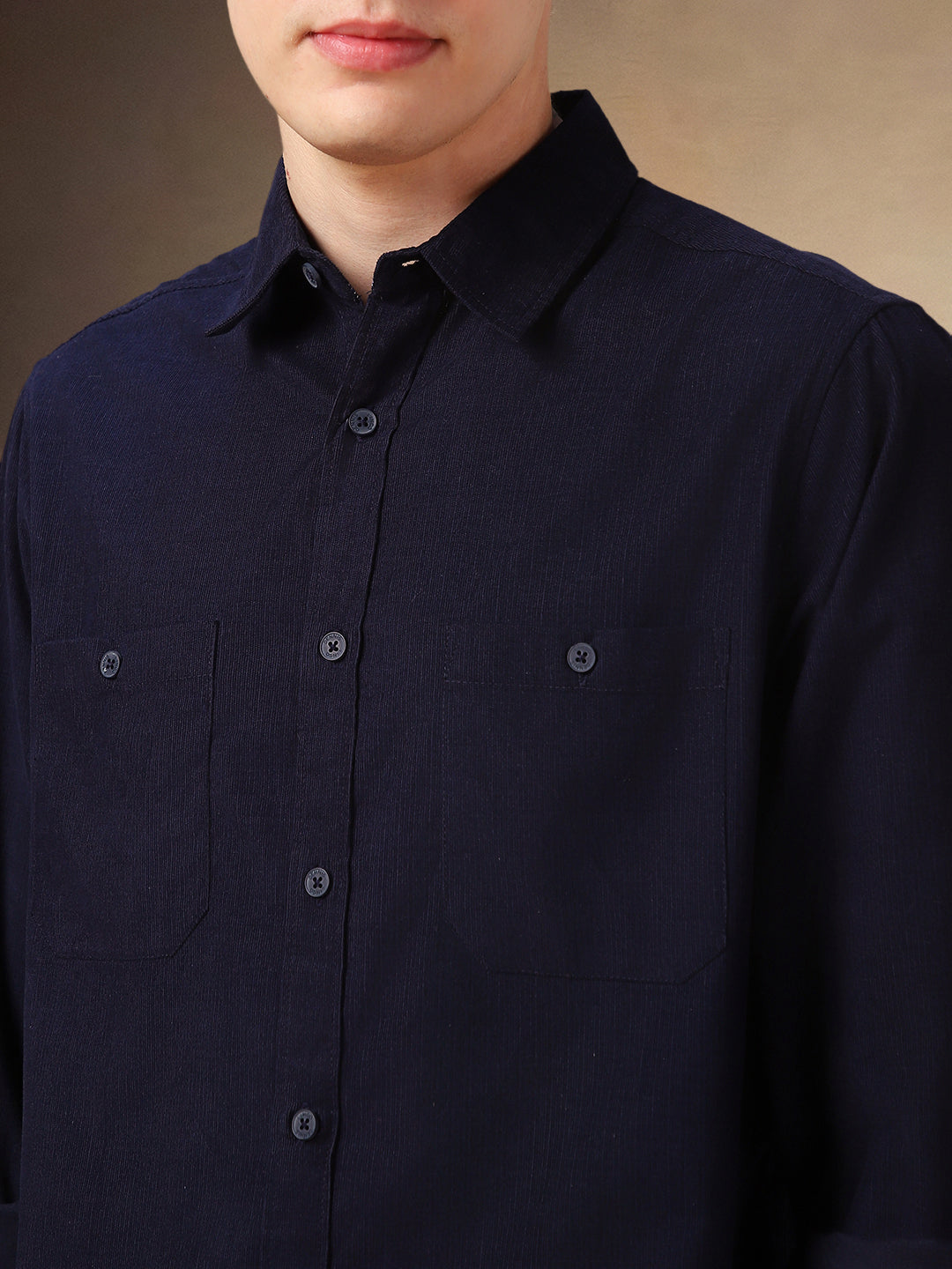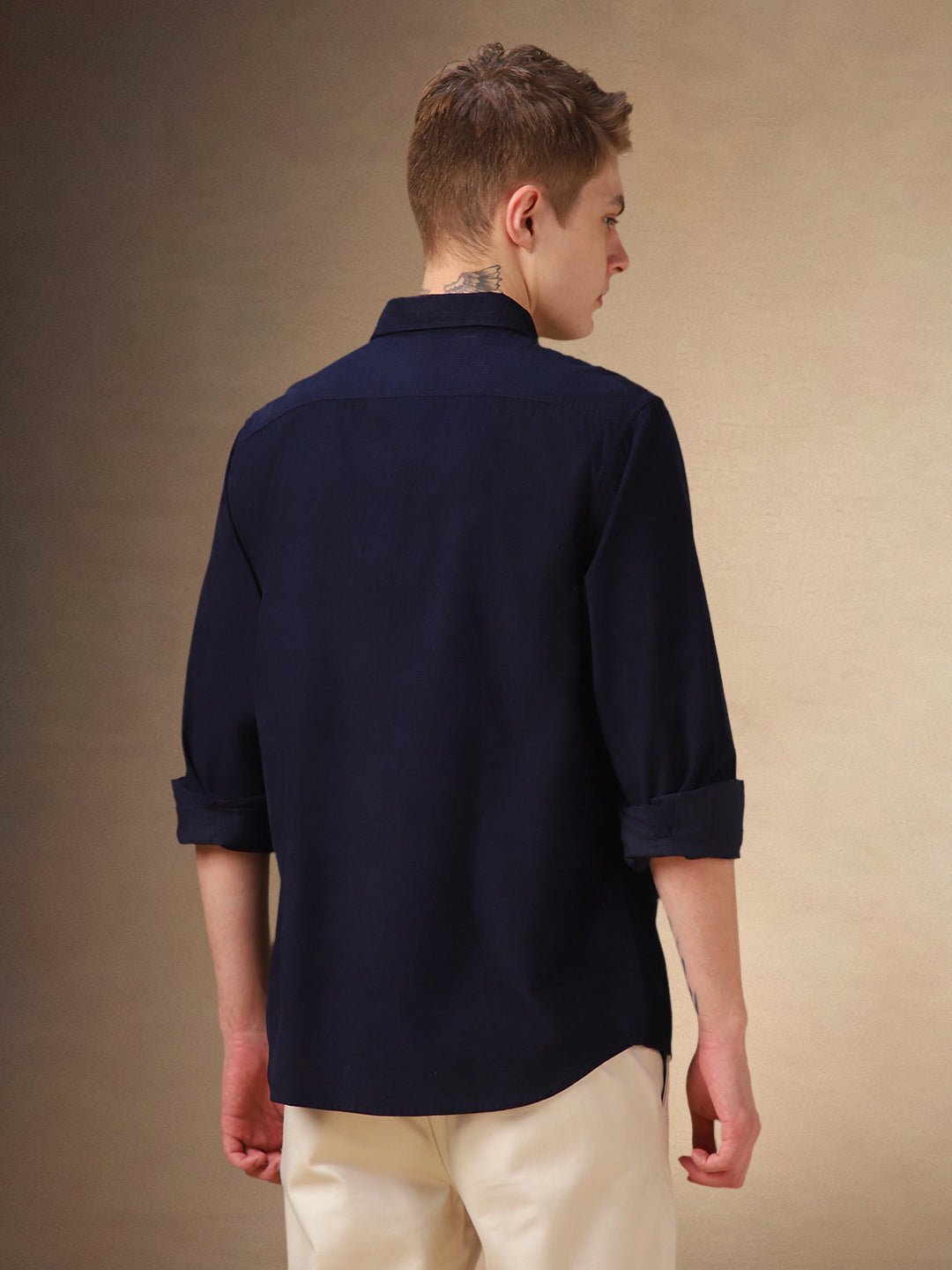 Men's Navy Blue Solid Spread Collar Full Sleeves Corduroy Shirt