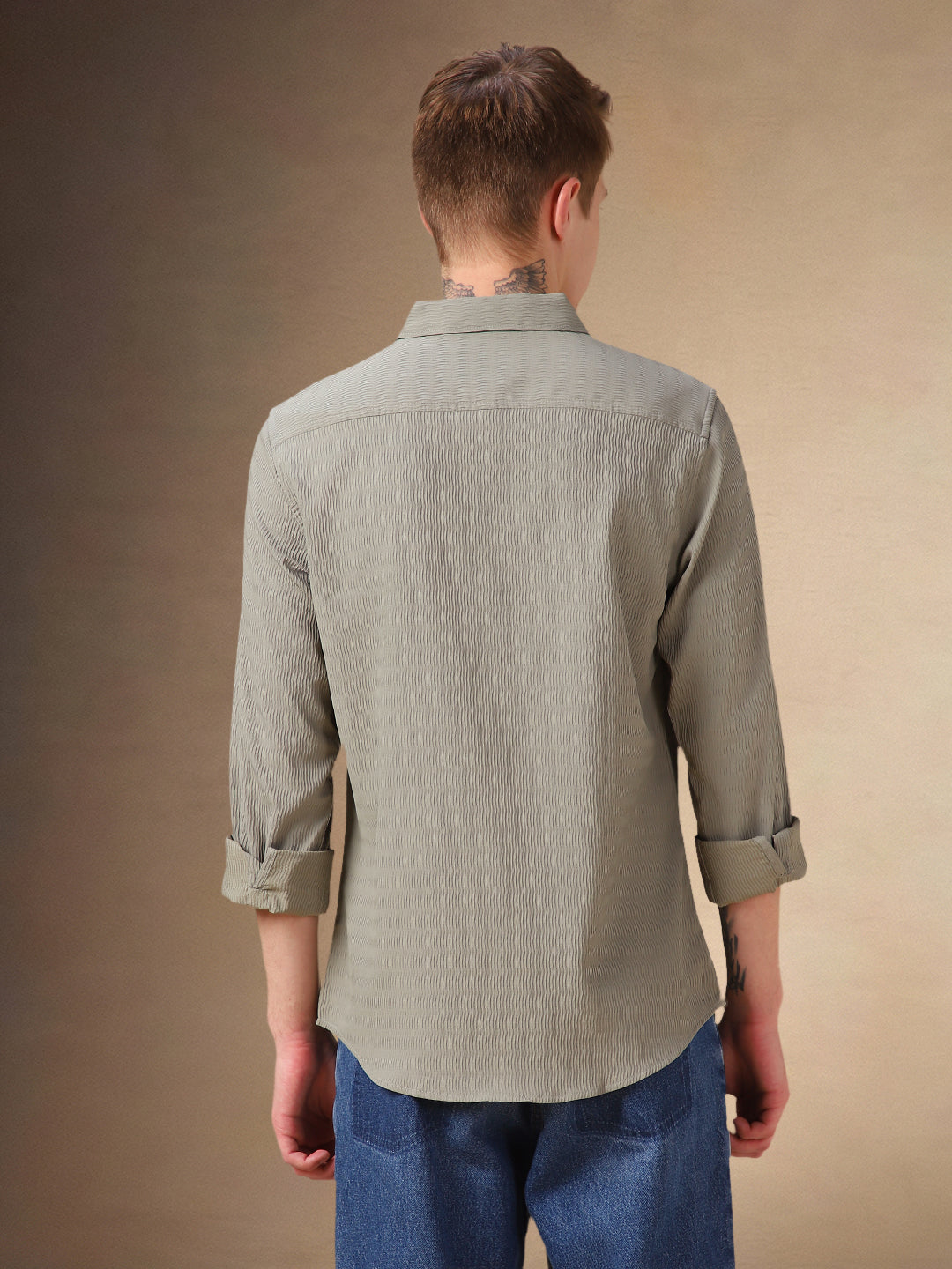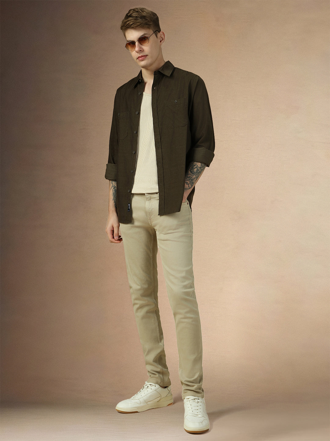 Men's Khaki Solid Textured Spread Collar Full Sleeves Shirt