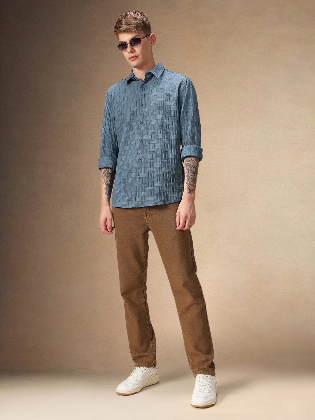 Men's Blue Solid Textured Spread Collar Full Sleeves Shirt