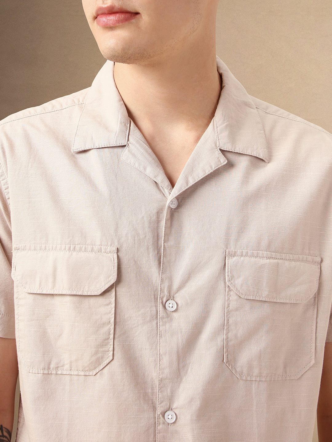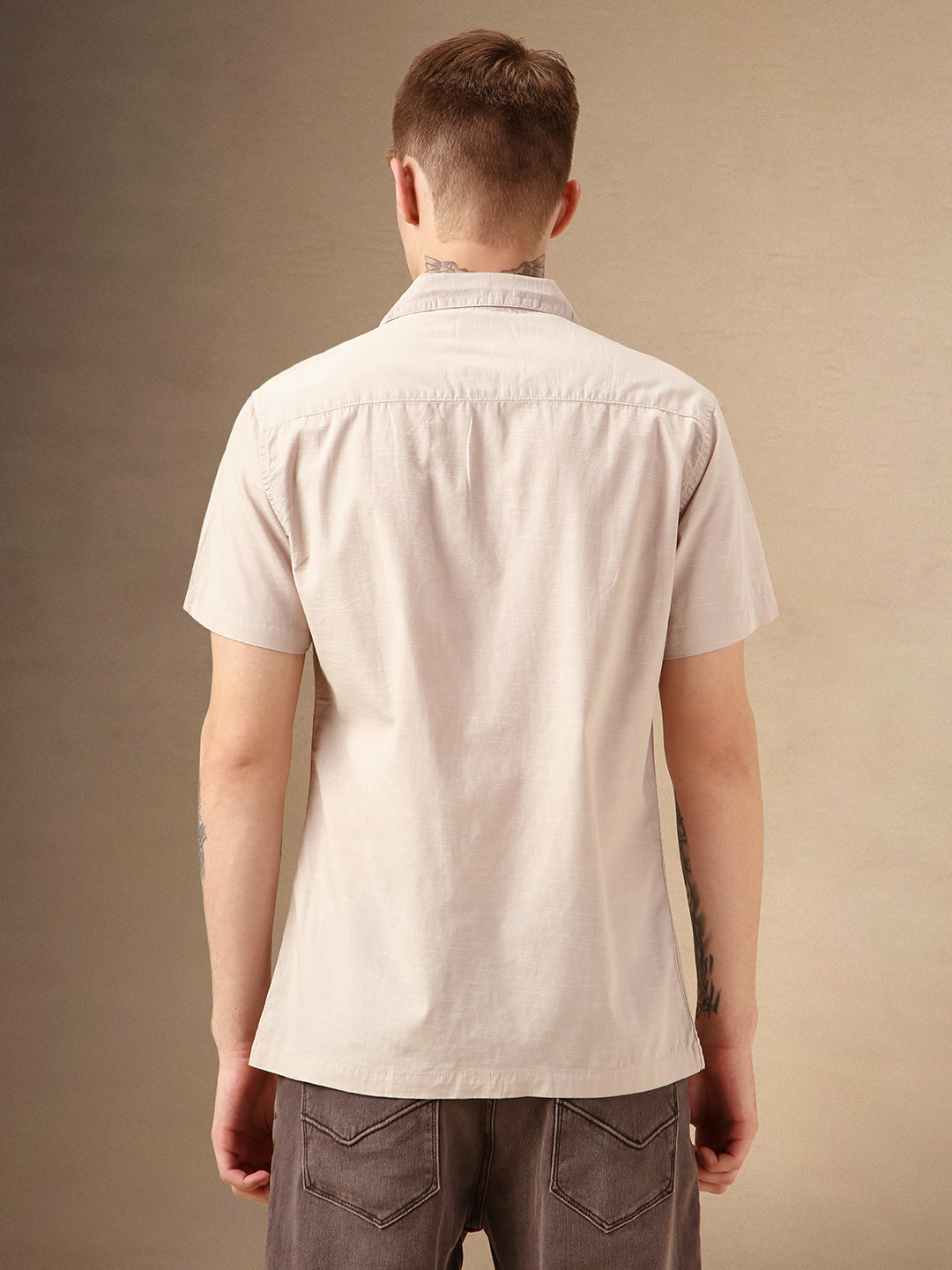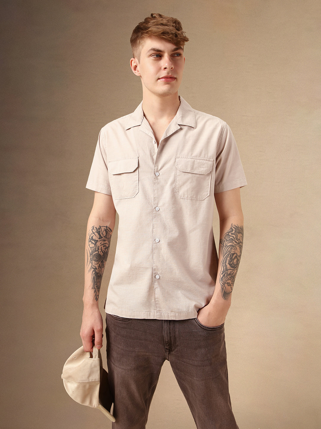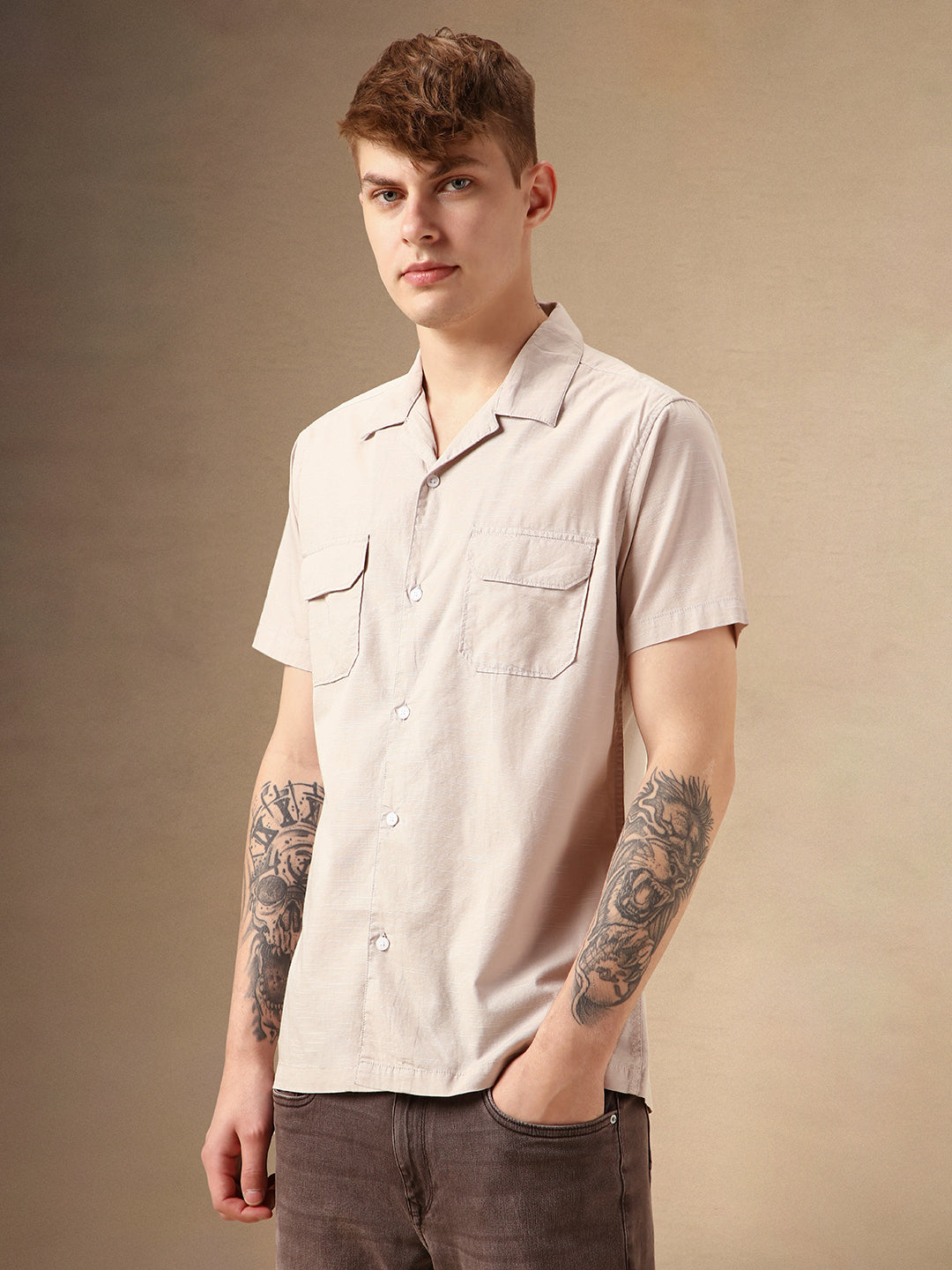 Men's Beige Solid Cuban Collar Half Sleeves Cotton Casual Shirt