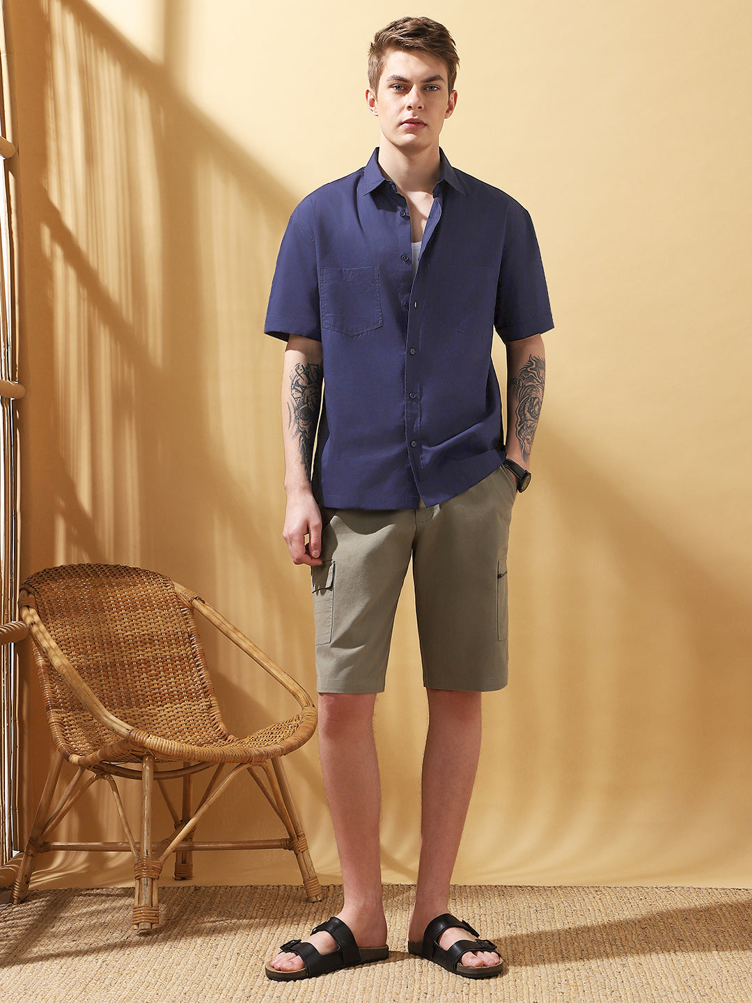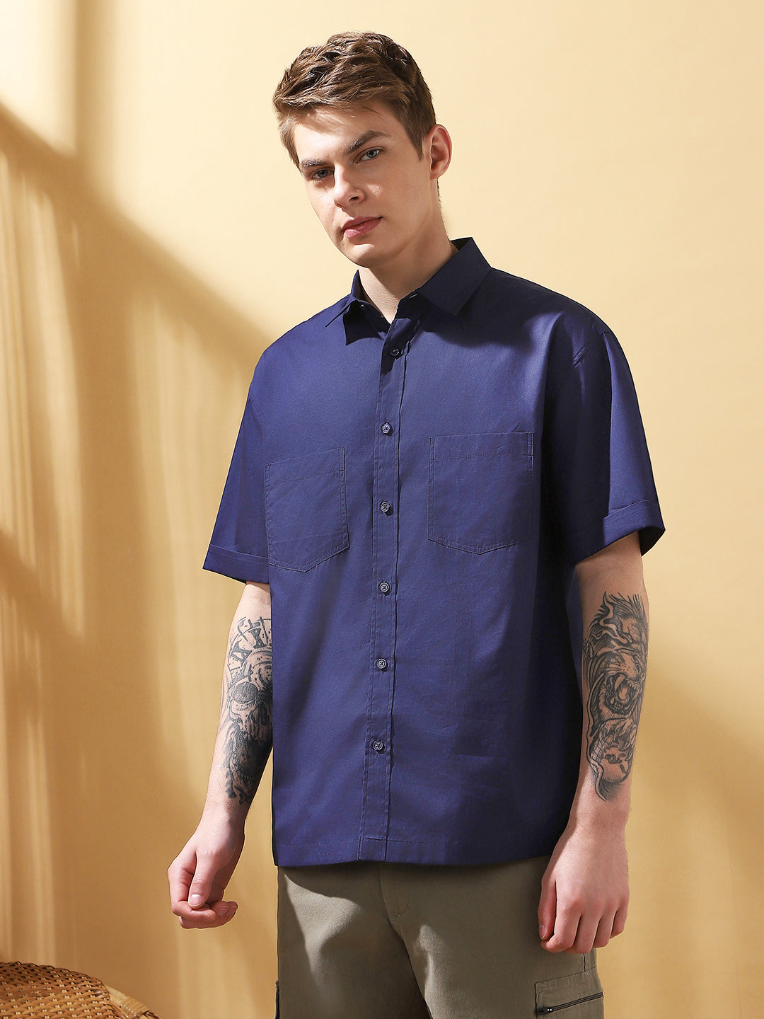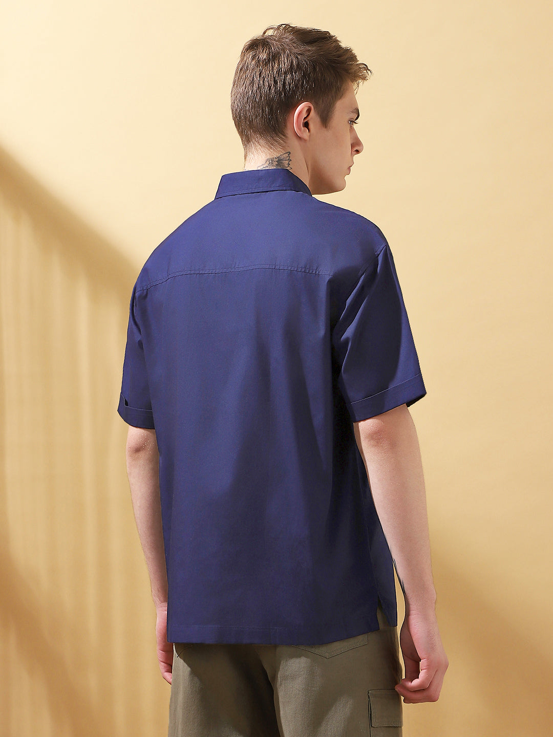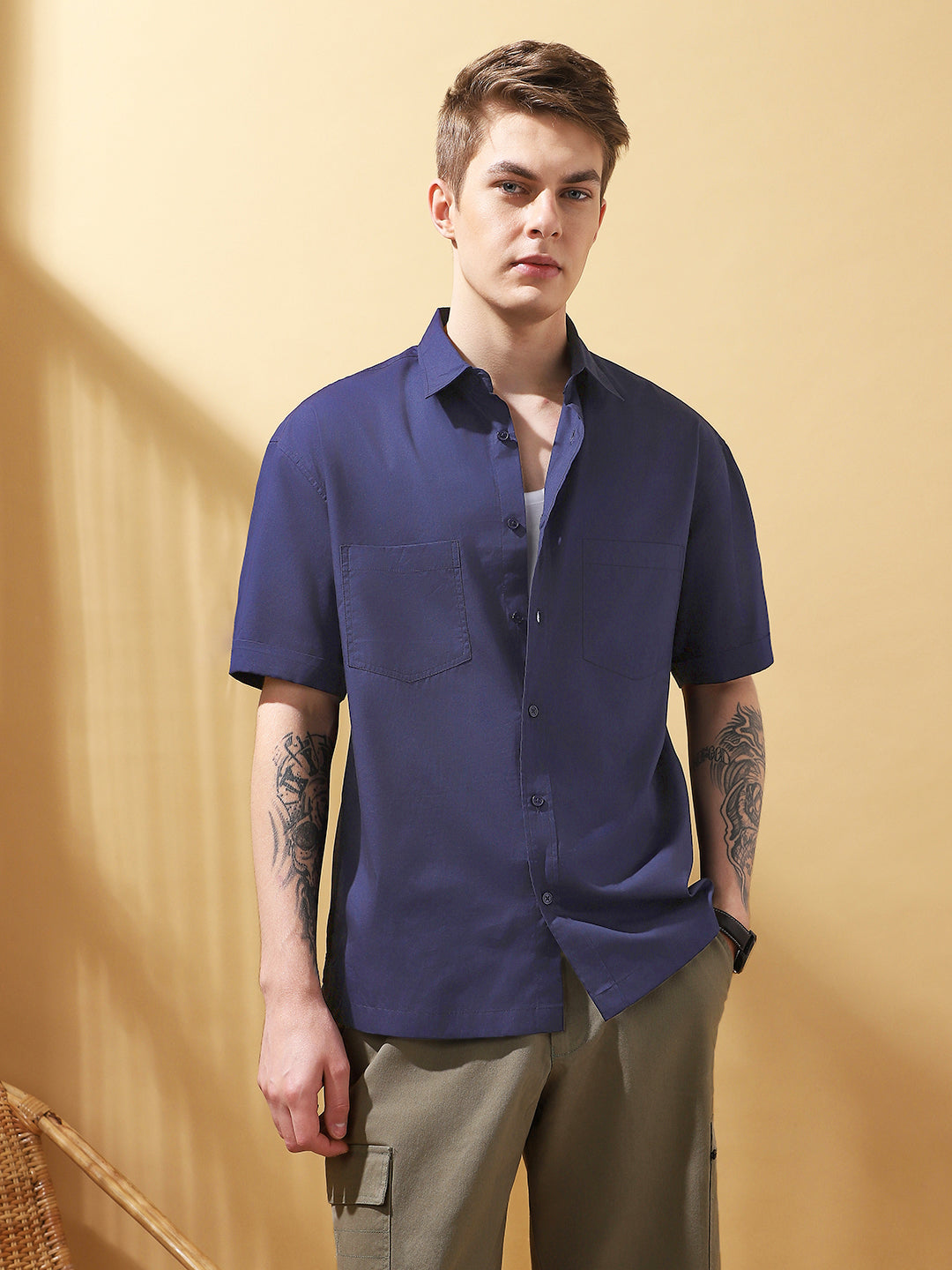 Men's Navy Blue Solid Spread Collar Half Sleeves Casual Shirt