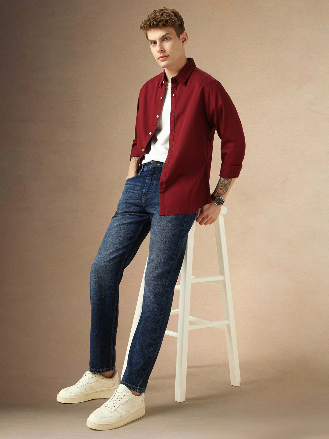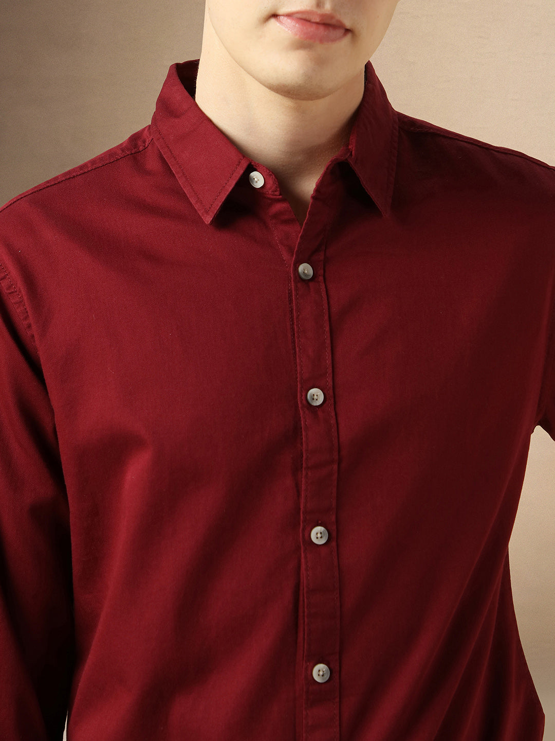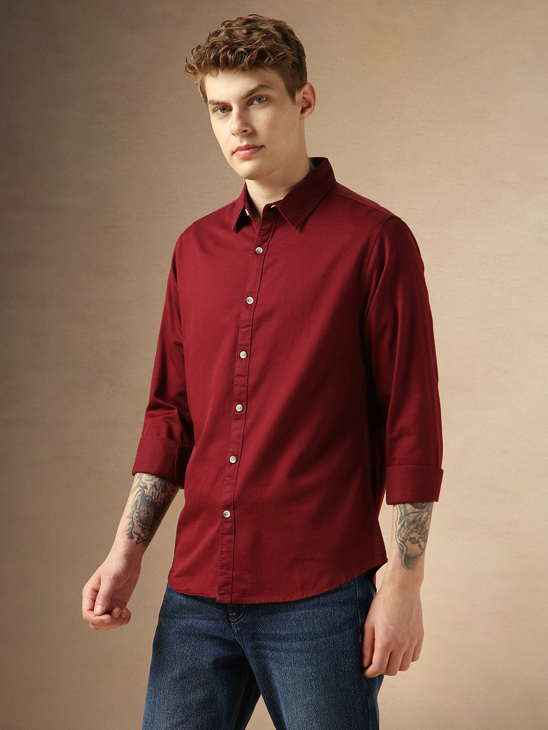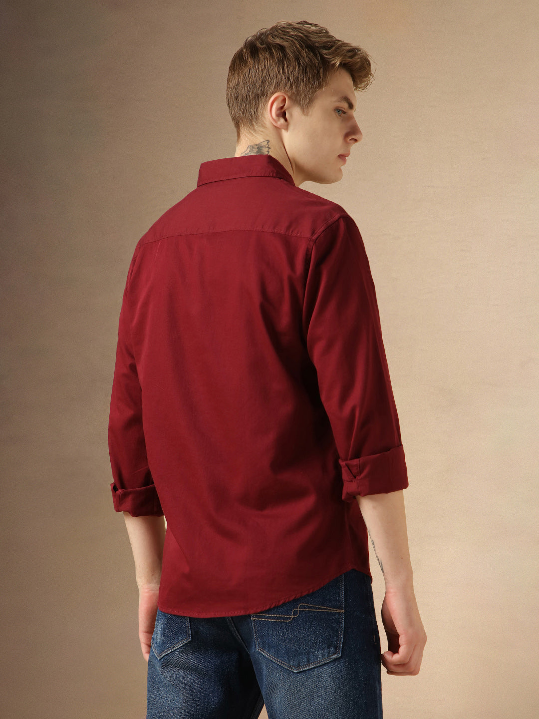 Men's Maroon Solid Spread Collar Long Sleeves Regular Fit Casual Shirt