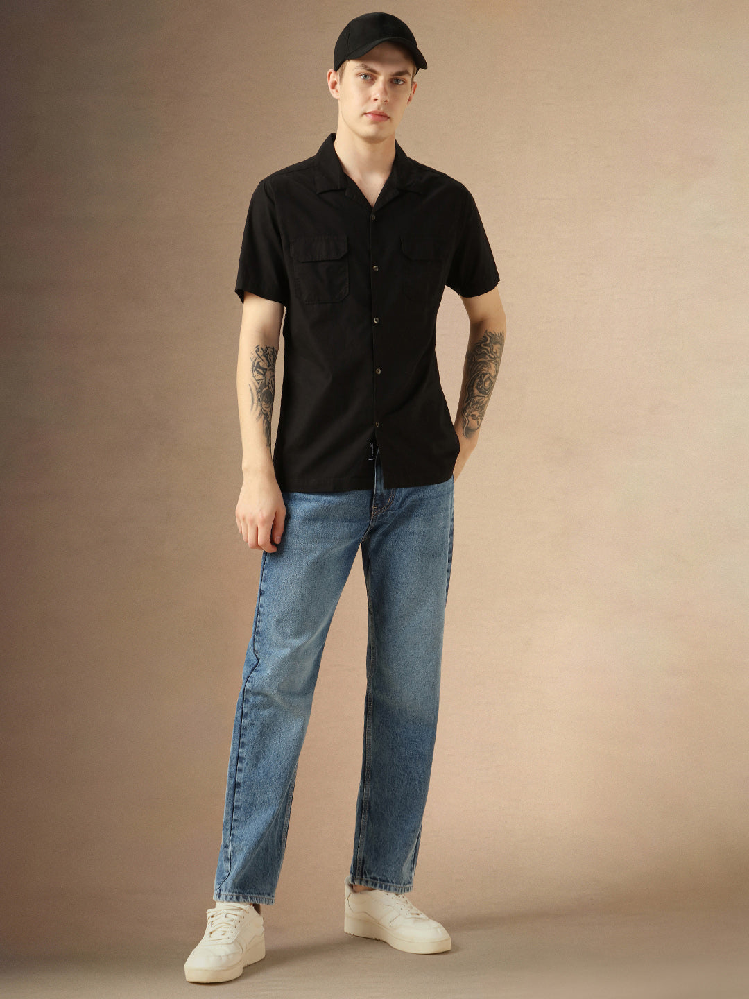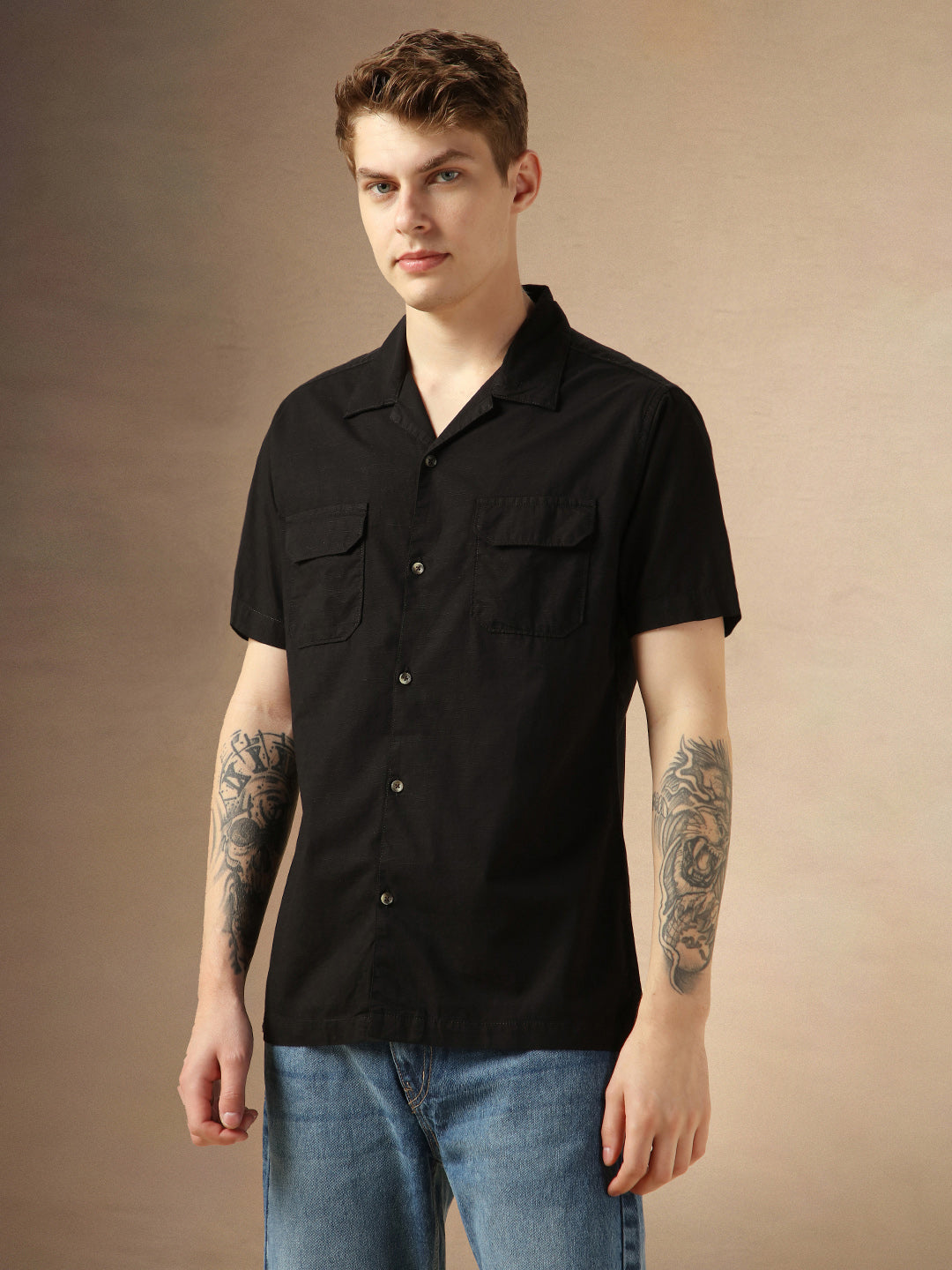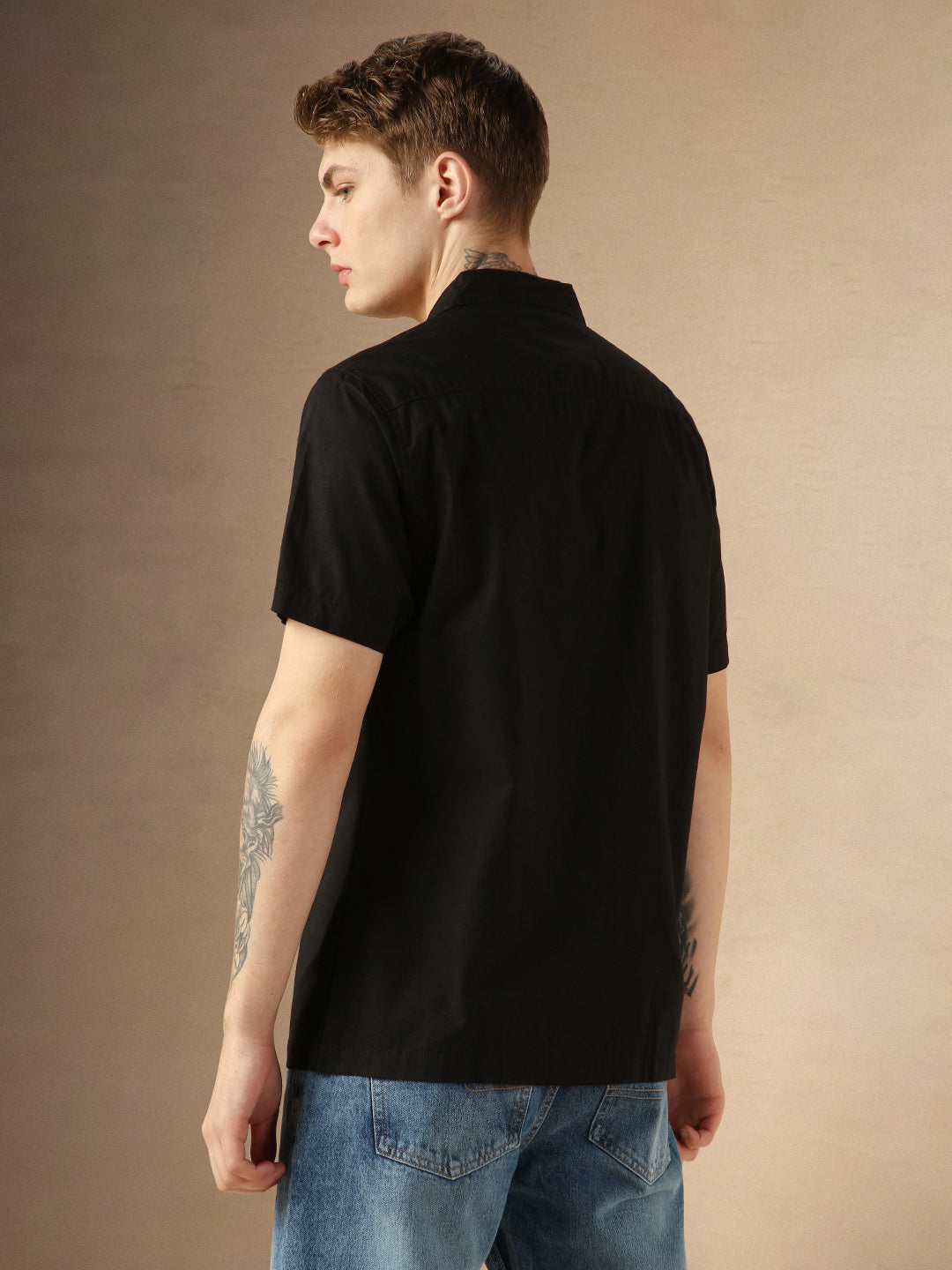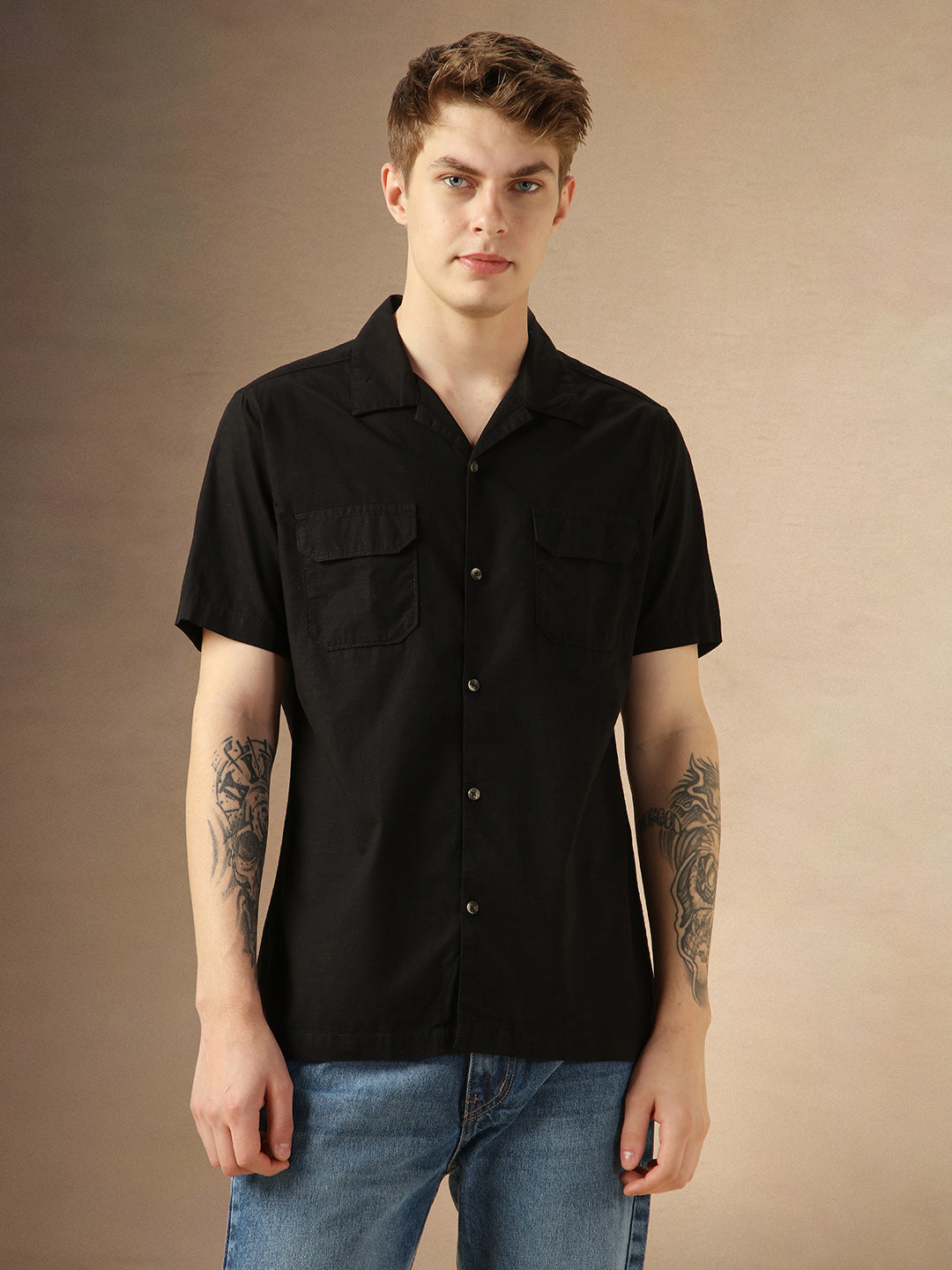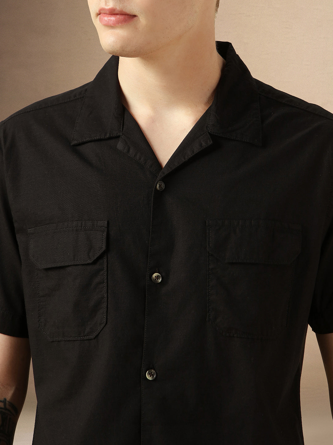 Men's Black Solid Cuban Collar Short Sleeves Relaxed Fit Casual Shirt