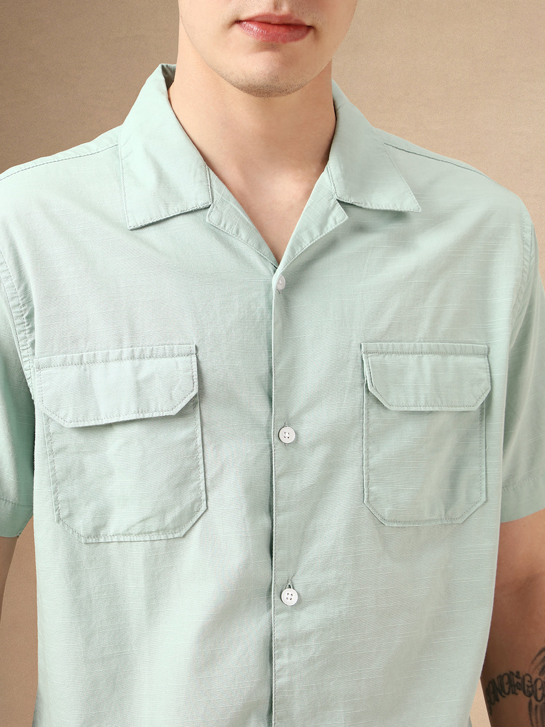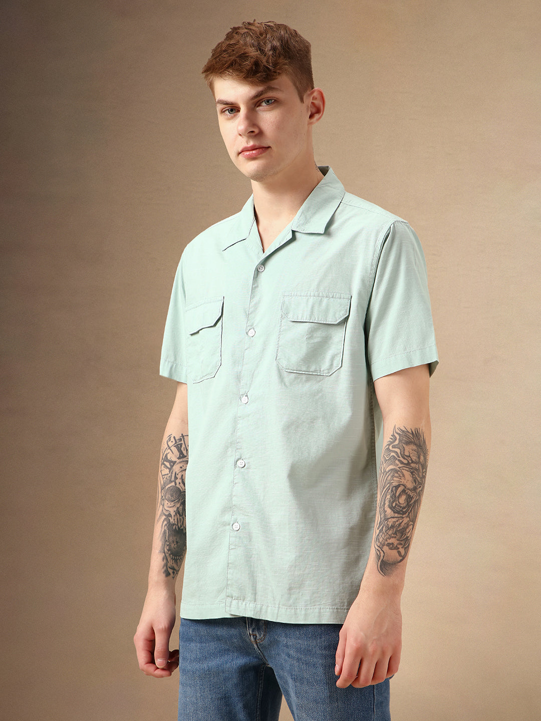 Men's Green Solid Cuban Collar Short Sleeves Relaxed Fit Casual Shirt