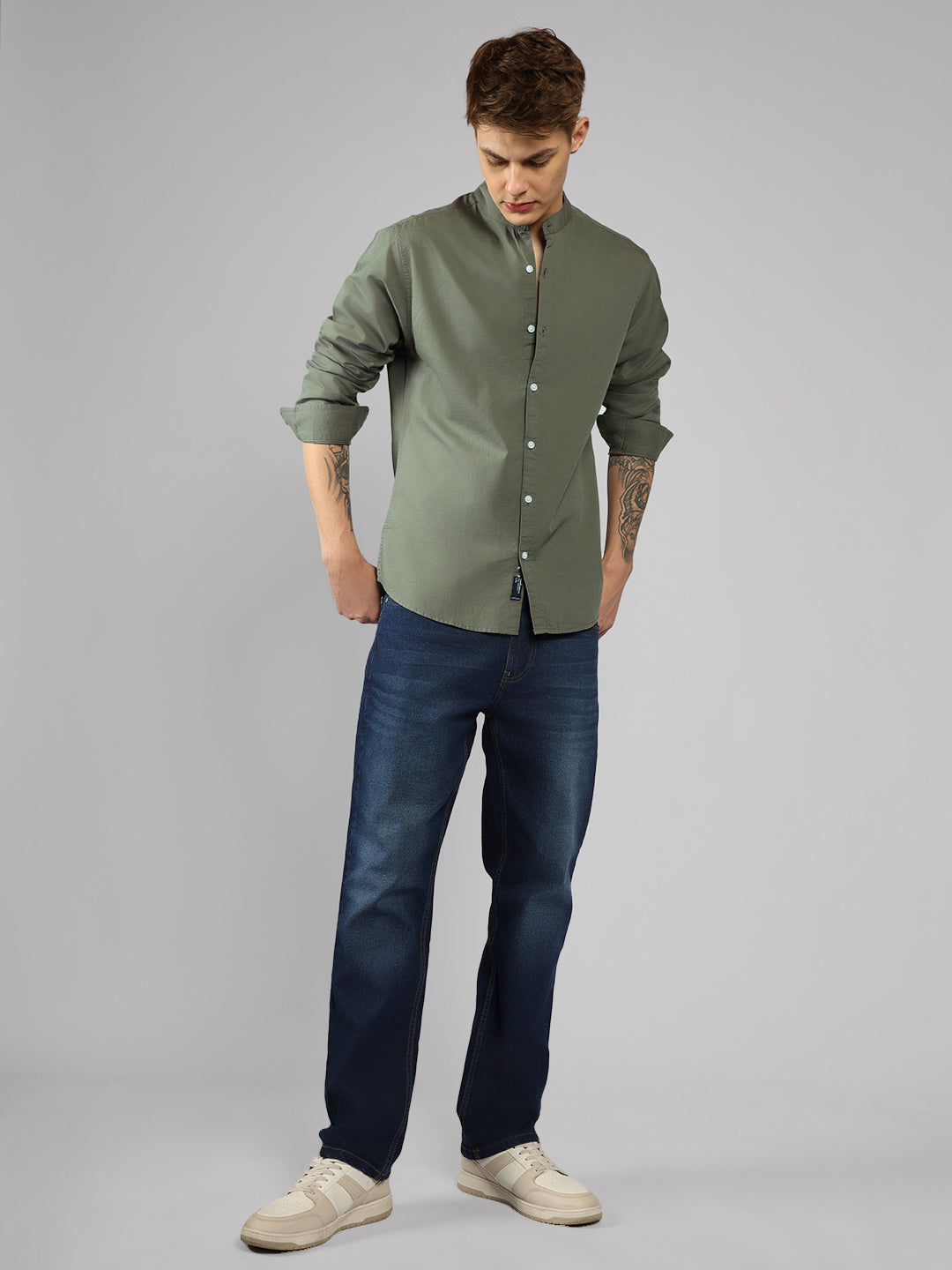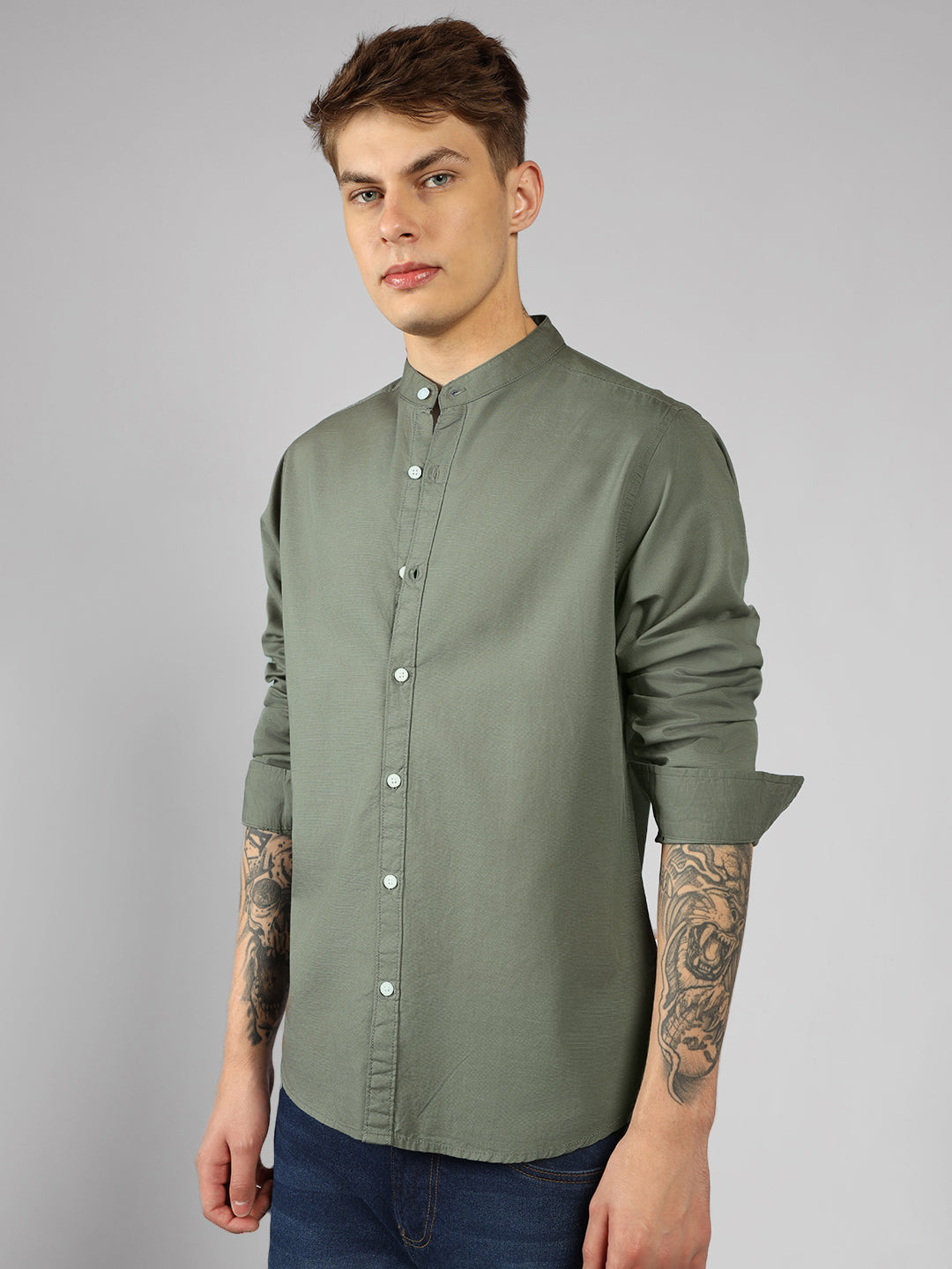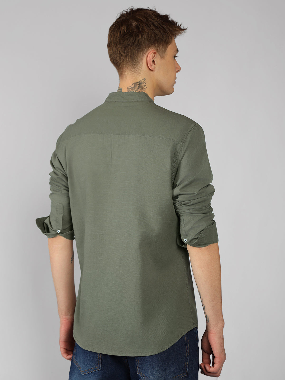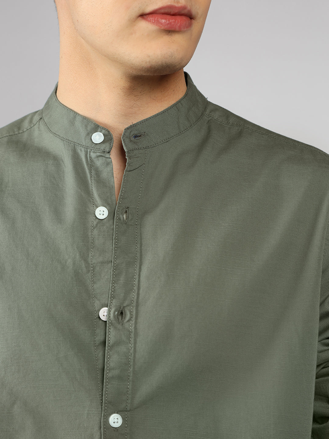 Men's Olive Solid Mandarin Collar Full sleeve Regular Shirt