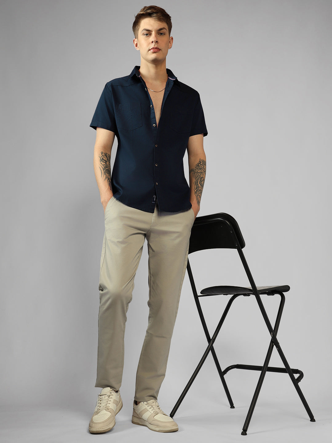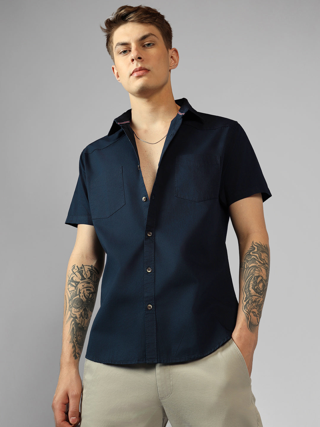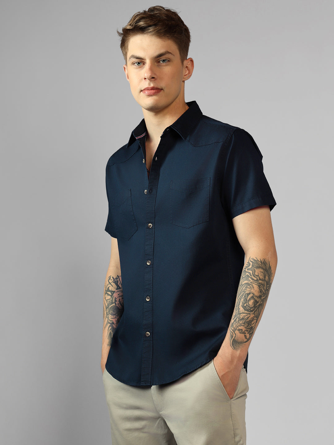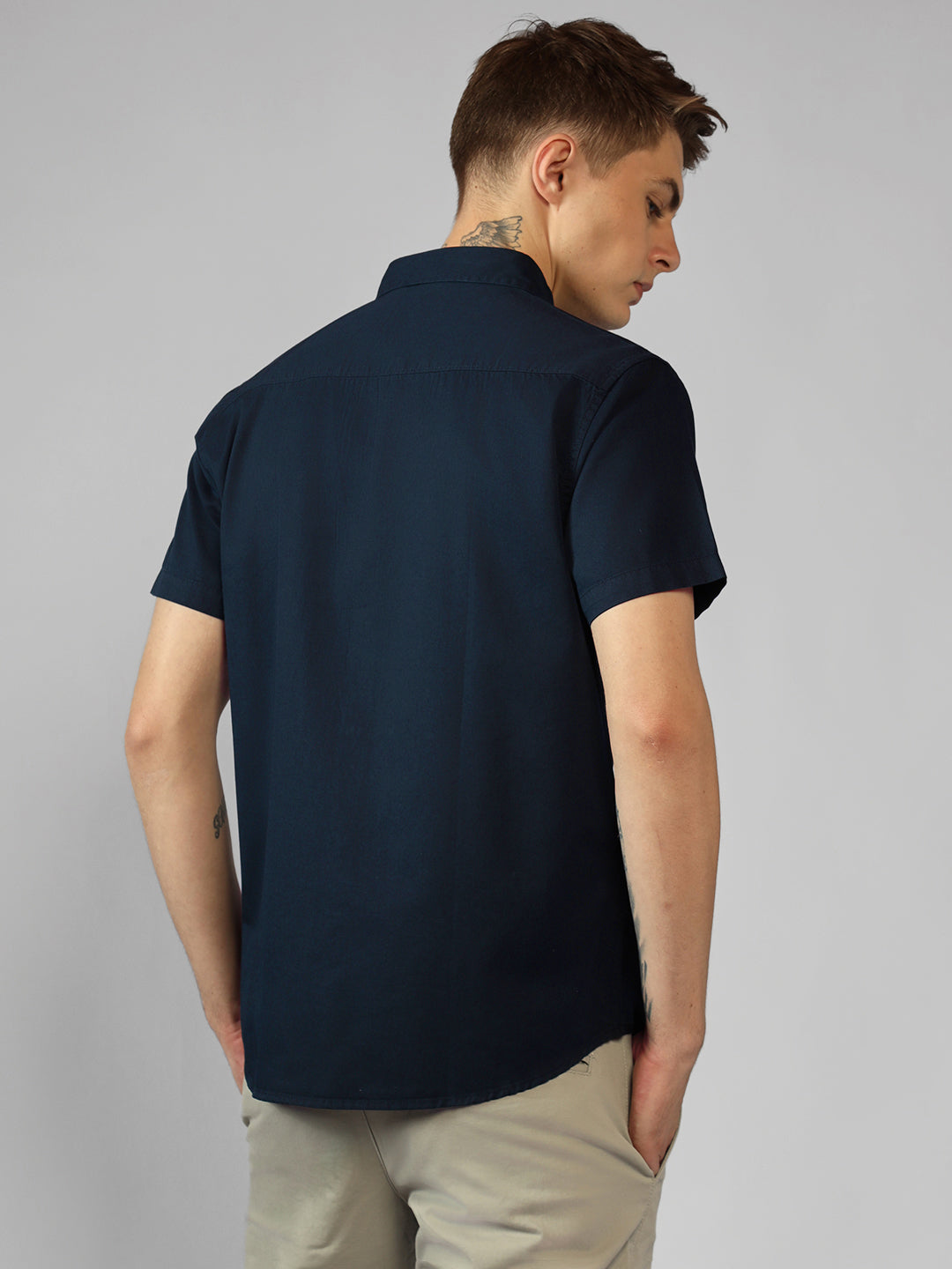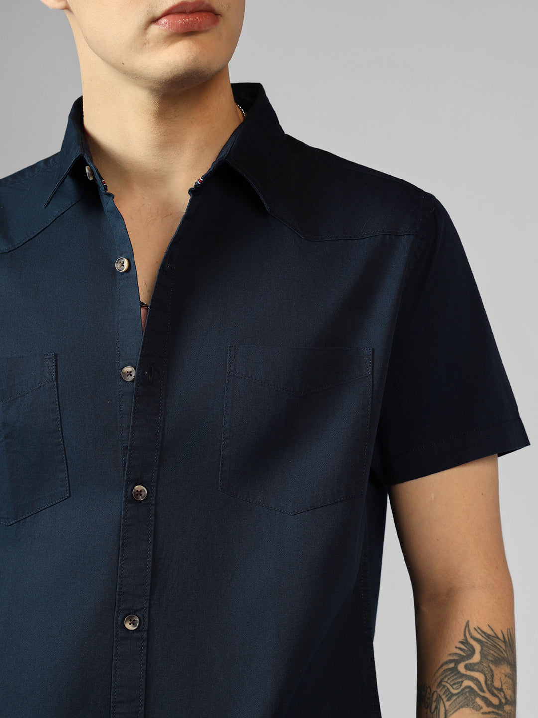 Men's Navy Blue Solid Spread Collar Short Sleeves Relaxed Fit Casual Shirt