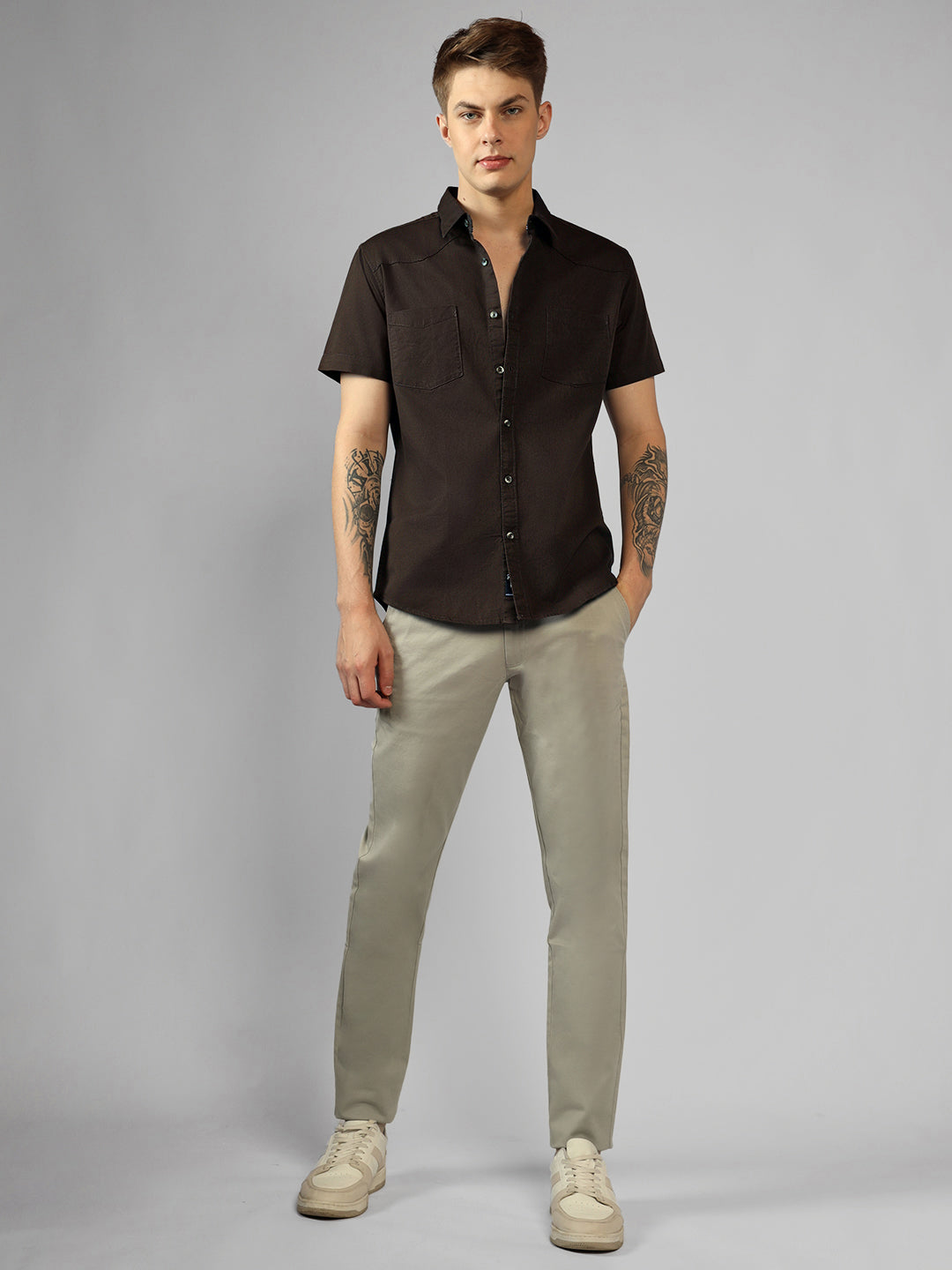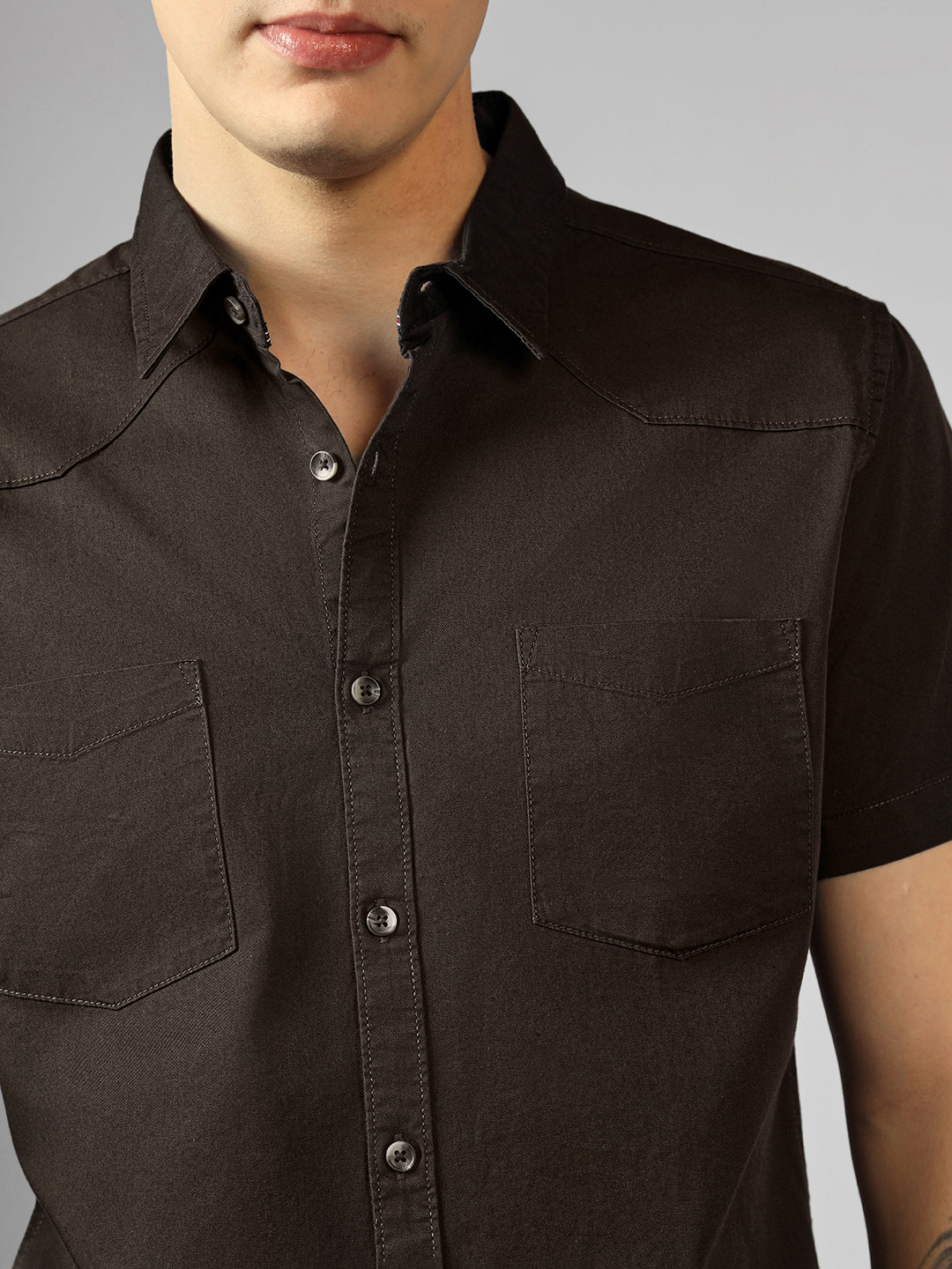 Men's Brown Solid Spread Collar Short Sleeves Regular Fit Casual Shirt